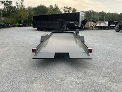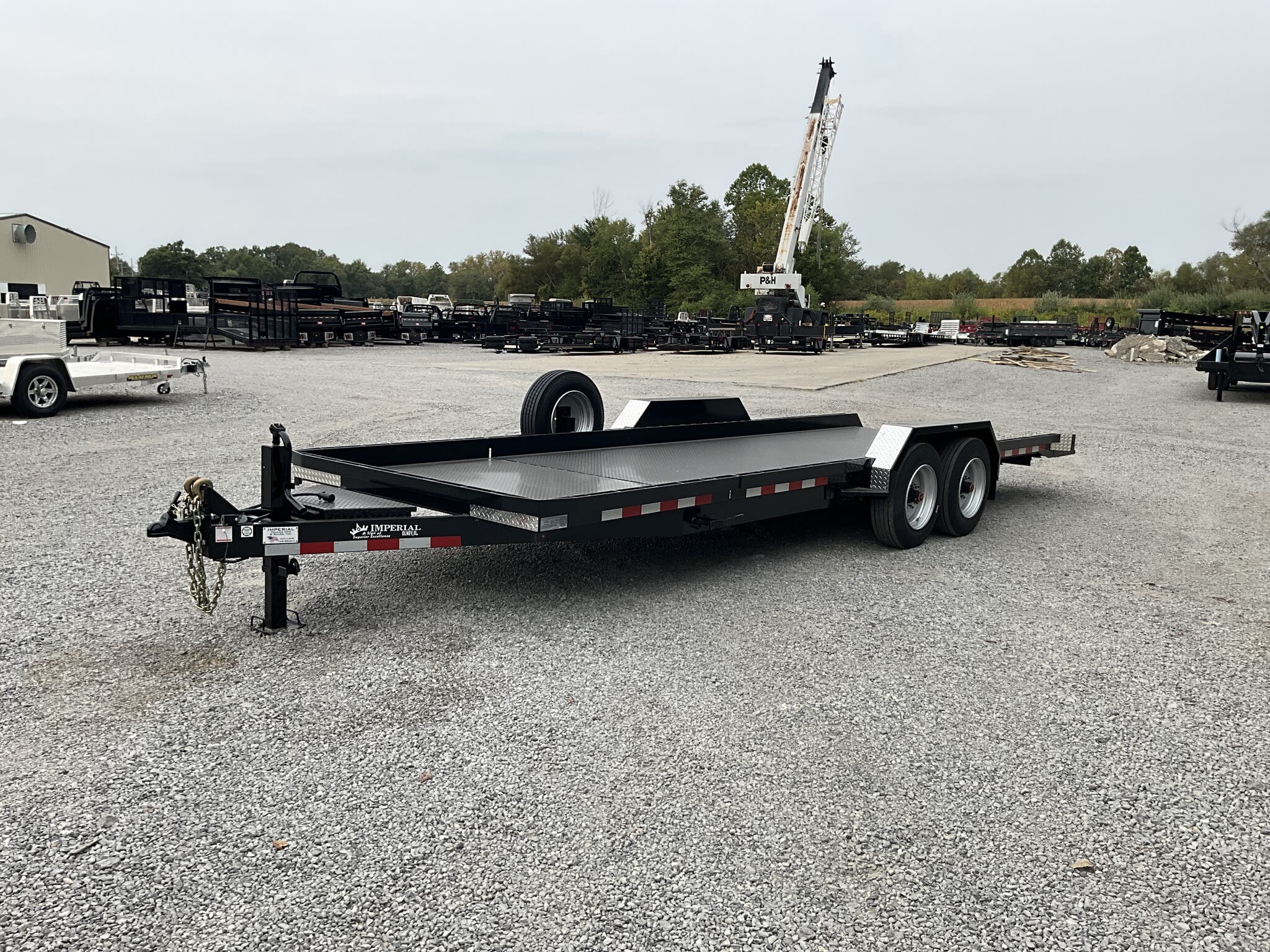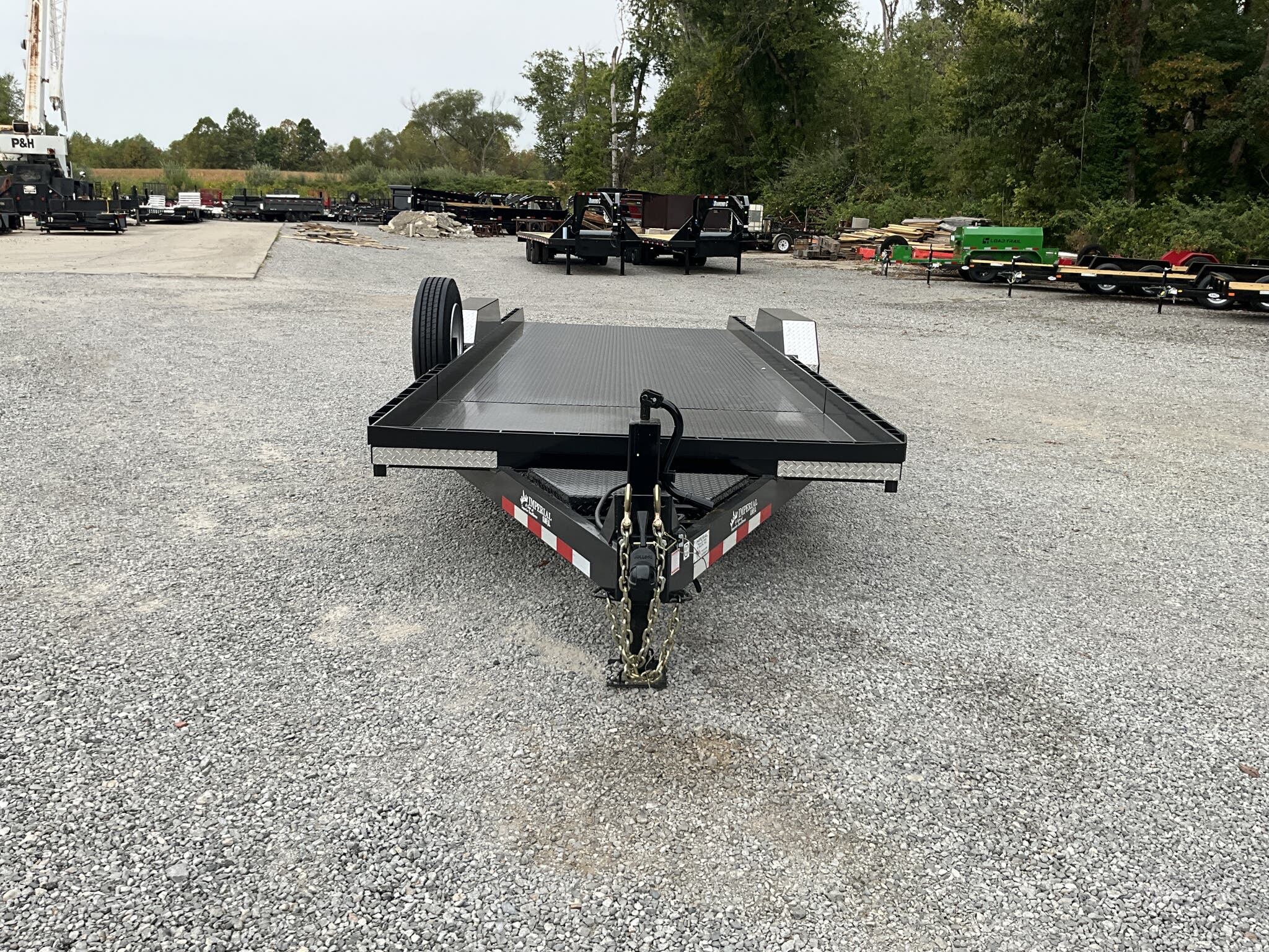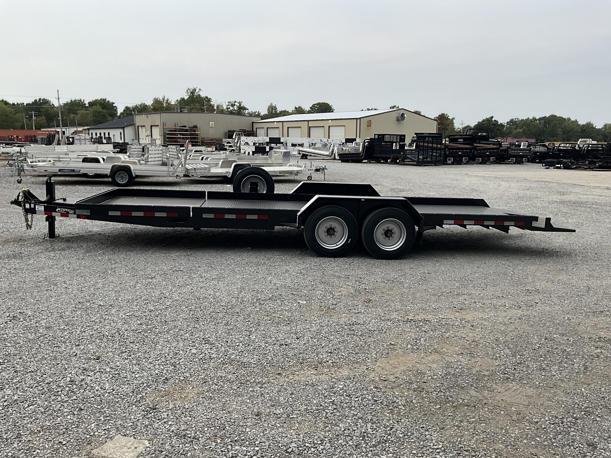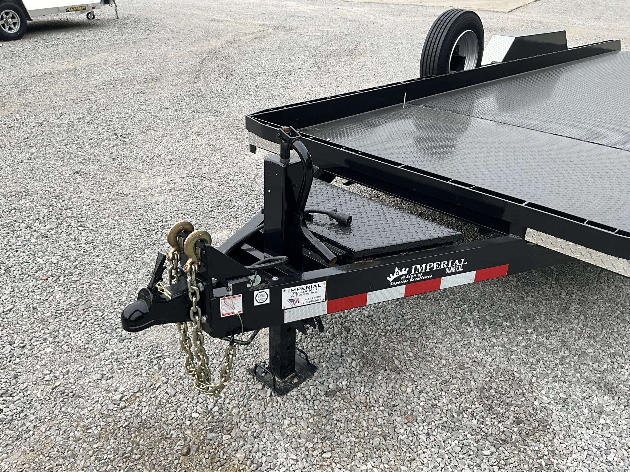 IMPERIAL 22' SPLIT DECK TILT TRAILER FOR SALE, 18' TILT SECTION / 4' FRONT STATIONARY, 82" WIDE DECK, 2-8K ELECTRIC BRAKE AXLES, SPRING SUSPENSION, LT215-75-R17.5" RADIAL 16 PLY TIRES, SPARE TIRE AND MOUNT, 1/8" TREADPLATE STEEL FLOOR, HYDRAULIC CUSHION TILT CYLINDER, 12" ON CENTER CROSSMEMBERS, HEAVY DUTY TREADPLATE FENDERS, 12K DROP LEG JACK, 2-5/16" COUPLER, FRONT TOOLBOX, STAKE POCKETS AND TIE RAILS, 2 COATS PRIMER, 2 COATS BLACK PAINT, WIRING IN CONDUIT, LED LIGHTS.
