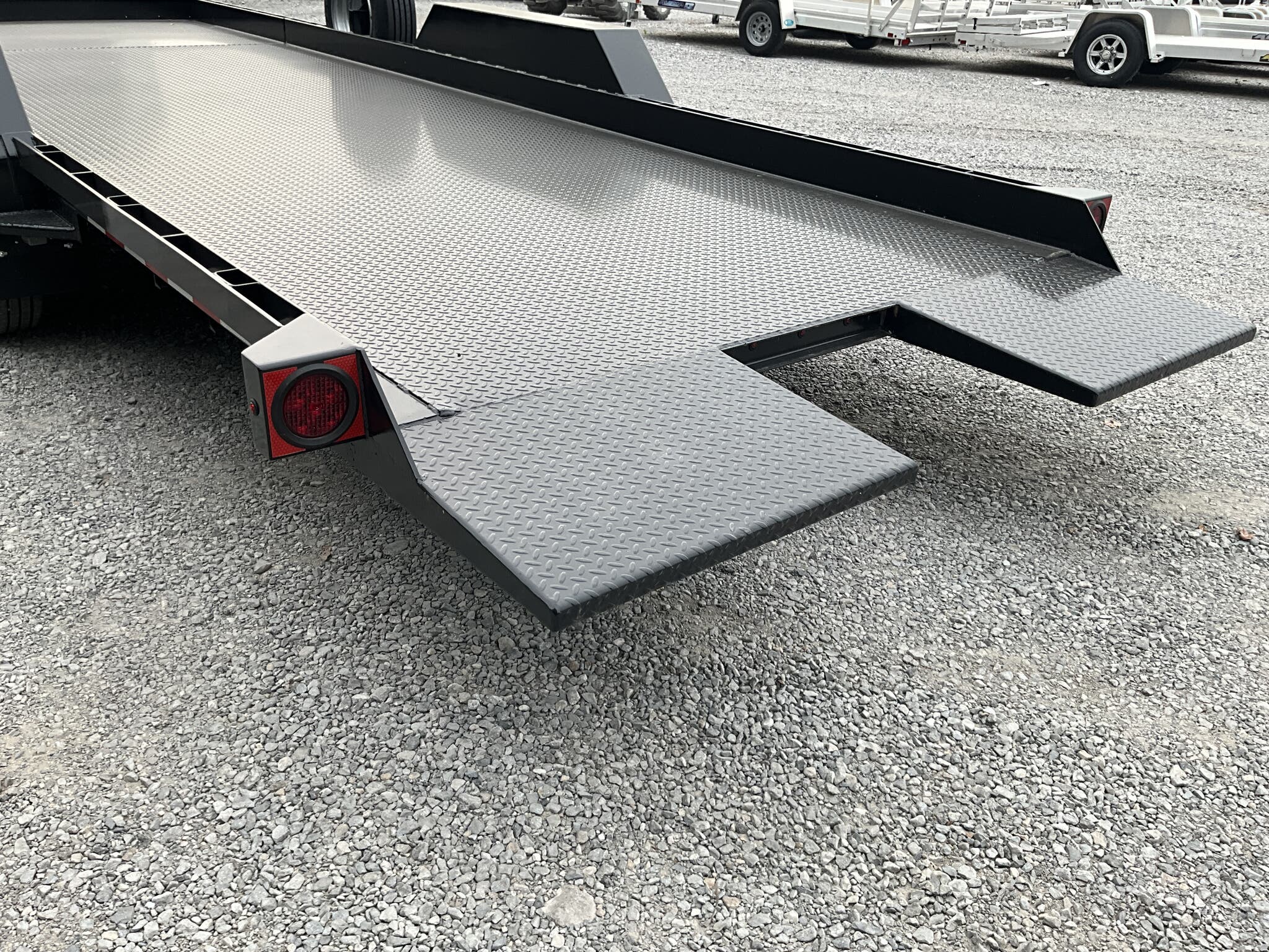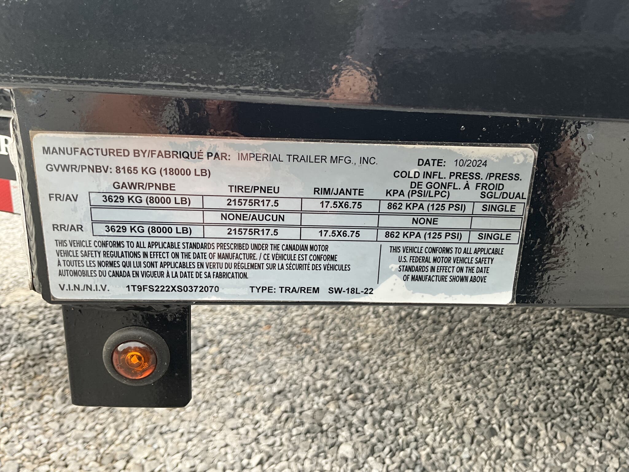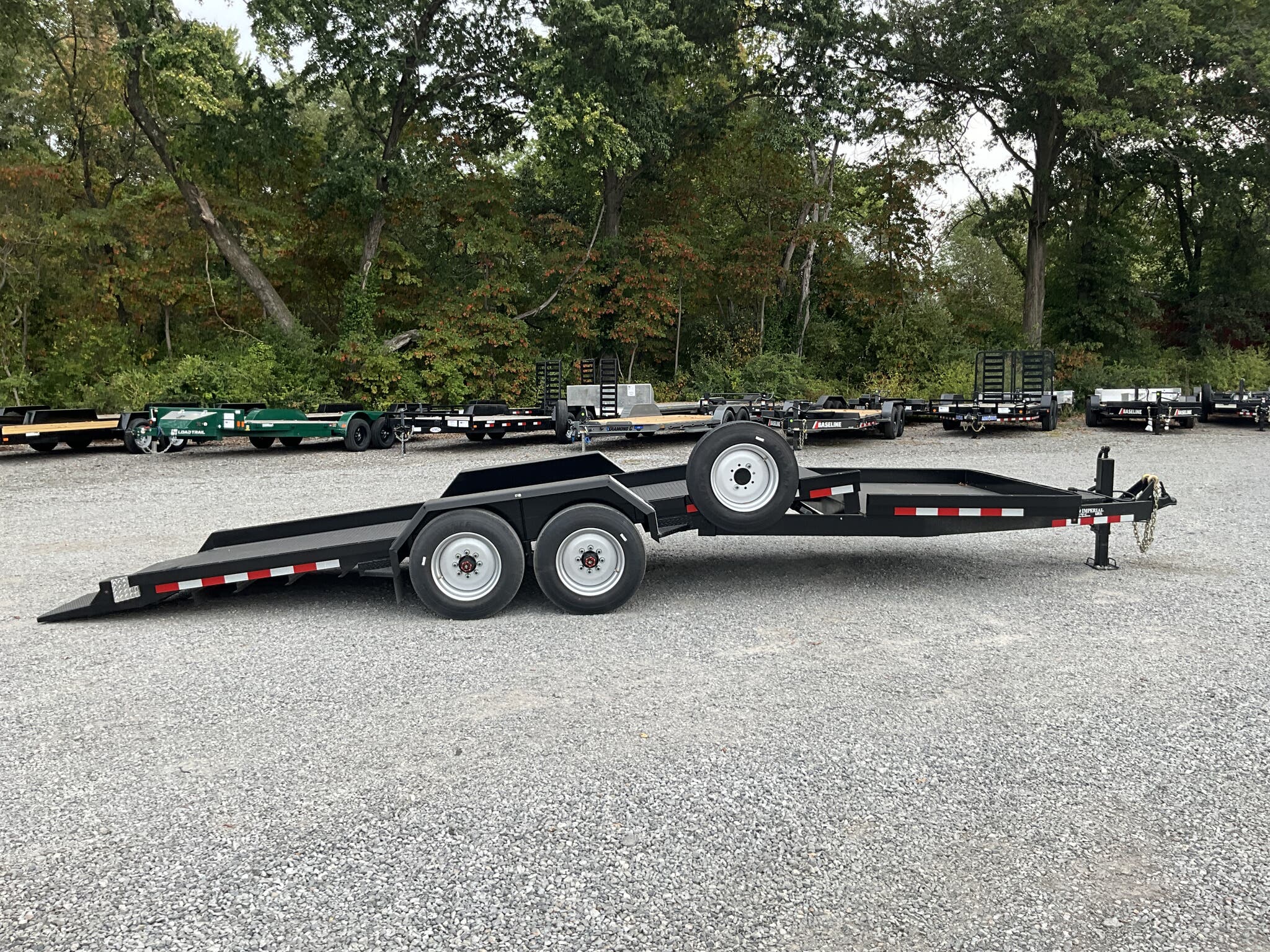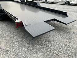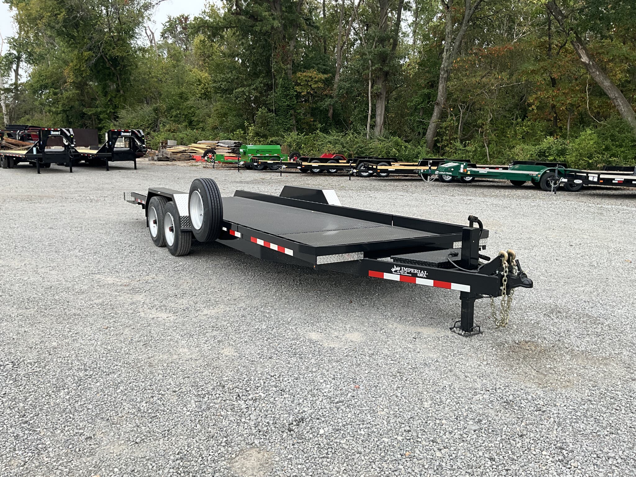 IMPERIAL 22' SPLIT DECK TILT TRAILER FOR SALE, 18' TILT SECTION / 4' FRONT STATIONARY, 82" WIDE DECK, 2-8K ELECTRIC BRAKE AXLES, SPRING SUSPENSION, LT215-75-R17.5" RADIAL 16 PLY TIRES, SPARE TIRE AND MOUNT, 1/8" TREADPLATE STEEL FLOOR, HYDRAULIC CUSHION TILT CYLINDER, 12" ON CENTER CROSSMEMBERS, HEAVY DUTY TREADPLATE FENDERS, 12K DROP LEG JACK, 2-5/16" COUPLER, FRONT TOOLBOX, STAKE POCKETS AND TIE RAILS, 2 COATS PRIMER, 2 COATS BLACK PAINT, WIRING IN CONDUIT, LED LIGHTS.