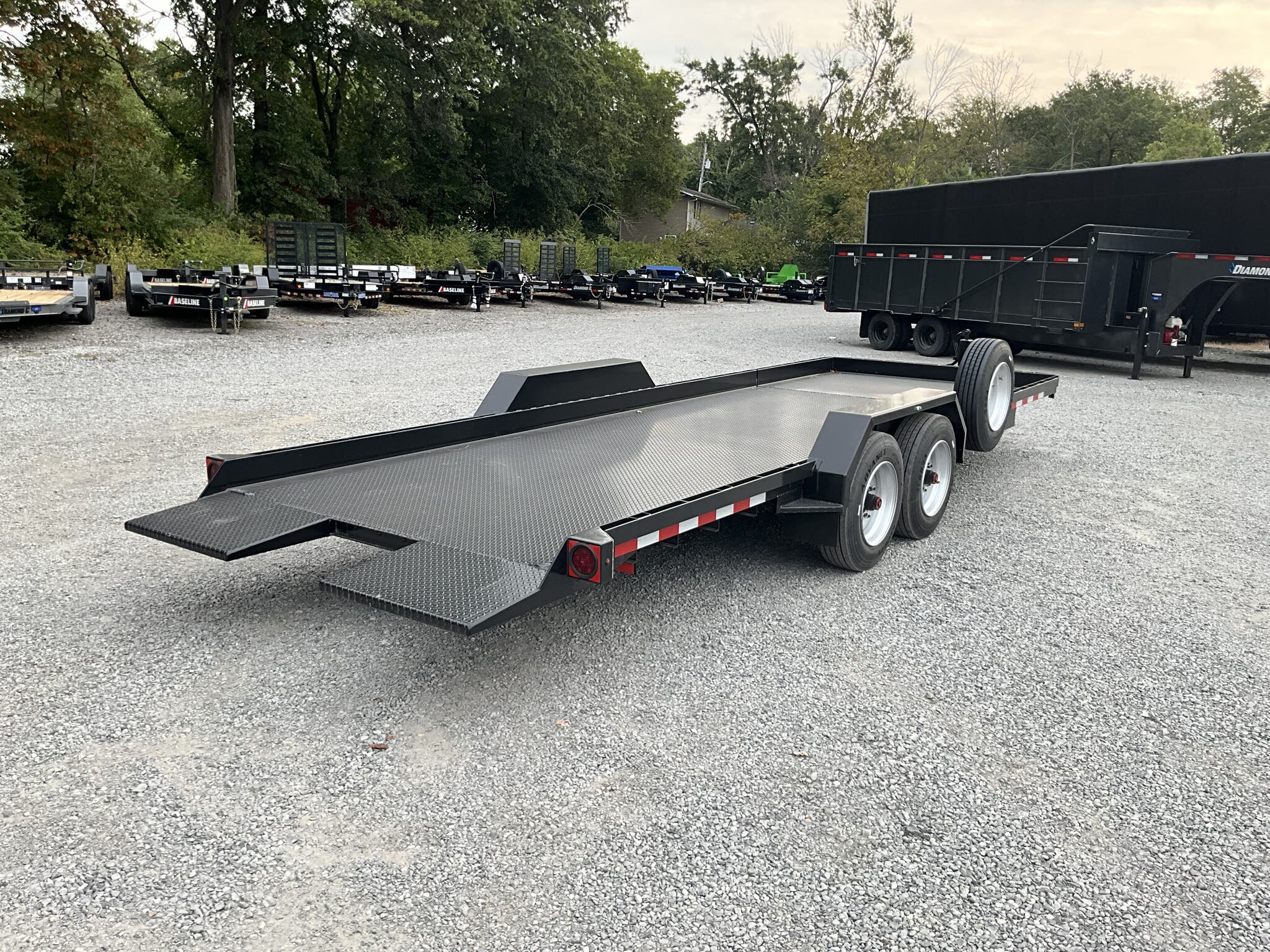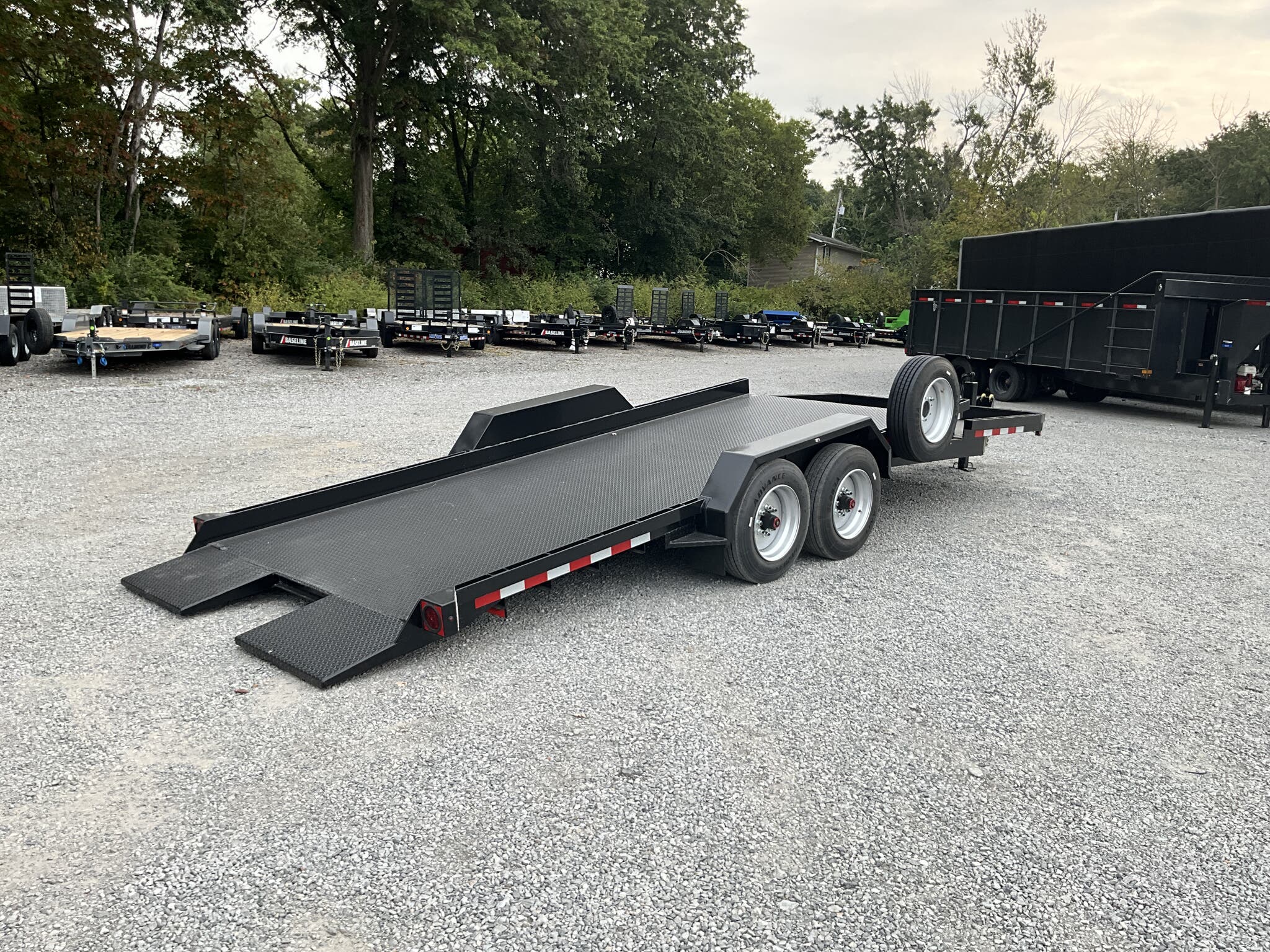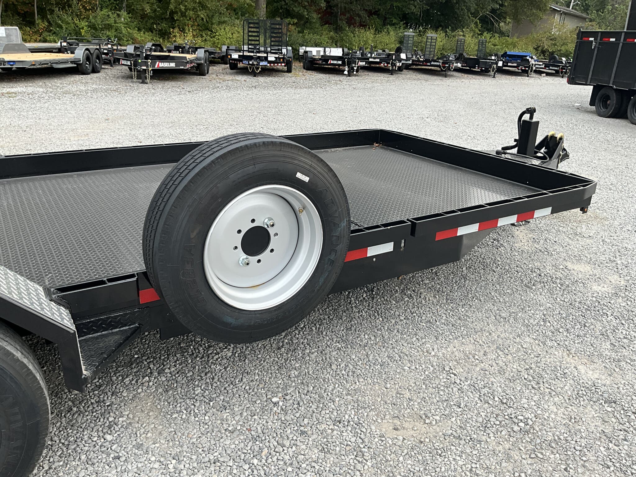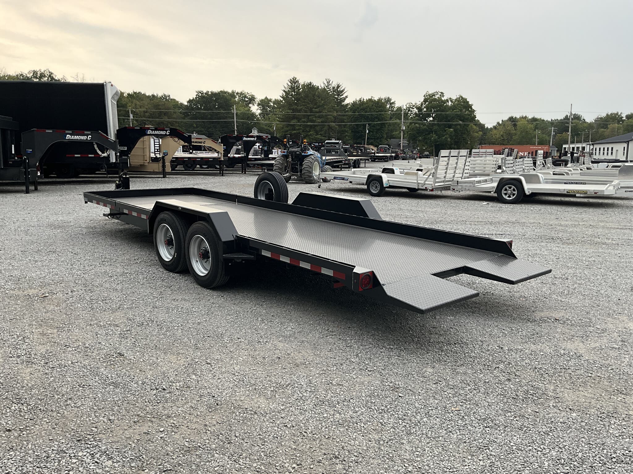 IMPERIAL 22' SPLIT DECK TILT TRAILER FOR SALE, 18' TILT SECTION / 4' FRONT STATIONARY, 82" WIDE DECK, 2-8K ELECTRIC BRAKE AXLES, SPRING SUSPENSION, LT215-75-R17.5" RADIAL 16 PLY TIRES, SPARE TIRE AND MOUNT, 1/8" TREADPLATE STEEL FLOOR, HYDRAULIC CUSHION TILT CYLINDER, 12" ON CENTER CROSSMEMBERS, HEAVY DUTY TREADPLATE FENDERS, 12K DROP LEG JACK, 2-5/16" COUPLER, FRONT TOOLBOX, STAKE POCKETS AND TIE RAILS, 2 COATS PRIMER, 2 COATS BLACK PAINT, WIRING IN CONDUIT, LED LIGHTS.