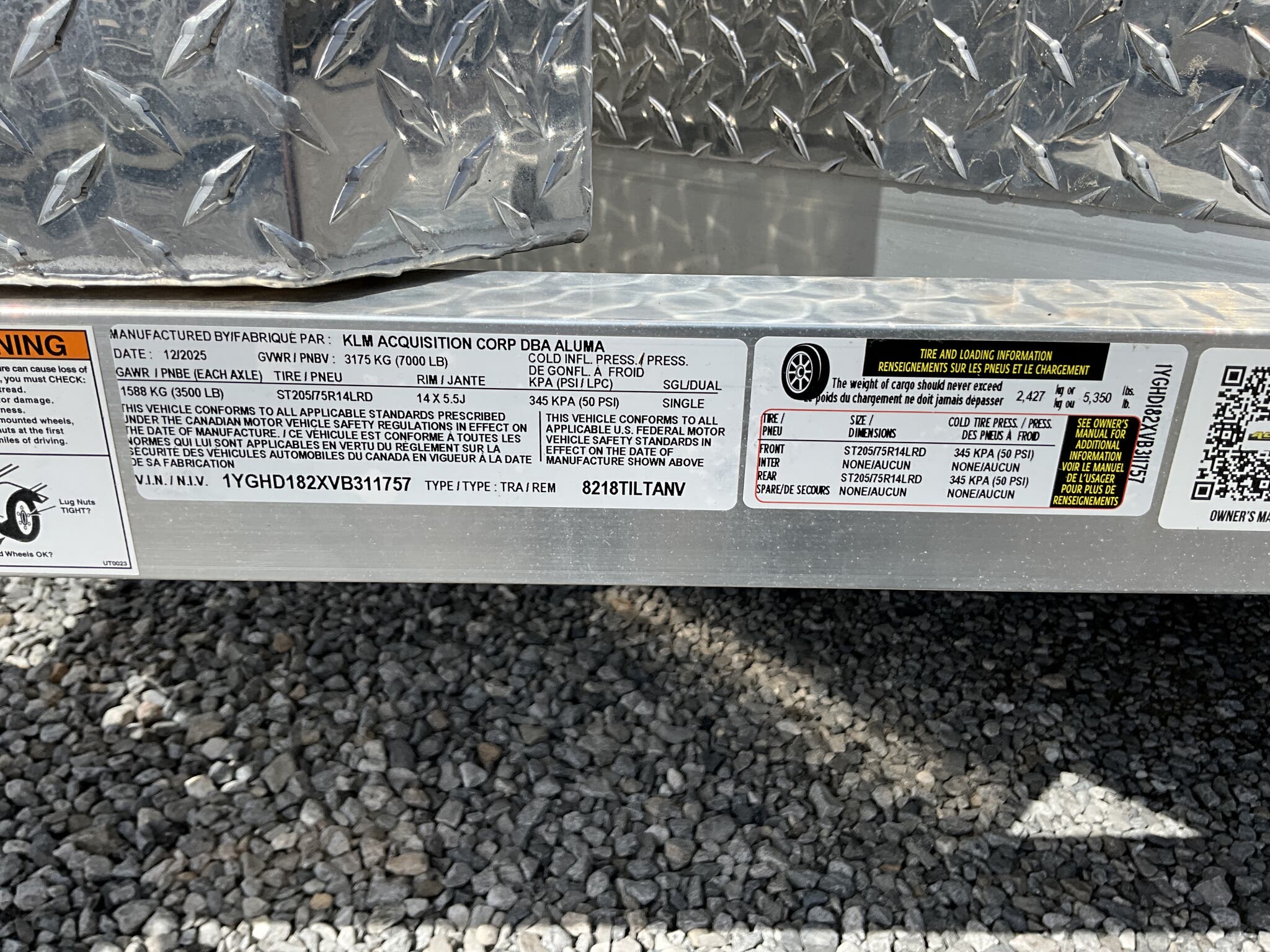 2026 ALUMA 8218ANV TILT TA EL R RTD 6'10" 18' ALL ALUMINUM TILT TANDEM AXLE TRAILER FOR SALE IN MOUNT VERNON, IL 62864 Feature: Hydraulic tilt deck with adjustable descent control for easy equipment loading Feature: Electric brakes with breakaway kit for improved towing safety Feature: Extruded aluminum floor for corrosion resistance and durability Feature: Multiple stake pockets and recessed tie rings for secure equipment transport Specs Model: Aluma 8218ANV TILT TA EL R RTD Specs Size: 6'10" 18' (81" 219") Specs Construction: All aluminum trailer construction (excluding axle & coupler) Specs Deck: Extruded aluminum plank flooring Specs Tilt System: Hydraulic tilt bed with control valve and travel locks Specs Axles/Brakes: (2) 3,500 lb rubber torsion axles with electric brakes and breakaway kit Specs Axle Service: Easy lube hubs Specs Tires/Wheels: ST205/75R14 radial trailer tires on aluminum wheels Specs Frame: Aluminum frame with front retaining rail Specs Coupler: 2 5/16" A frame coupler Specs Jack: 2,500 lb padded tongue jack Specs Tie Downs: (4) recessed stainless steel tie rings and (8) stake pockets Specs Fenders: Removable aluminum teardrop fenders Specs Lighting: LED lighting package with safety chains Specs Deck Angle: Approximately 8.5 tilt loading angle Specs Warranty: Aluma 5 year limited warranty (1 year commercial) Weights & Capacities Empty Trailer Weight: 1,475 lb Total Axle Capacity: 7,000 lb Estimated Payload Capacity: 5,525 lb Delivery from 62864 (Lower 48) Up to 100 miles $150 101 300 miles $2.00/mile 301 1200 miles $3.00/mile Over 1200 miles $4.00/mile