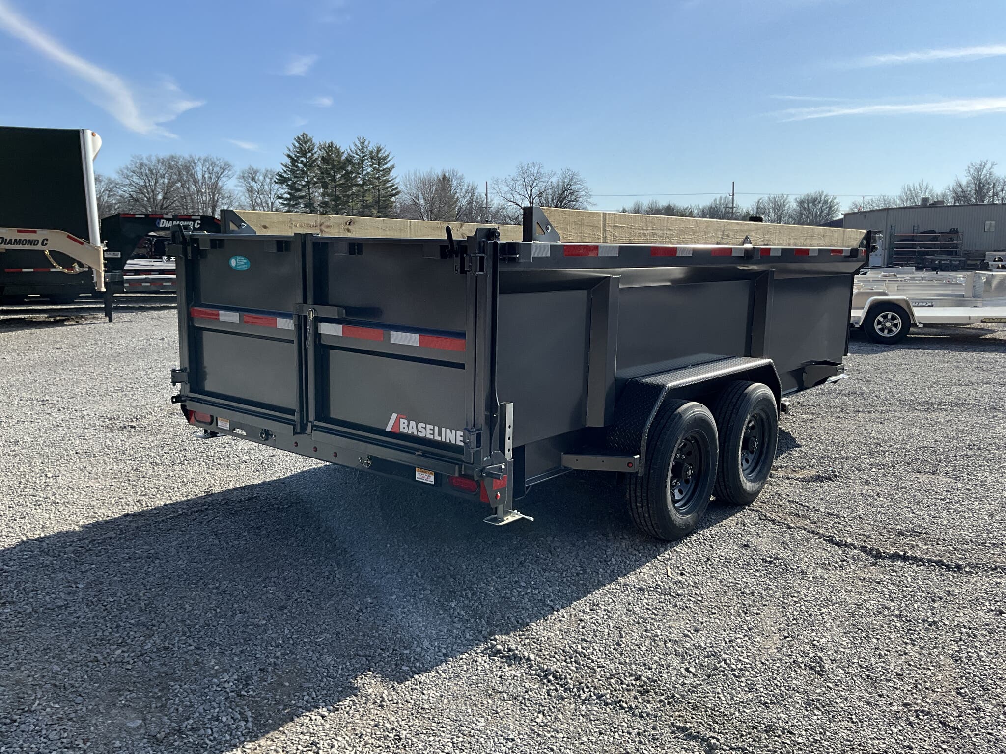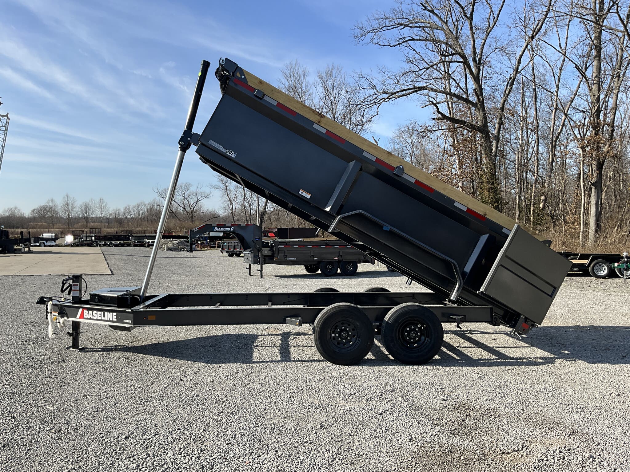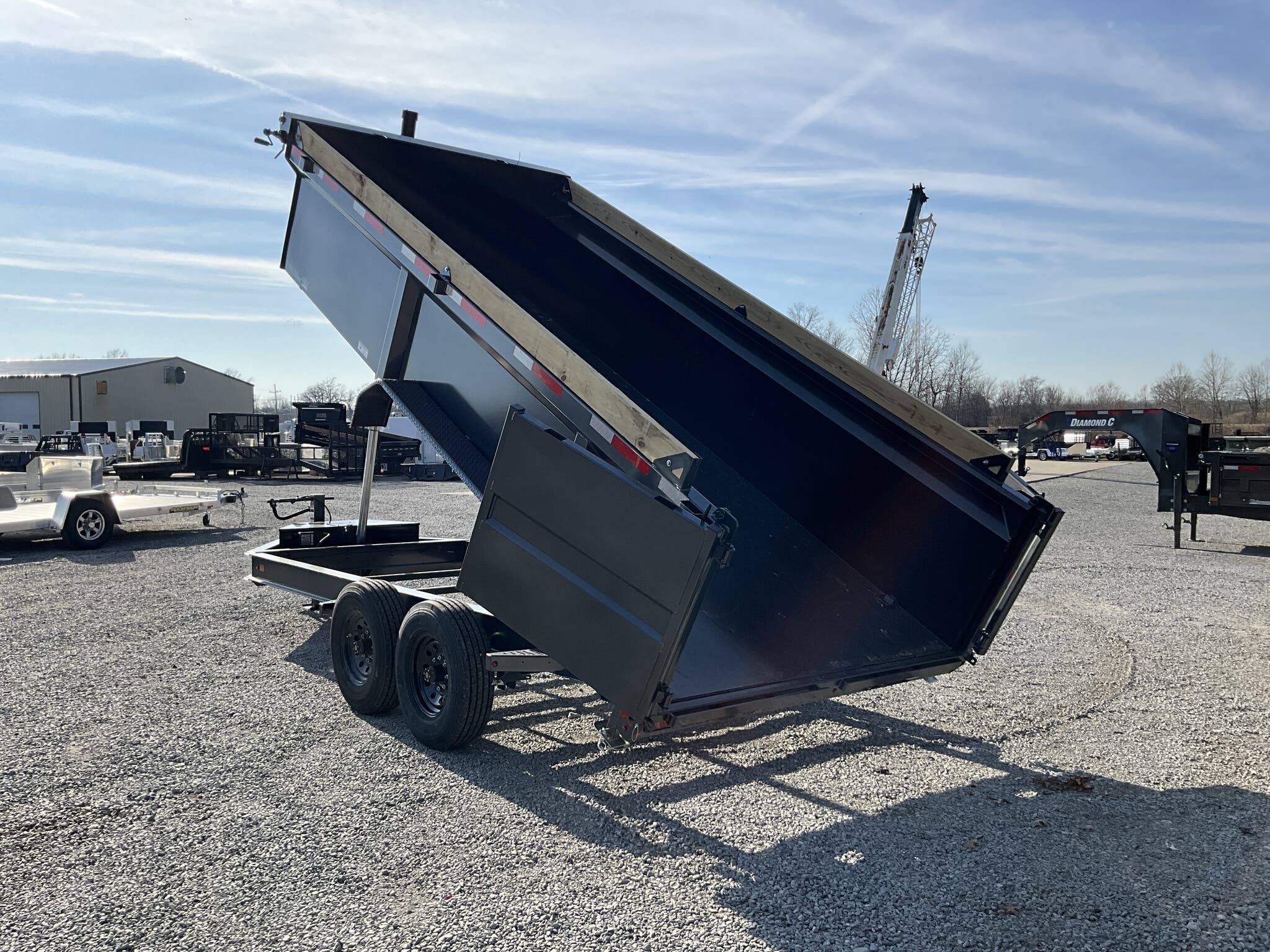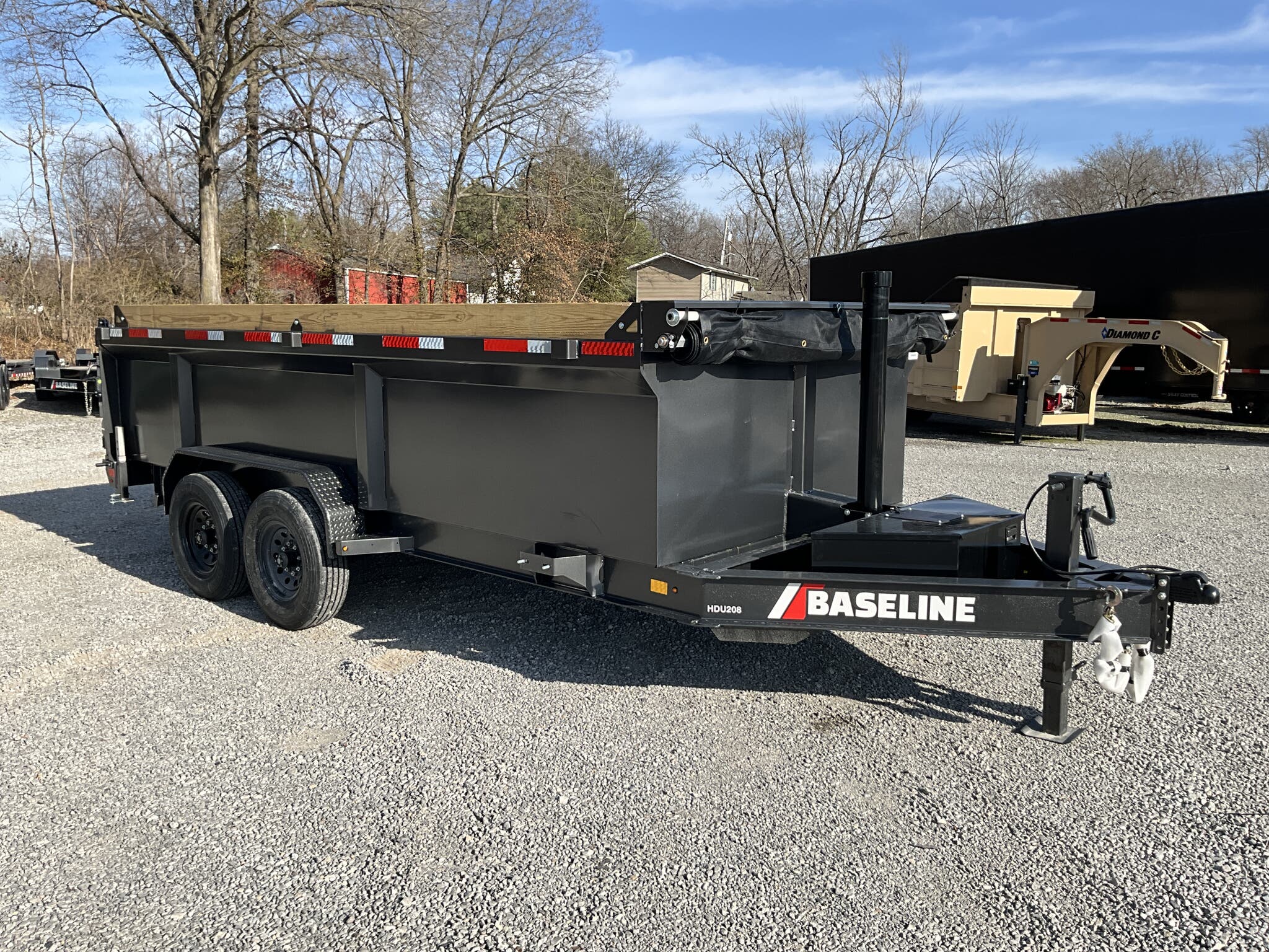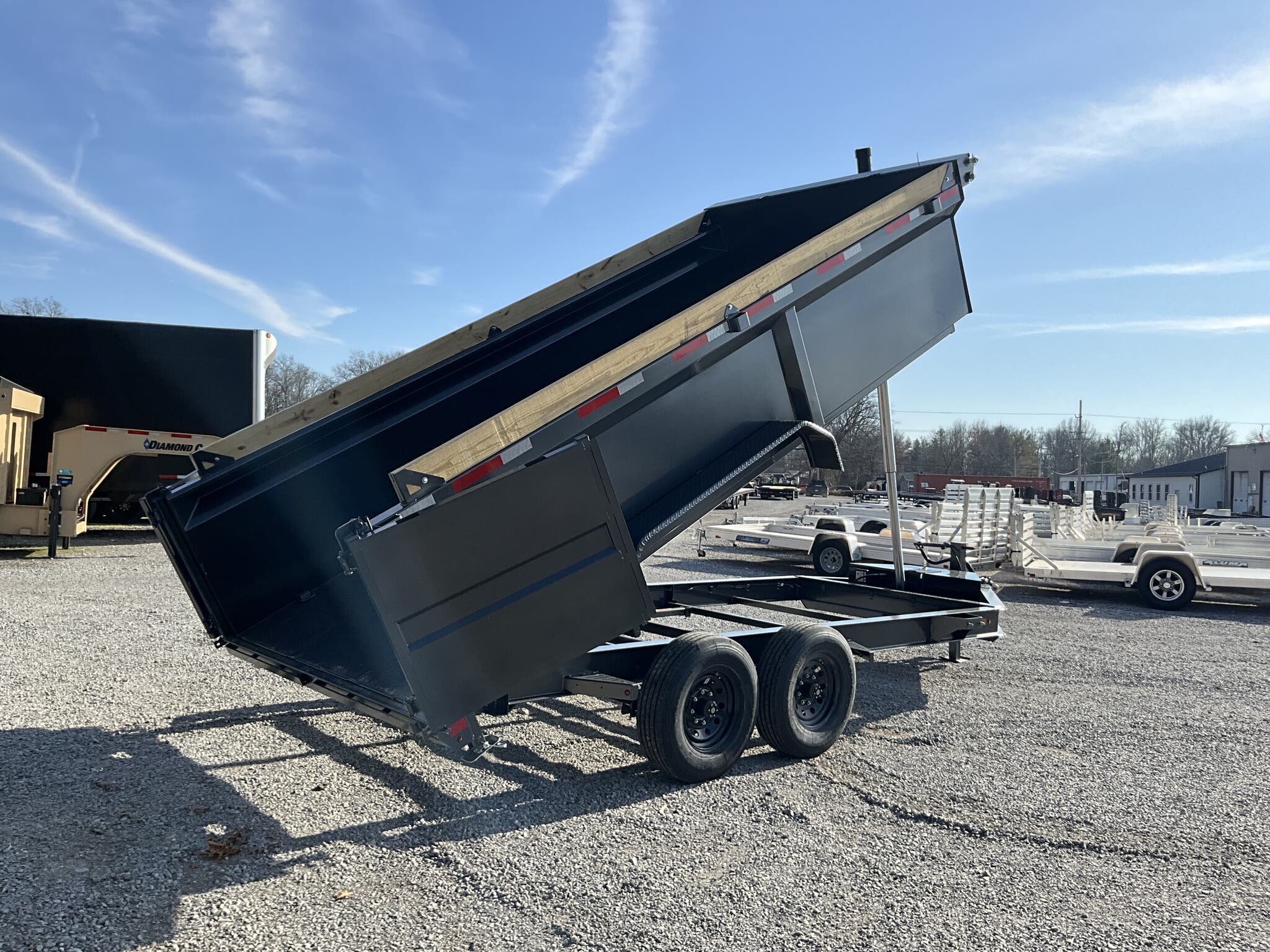 2026 DIAMOND C HDU208 16' x 82" Dump Trailer, Carbon Metallic Gray, 36" Tall 10 Ga Sides, 78" Slide In Ramps, Dual 8K Axles For Sale in Illinois Feature: 36" tall 10 ga integral sides (heavy duty commercial body) Feature: 78" rear slide in ramps (3" I beam) Feature: Board brackets with boards & raised front Feature: Rear stabilizer drop leg jacks (pair) Feature: SolarPulse 7W charger + Group 27 battery Feature: Spare mount (curb side) Specs Frame Size: L16 x 82 Specs Main Frame: 8" x 15 lb I beam; 16" center crossmembers Specs Body/Sides: 36" tall, 10 ga full integral body with floor Specs Gate: 3 way dump gate (standard) Specs Ramps: 78" rear slide in (3" I beam) Specs Hoist/Hydraulics: Power up / gravity down hydraulic system Specs Axles/Brakes: (2) 8,000 lb straight axles; electric drum brakes Specs Suspension: 6 leaf slipper springs Specs Coupler/Jack: 2 5/16" Demco EZ Latch 21K adjustable; 12K drop leg jack Specs Fenders: 14 ga straight diamond plate, weld on Specs Storage: Curb side spare mount Specs Tarp: 20' heavy duty black mesh tarp (installed) Specs Tie Downs: (4) 5/8" D rings Specs Tires/Wheels: ST235/80R16, 14 ply radials; 8 hole black wheels Specs Lighting/Wiring: All LED lights; sealed wiring harness Specs Paint/Finish: DM Difference Maker coating; Carbon Metallic Gray Specs Warranty: 6 year manufacturer warranty (2026+) Specs Web ID: 345920 Weights & Capacities Total Axle Capacity (used for payload math): 16,000 lb Weights & Capacities Empty/Trailer Weight: 5,100 lb Weights & Capacities Payload on Axles (Capacity Empty): 16,000 5,100 = 10,900 lb Weights & Capacities Target Tongue Load (Bumper pull @ ~10% of Capacity): 1,600 lb Weights & Capacities Total Payload Including Tongue Support: 10,900 + 1,600 = 12,500 lb Delivery from 62864 (Lower 48): Up to 100 miles: $150 101 300 miles: $2.00/mile 301 1200 miles: $3.00/mile Over 1200 miles: $4.00/mile