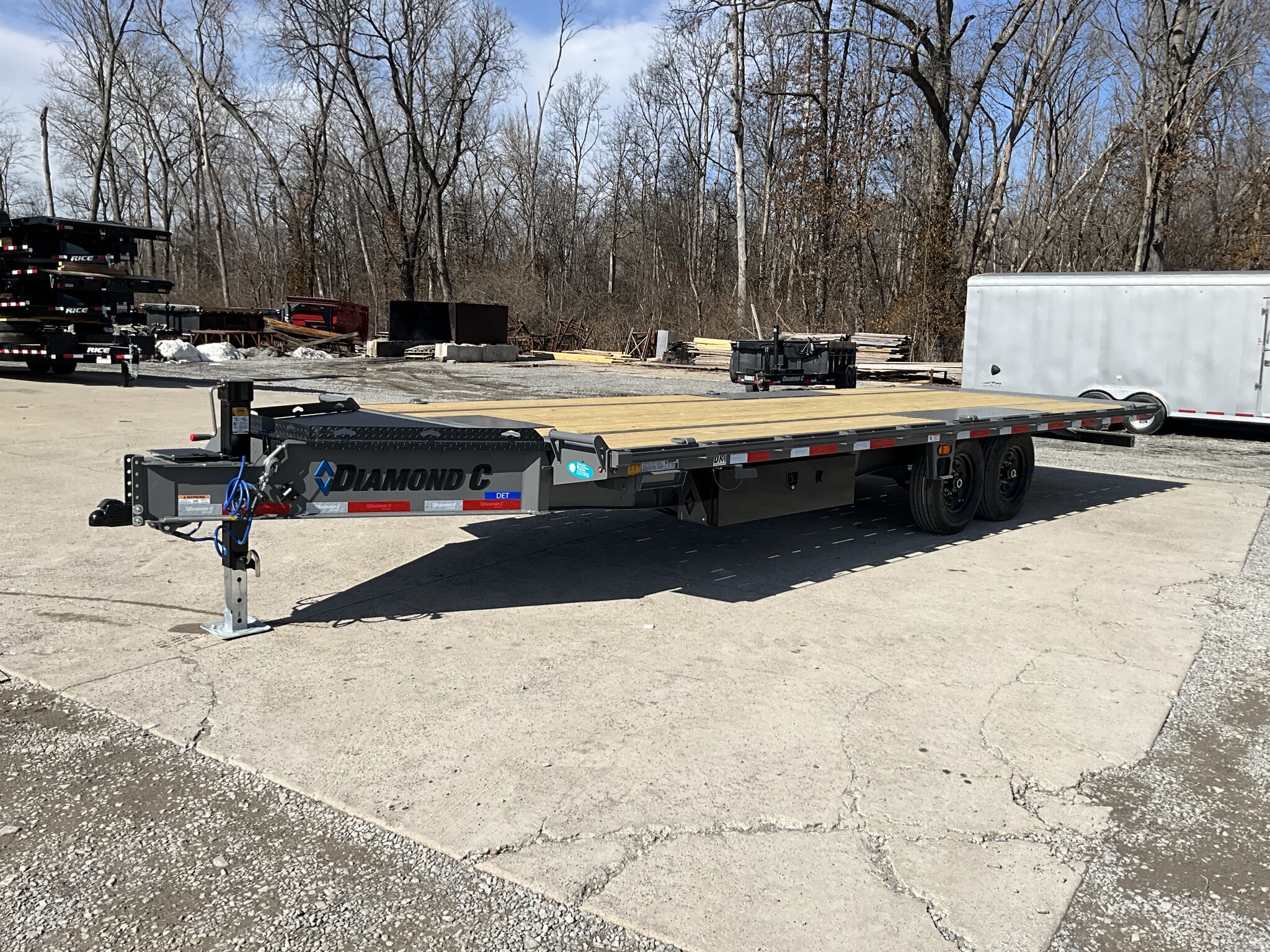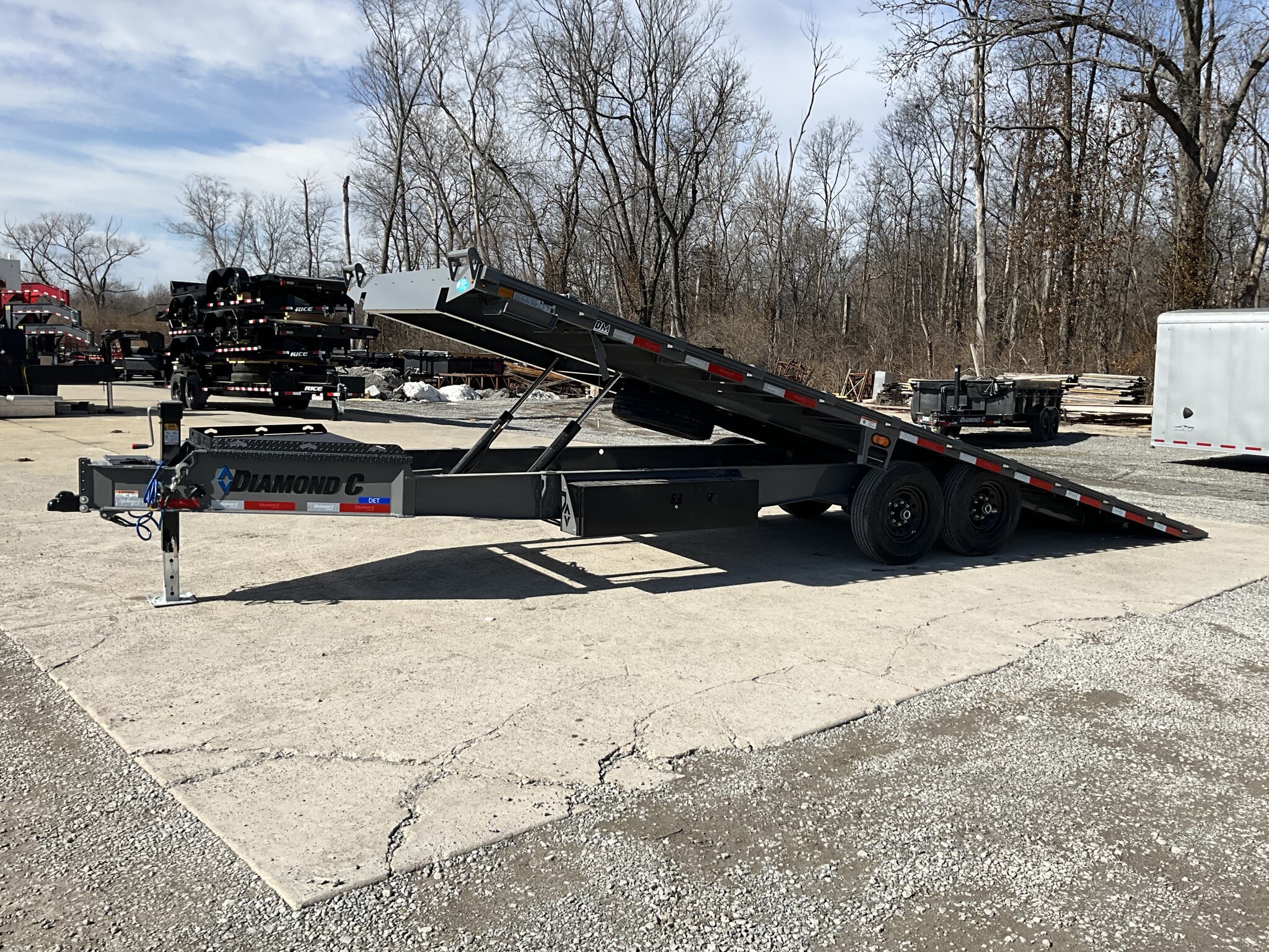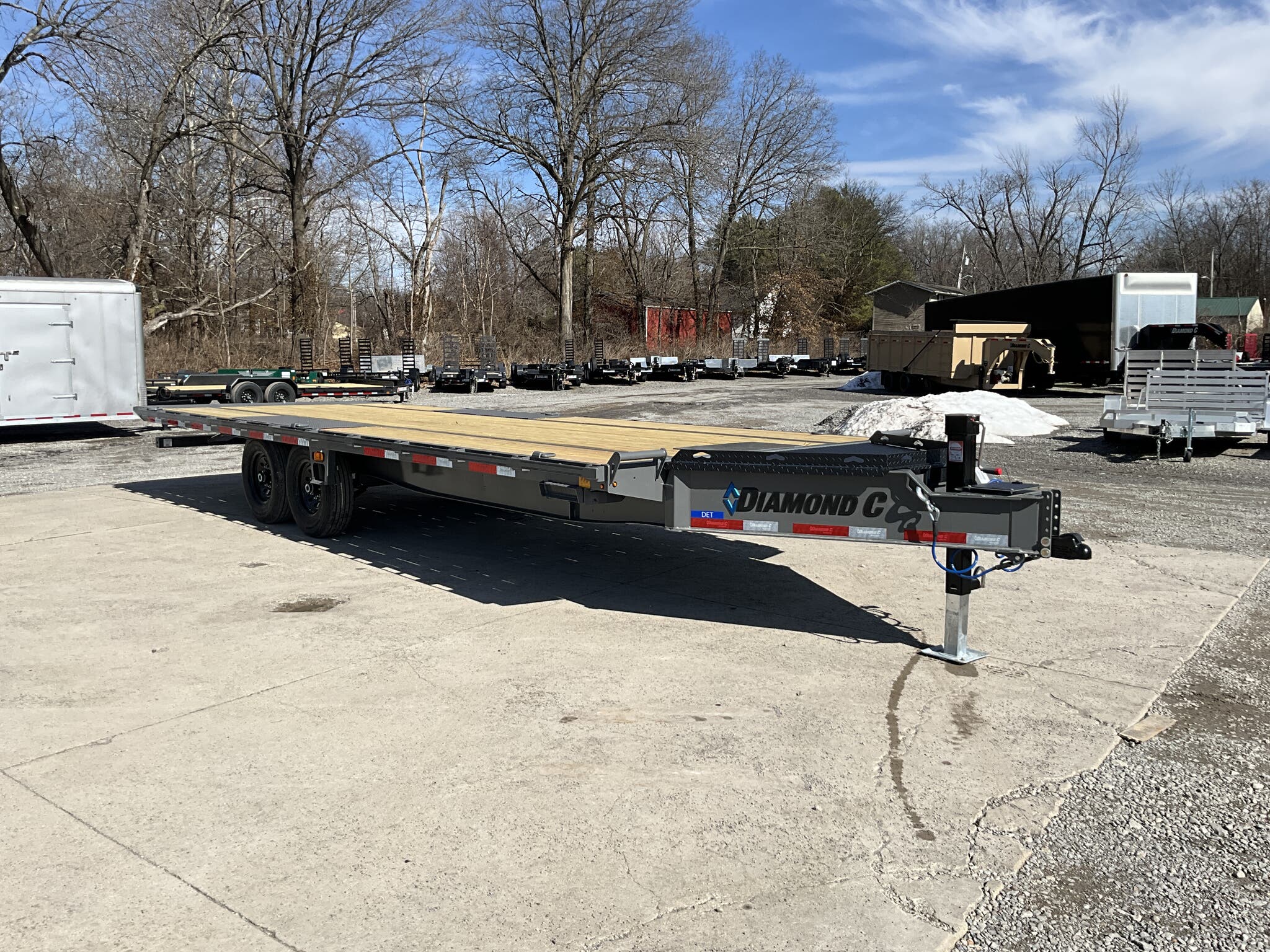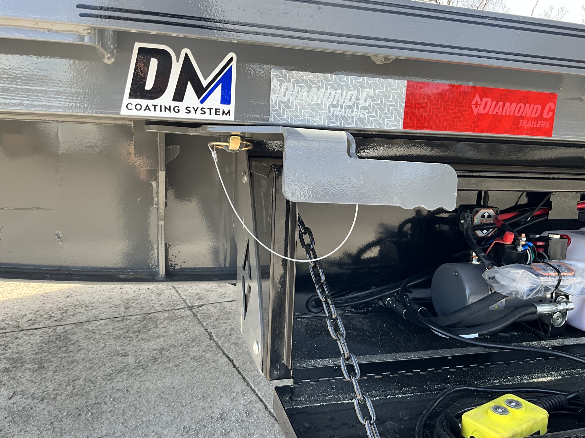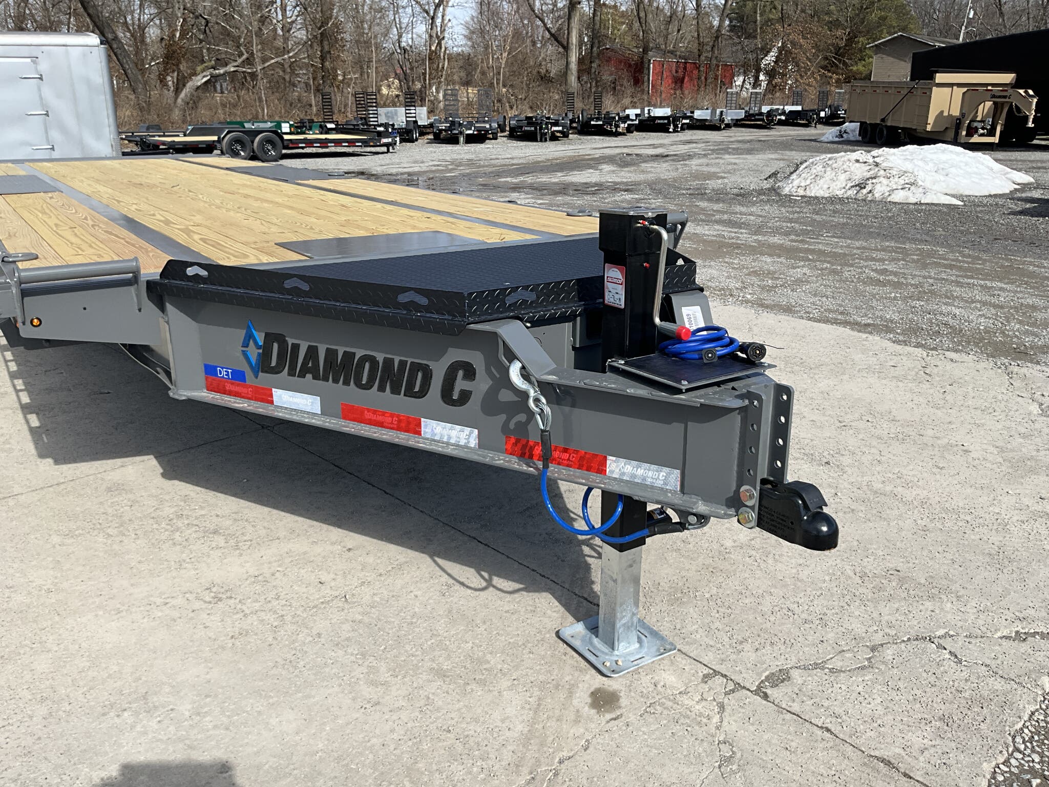 2026 DIAMOND C DET207 24' 102" FULL TILT EQUIPMENT TRAILER, Cement Gray, Tandem 7K Axles, Electric/Hydraulic Tilt For Sale in Illinois Feature: Full bed electric/hydraulic tilt with Bluetooth wireless controller Feature: Underslung component box plus HD V tongue storage lid Feature: SolarPulse charging system with Group 27 battery Feature: (6) additional 5/8" D rings for expanded tie down capacity Specs Frame: Engineered beam frame Specs Deck: Full bed tilt deck (24' total length) Specs Floor: 2" treated lumber Specs Axles/Brakes: (2) 7,000 lb axles; electric drum brakes Specs Suspension: 6 leaf slipper roller spring suspension Specs Coupler: 20K adjustable pintle ring (3" eye) on adjustable channel Specs Jack: 15K Simol 2 speed drop leg jack Specs Storage: HD V tongue lid; 10" 12" 53" underslung component box Specs Rail/Tie Downs: 5" channel lace rail with 3/8" rub rail, stake pockets & pipe spools; (6) extra D rings Specs Steps: Front retractable steps; mid turn light/step combo Specs Winch Prep: Floor level winch mounting plate (no holes drilled) Specs Tires/Wheels: ST235/80R16 14 ply radials on black wheels; matching spare Specs Lighting: All LED lighting Specs Finish: DM Difference Maker coating; Cement Gray Specs Warranty: 6 year Diamond C manufacturer warranty (2026+) Weights & Capacities Total Axle Capacity: 14,000 lb Weights & Capacities Empty Weight: 5,170 lb Weights & Capacities Payload on Axles: 14,000 5,170 = 8,830 lb Weights & Capacities Tongue Load (Bumper Pull @ 10%): 1,400 lb Weights & Capacities Total Payload Including Tongue: 10,230 lb Delivery from 62864 (Lower 48): Up to 100 miles $150 101 300 miles $2.00/mile 301 1200 miles $3.00/mile Over 1200 miles $4.00/mile