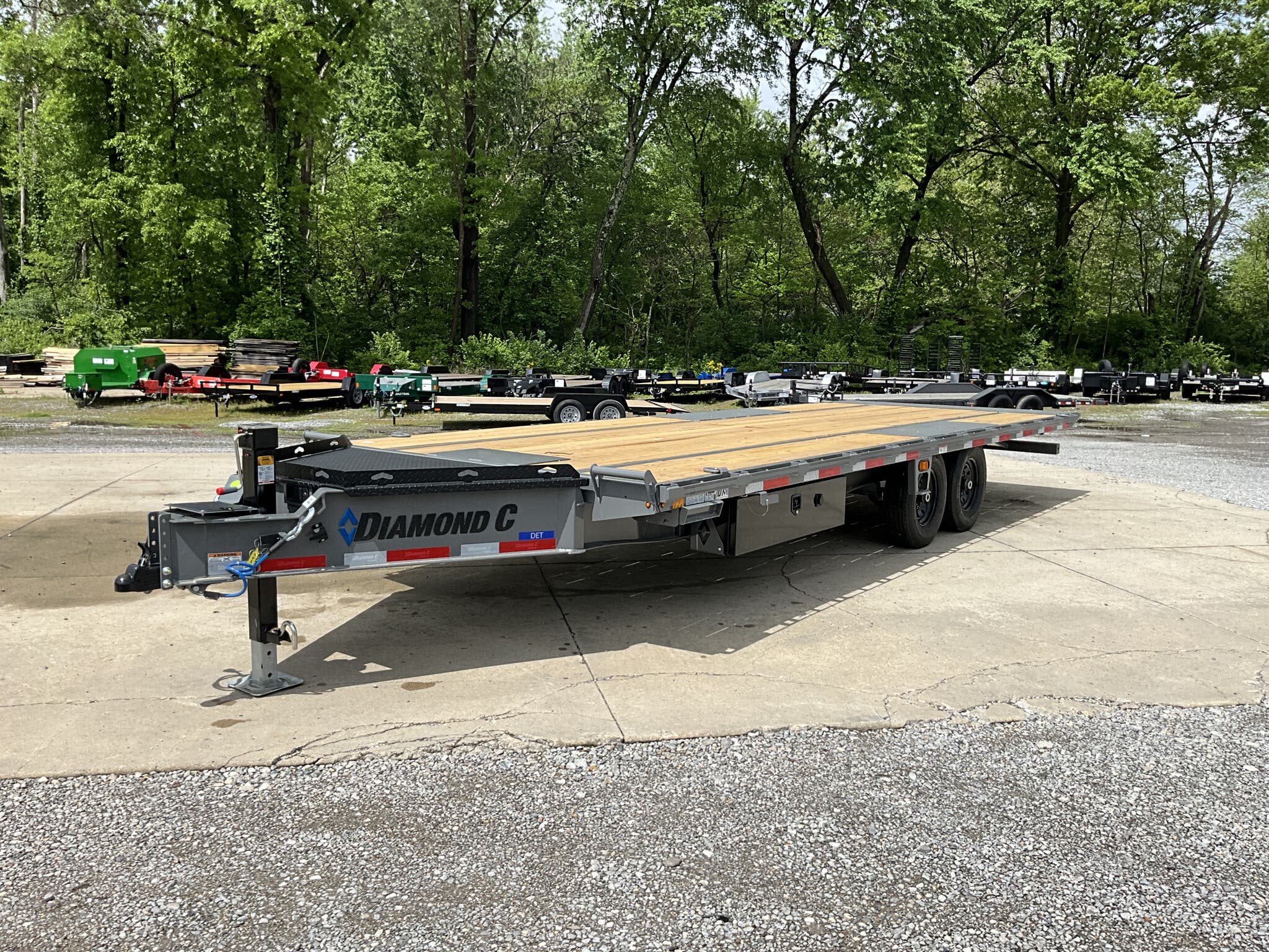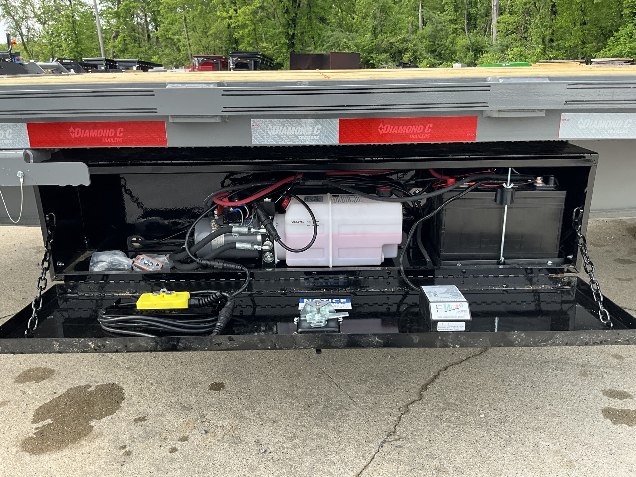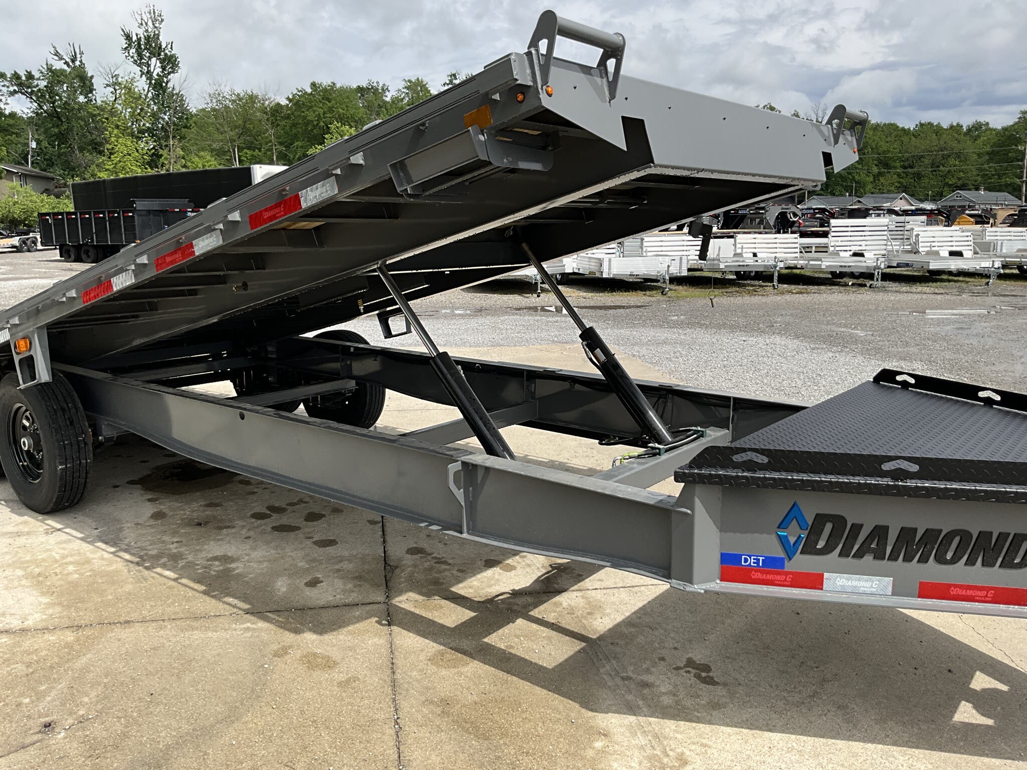 2026 DIAMOND C DET207 24' 102" Full Bed Power Tilt Trailer, Cement Gray, Dual 7K Axles, Electric/Hydraulic Tilt For Sale in Illinois Feature: Full bed electric/hydraulic powered tilt Feature: Adjustable pintle ring coupler Feature: Underslung component box + HD V tongue lid Feature: Front retractable steps and mid turn light/step combo Feature: (6) total 5/8" D rings Specs Frame: Engineered beam frame Specs Crossmembers: 3" I beam on 14" centers Specs Deck/Floor: Full bed tilt; 2" treated lumber Specs Axles/Brakes: (2) 7,000 lb Super Lube axles; electric drum brakes Specs Suspension: Slipper roller springs Specs Jack: 15K Simol 2 speed drop leg Specs Storage: HD V tongue lid; underslung component box Specs Winch: Winch mounting plate Specs Battery/Charging: Group 27 battery; 110V 5 amp charger; SolarPulse 7 watt charger Specs Rail/Tie Downs: 5" channel lace rail with 3/8" rub rail, stake pockets & pipe spools Specs Tires/Wheels: ST235/80R16 radial, 14 ply; black wheels; under frame spare mount + spare Specs Lighting: All LED lighting Specs Finish: DM Difference Maker coating; Cement Gray Specs Warranty: 6 year Diamond C manufacturer warranty Weights & Capacities Total Axle Capacity: 14,000 lb Weights & Capacities Empty Weight: 5,510 lb Weights & Capacities Payload on Axles: 14,000 5,510 = 8,490 lb Weights & Capacities Tongue Load (10%): 1,400 lb Weights & Capacities Total Payload Including Tongue: 9,890 lb Delivery from 62864 (Lower 48): Up to 100 miles $150 101 300 miles $2.00/mile 301 1200 miles $3.00/mile Over 1200 miles $4.00/mile