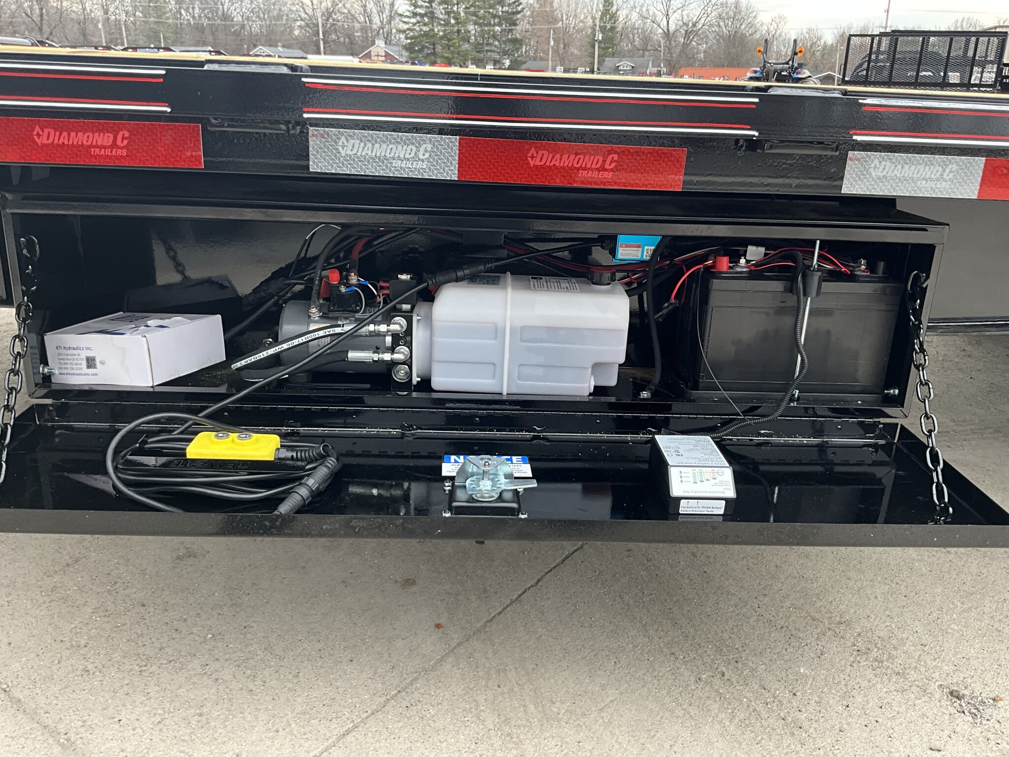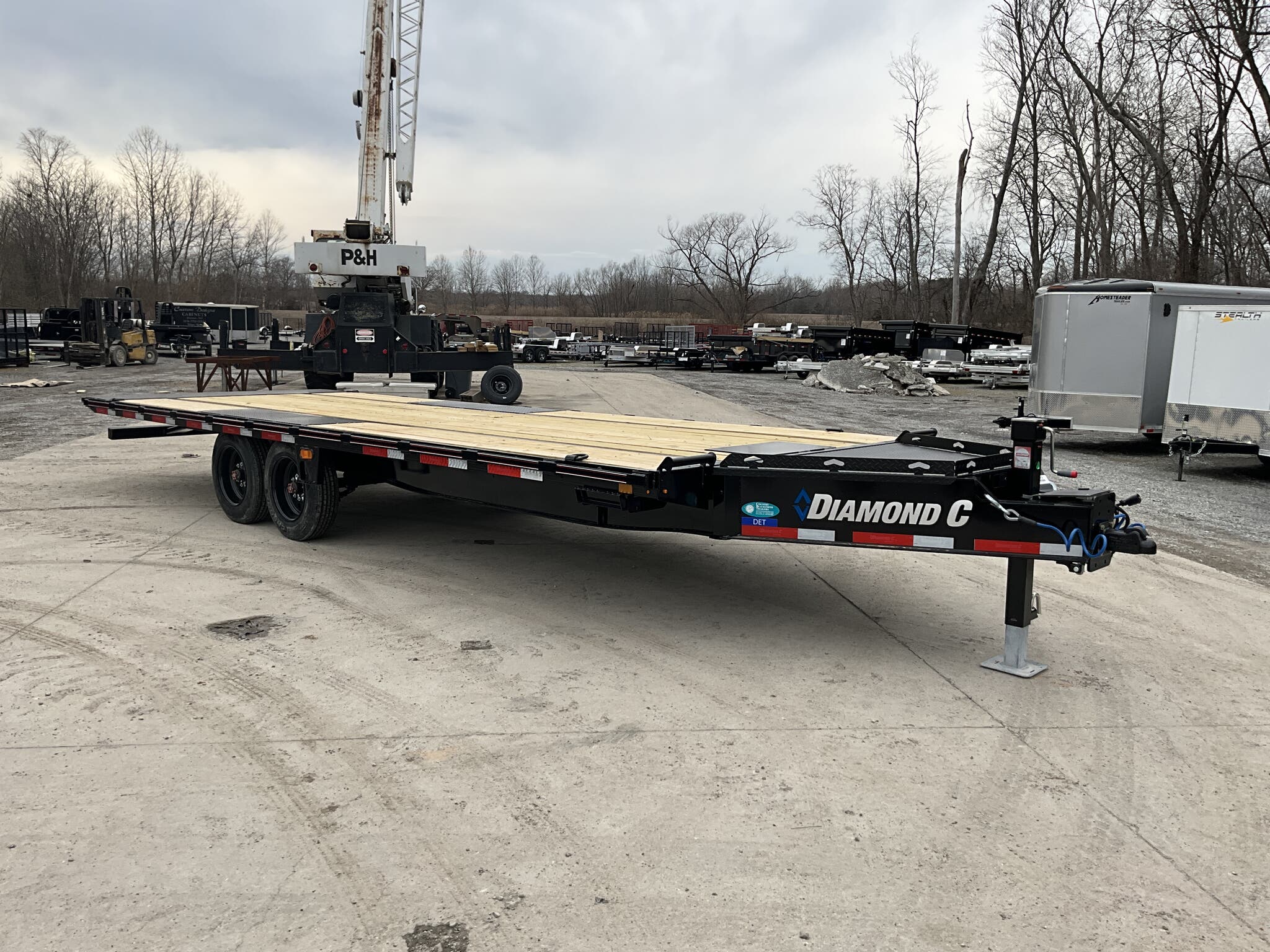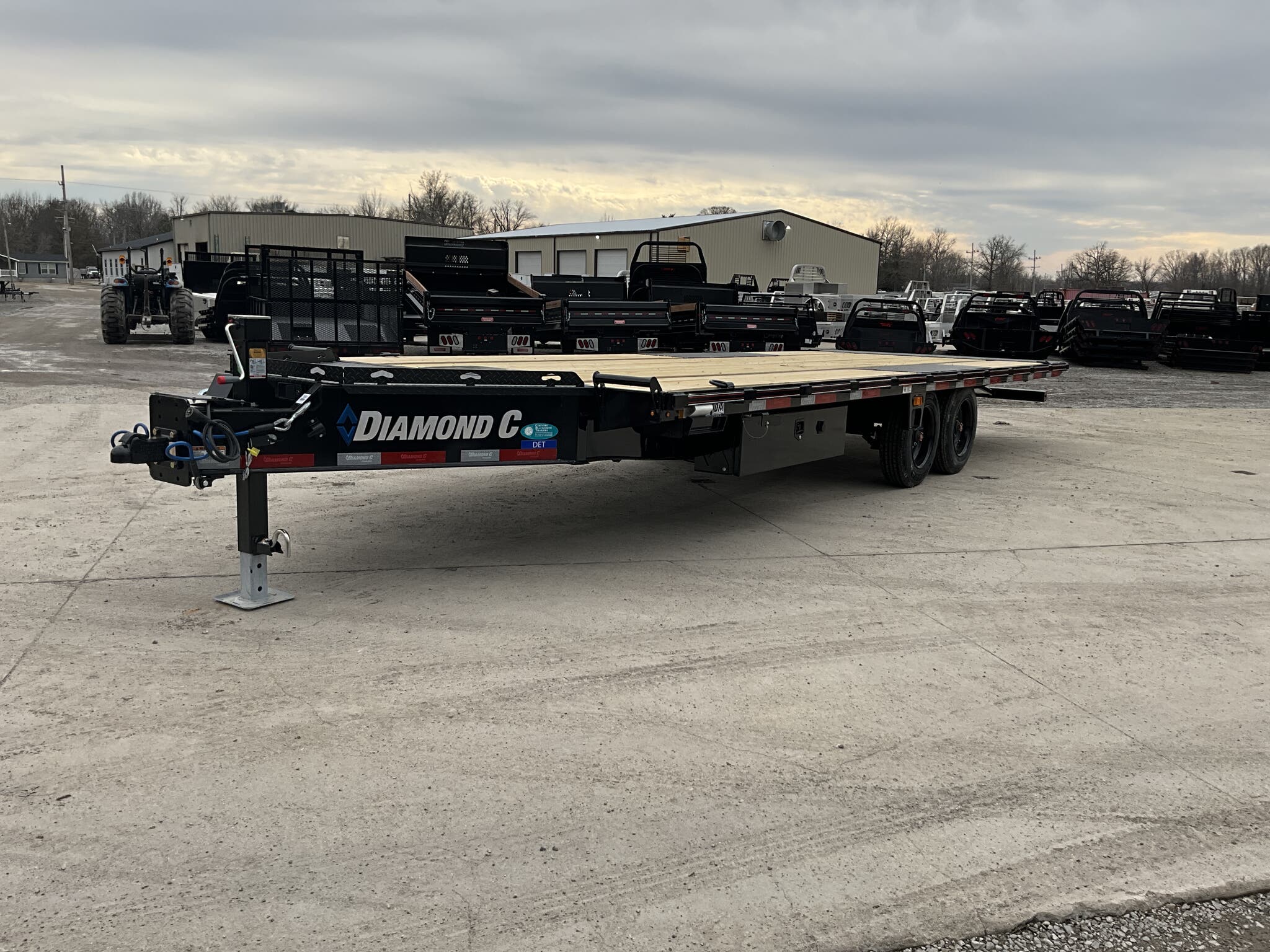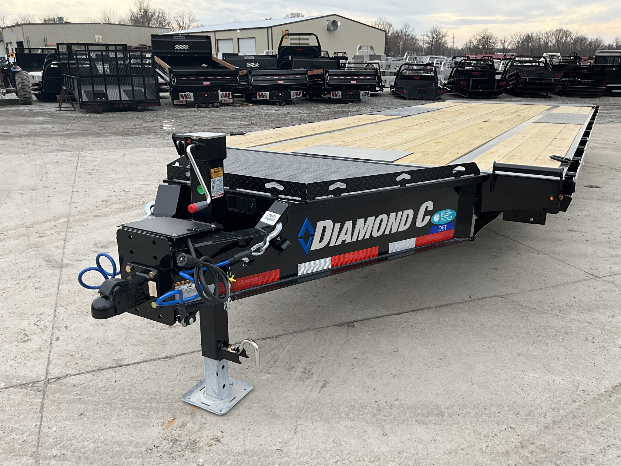 2026 DIAMOND C DET208 24' 102" FULL TILT EQUIPMENT TRAILER, ONYX BLACK, ELECTRIC/HYDRAULIC TILT FOR SALE IN MOUNT VERNON, IL 62864 Feature: Electric/hydraulic powered full bed tilt system Feature: Lithium battery upgrade with SolarPulse charging Feature: Underslung component storage box Feature: Rear LED caution flashers Feature: (6) heavy duty 5/8" D rings Specs Model: DET208 Specs Size: 24' 102" full tilt deck Specs Frame: Engineered beam frame Specs Crossmembers: 3" I beam on 14" centers Specs Floor: 2" treated lumber deck Specs Axles/Brakes: (2) 8,000 lb oil bath axles; electric drum brakes with ABS Specs Suspension: Slipper roller spring suspension Specs Coupler: 2 5/16" 25K Demco EZ Latch flat mount coupler Specs Jack: 15K Simol two speed drop leg jack Specs Storage: HD V tongue lid storage; underslung component box Specs Winch Prep: Winch mounting plate installed Specs Rail/Tie Downs: 5" channel lace rail with 3/8" rub rail, stake pockets and pipe spools; (6) D rings Specs Steps: Front retractable steps; mid turn step/light combo Specs Tires/Wheels: ST215/75R17.5 18 ply radial tires; black wheels; matching spare Specs Electrical: Lithium battery system with SolarPulse 7W charger Specs Lighting: All LED lighting with rear flashing caution lights Specs Finish: DM Difference Maker coating; Onyx Black Specs Warranty: 6 year Diamond C manufacturer warranty (2026+) Weights & Capacities Total Axle Capacity: 16,000 lb Empty Weight: 3,360 lb Payload on Axles: 16,000 3,360 = 12,640 lb Tongue Load (Bumper Pull @ 10%): 1,600 lb Total Effective Payload: 14,240 lb Delivery from 62864 (Lower 48) Up to 100 miles $150 101 300 miles $2.00/mile 301 1200 miles $3.00/mile Over 1200 miles $4.00/mile