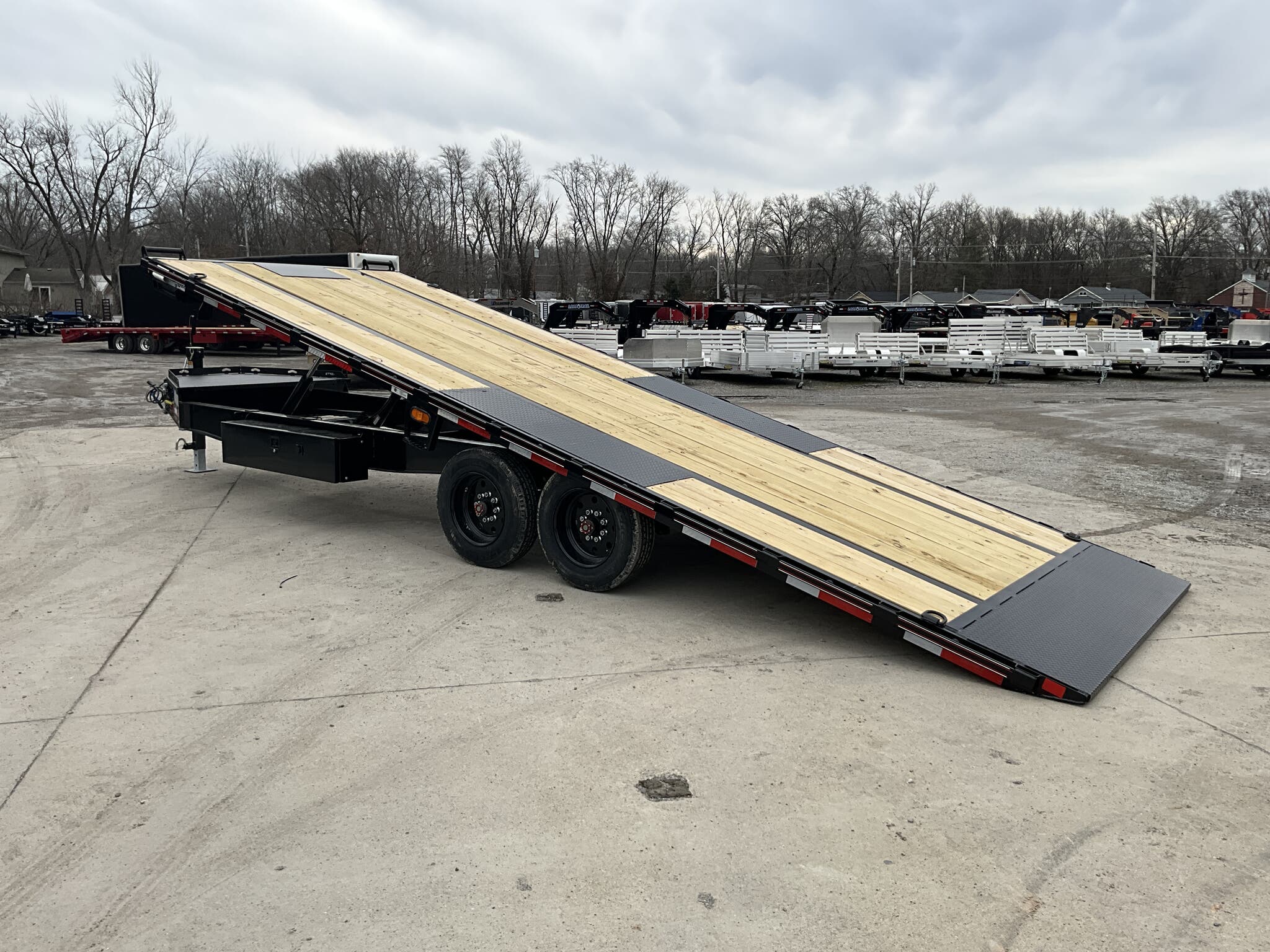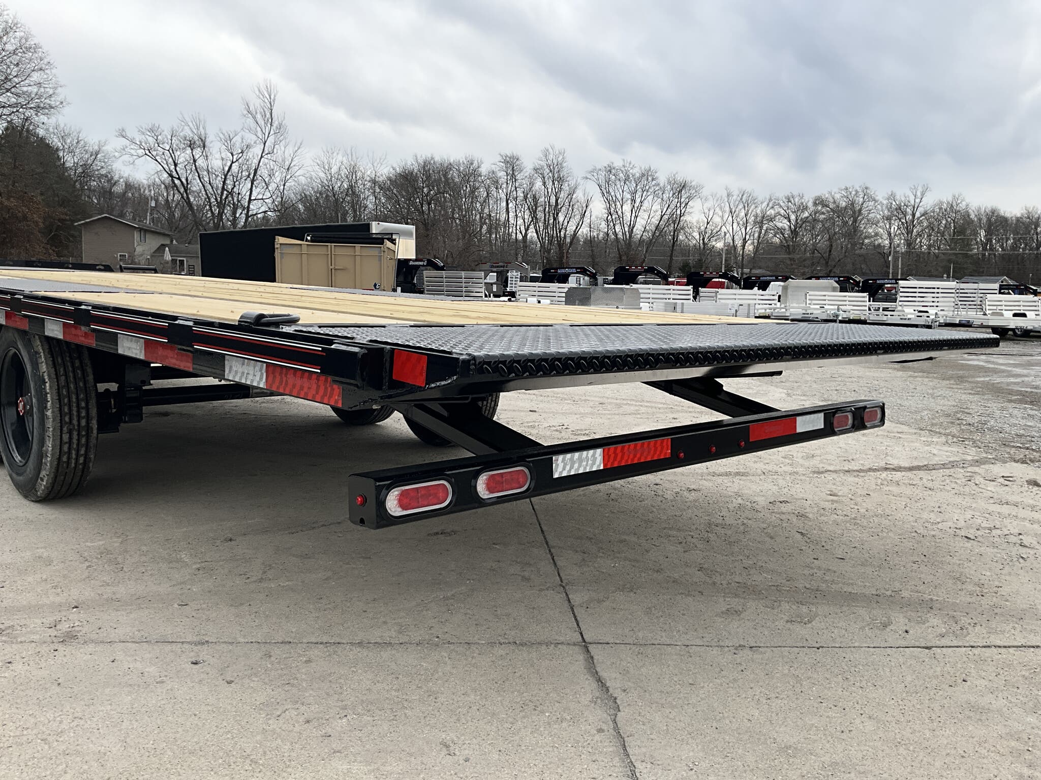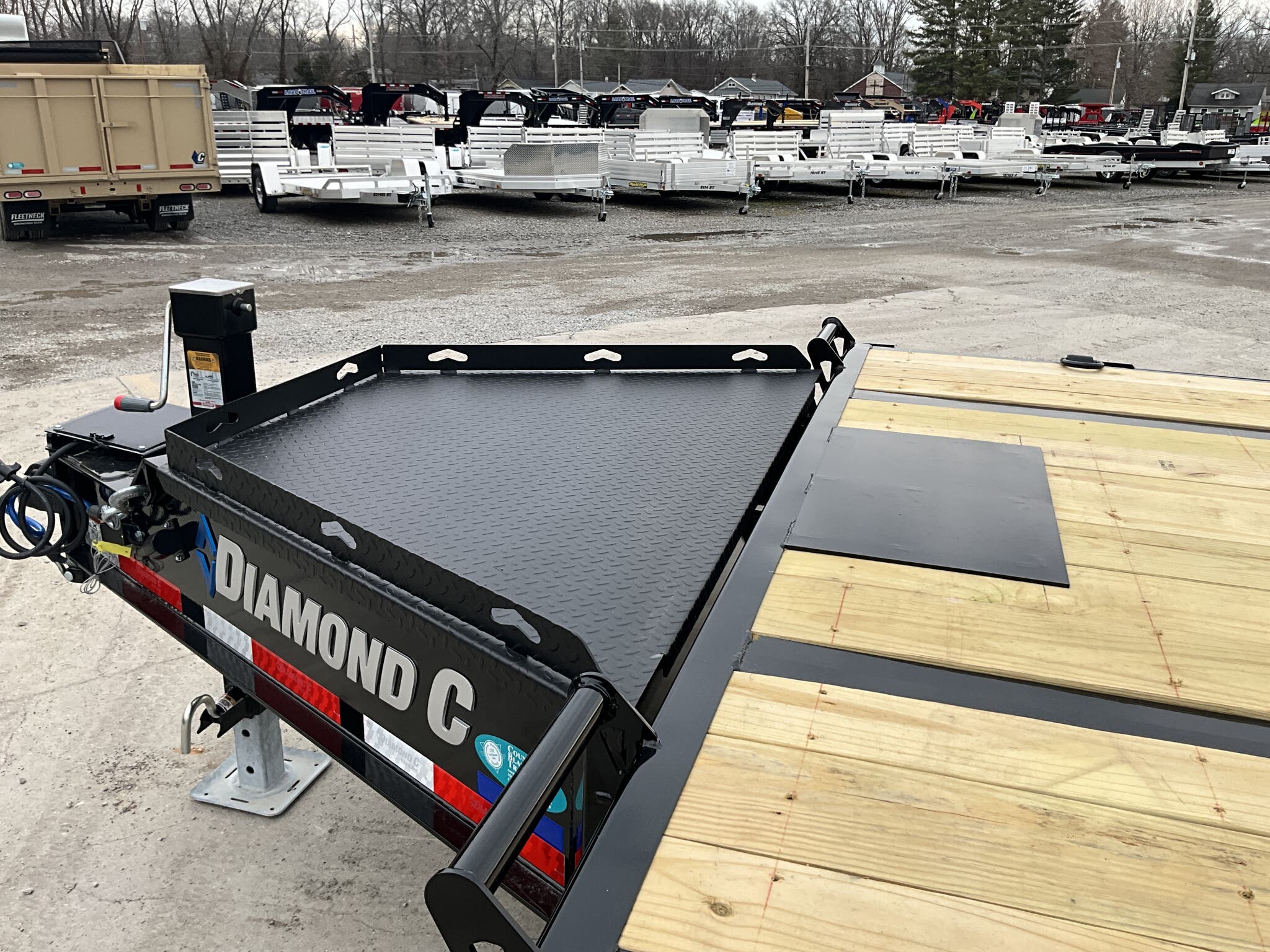 2026 DIAMOND C DET208 24' 102" FULL TILT EQUIPMENT TRAILER, ONYX BLACK, ELECTRIC/HYDRAULIC TILT FOR SALE IN MOUNT VERNON, IL 62864 Feature: Electric/hydraulic powered full bed tilt system Feature: Lithium battery upgrade with SolarPulse charging Feature: Underslung component storage box Feature: Rear LED caution flashers Feature: (6) heavy duty 5/8" D rings Specs Model: DET208 Specs Size: 24' 102" full tilt deck Specs Frame: Engineered beam frame Specs Crossmembers: 3" I beam on 14" centers Specs Floor: 2" treated lumber deck Specs Axles/Brakes: (2) 8,000 lb oil bath axles; electric drum brakes with ABS Specs Suspension: Slipper roller spring suspension Specs Coupler: 2 5/16" 25K Demco EZ Latch flat mount coupler Specs Jack: 15K Simol two speed drop leg jack Specs Storage: HD V tongue lid storage; underslung component box Specs Winch Prep: Winch mounting plate installed Specs Rail/Tie Downs: 5" channel lace rail with 3/8" rub rail, stake pockets and pipe spools; (6) D rings Specs Steps: Front retractable steps; mid turn step/light combo Specs Tires/Wheels: ST215/75R17.5 18 ply radial tires; black wheels; matching spare Specs Electrical: Lithium battery system with SolarPulse 7W charger Specs Lighting: All LED lighting with rear flashing caution lights Specs Finish: DM Difference Maker coating; Onyx Black Specs Warranty: 6 year Diamond C manufacturer warranty (2026+) Weights & Capacities Total Axle Capacity: 16,000 lb Empty Weight: 3,360 lb Payload on Axles: 16,000 3,360 = 12,640 lb Tongue Load (Bumper Pull @ 10%): 1,600 lb Total Effective Payload: 14,240 lb Delivery from 62864 (Lower 48) Up to 100 miles $150 101 300 miles $2.00/mile 301 1200 miles $3.00/mile Over 1200 miles $4.00/mile