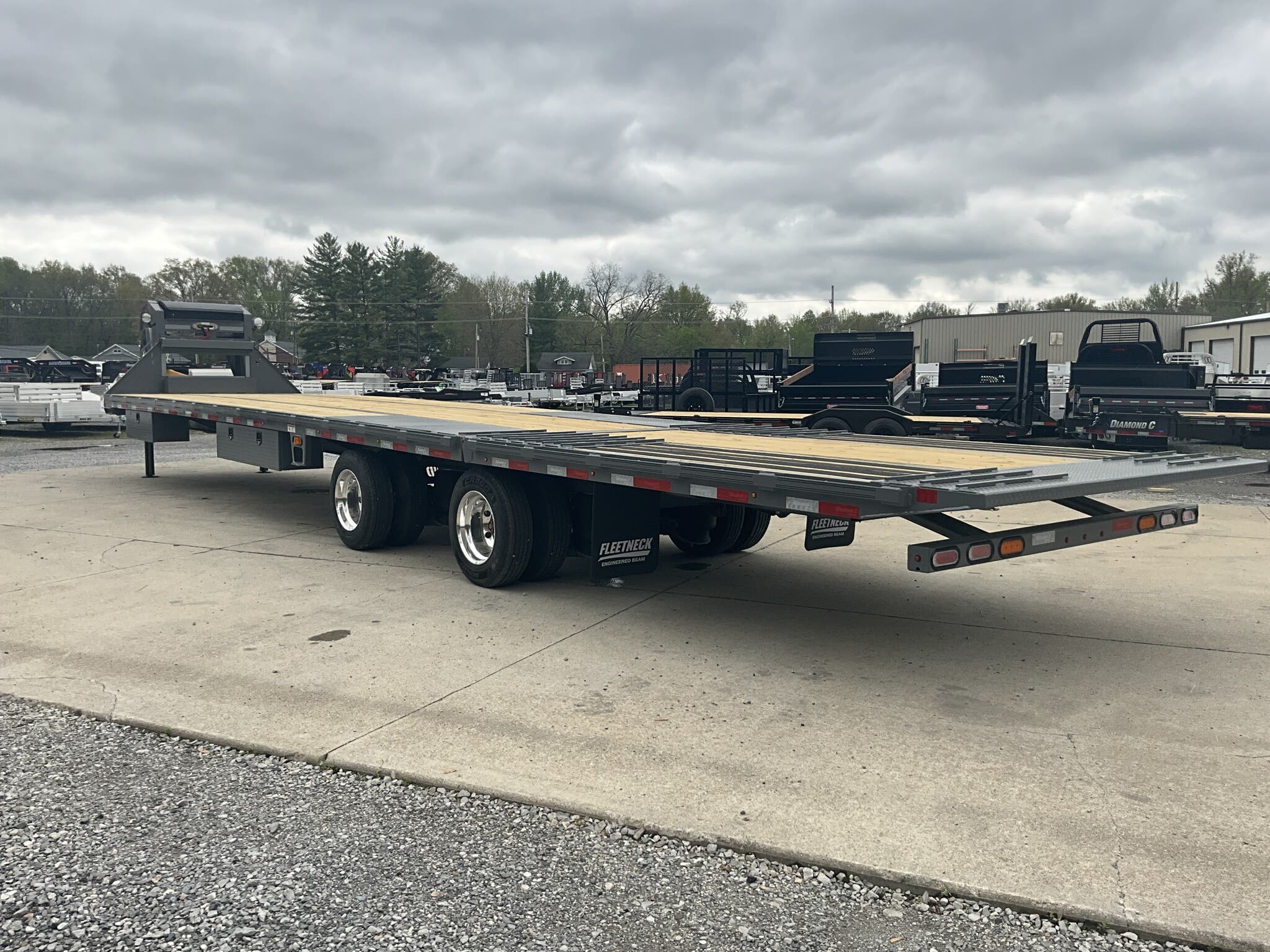 2026 DIAMOND C FMAX212 PACSETTER EDITION 40' 102" ENGINEERED BEAM GOOSENECK WITH 12' HYDRAULIC DOVETAIL, CARBON METALLIC GRAY, AIR RIDE SUSPENSION FOR SALE IN MOUNT VERNON, IL 62864 Feature: 12' fully automatic hydraulic dovetail with steel runners and cleats Feature: Air ride suspension with front lift axle and 72" spread axle Feature: Electric over hydraulic 12K disc brakes Feature: Shocker Hitch air ride gooseneck coupler Feature: Lithium battery system with SolarPulse charging Feature: Multiple storage upgrades including chain rack, dunnage rack, and underslung boxes Specs Model: FMAX212 Pacesetter Edition Specs Size: 40' 102" deck over gooseneck Specs Frame: 16" Engineered Beam 2.0 with 3" I beam crossmembers on 12" centers Specs Axles/Brakes: (2) 12,000 lb heavy duty oil bath axles with electric over hydraulic disc brakes Specs Suspension: Air ride suspension with front lift axle and 72" spread axle Specs Coupler: Shocker Hitch air ride gooseneck coupler Specs Jack: Dual 20K hydraulic jacks Specs Dovetail: 12' fully automatic hydraulic dovetail with steel runners and cleats Specs Floor: 2" treated lumber deck Specs Rail/Tie Downs: 6" channel lace rail with 3/8" rub rail, stake pockets, and pipe spools Specs Tie Downs: Heavy duty 5/8" D rings Specs Slide Track: Full length slide track on passenger side Specs Storage: Diamond plate neck box; full width locking chain rack; underslung storage boxes; 102" dunnage rack Specs Tires/Wheels: ST215/75R17.5 18 ply radial duals with aluminum outer wheels; matching spare Specs Electrical: Lithium battery system with SolarPulse solar charger; sealed wiring harness Specs Lighting: Full LED lighting package with extra clearance lights, rear caution flasher, and loading lights Specs Safety: Sway control system Specs Finish: DM Difference Maker coating; Carbon Metallic Gray Specs Warranty: 6 year Diamond C manufacturer warranty (2026+) Weights & Capacities Total Axle Capacity: 24,000 lb Empty Weight: 10,460 lb Payload on Axles: 24,000 10,460 = 13,540 lb Tongue Load (Gooseneck @ 20%): 4,800 lb Total Effective Payload: 18,340 lb Delivery from 62864 (Lower 48) Up to 100 miles $150 101 300 miles $2.00/mile 301 1200 miles $3.00/mile Over 1200 miles $4.00/mile
