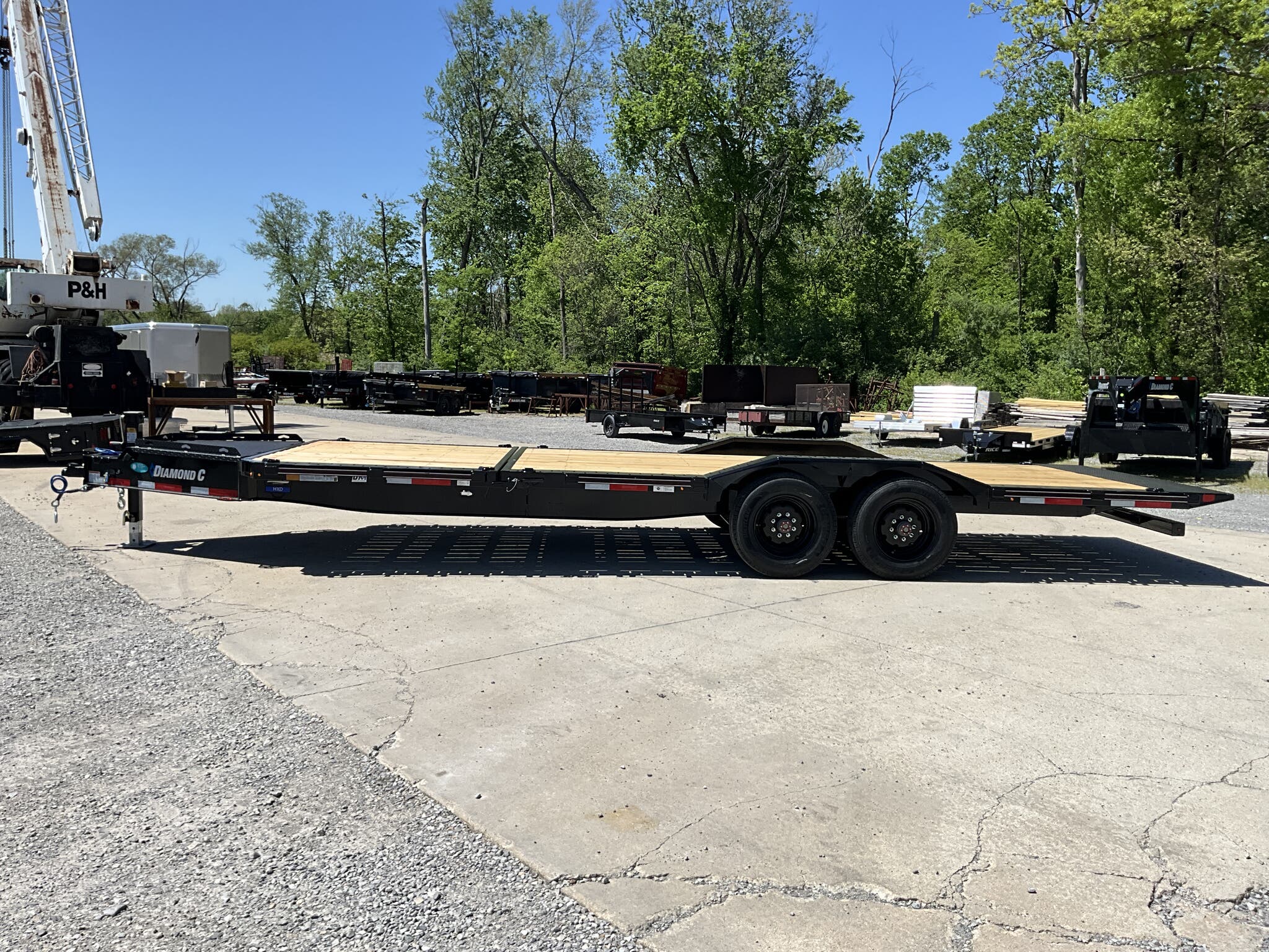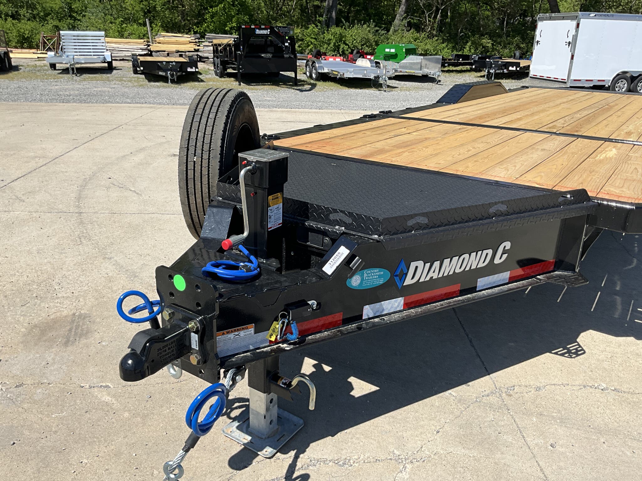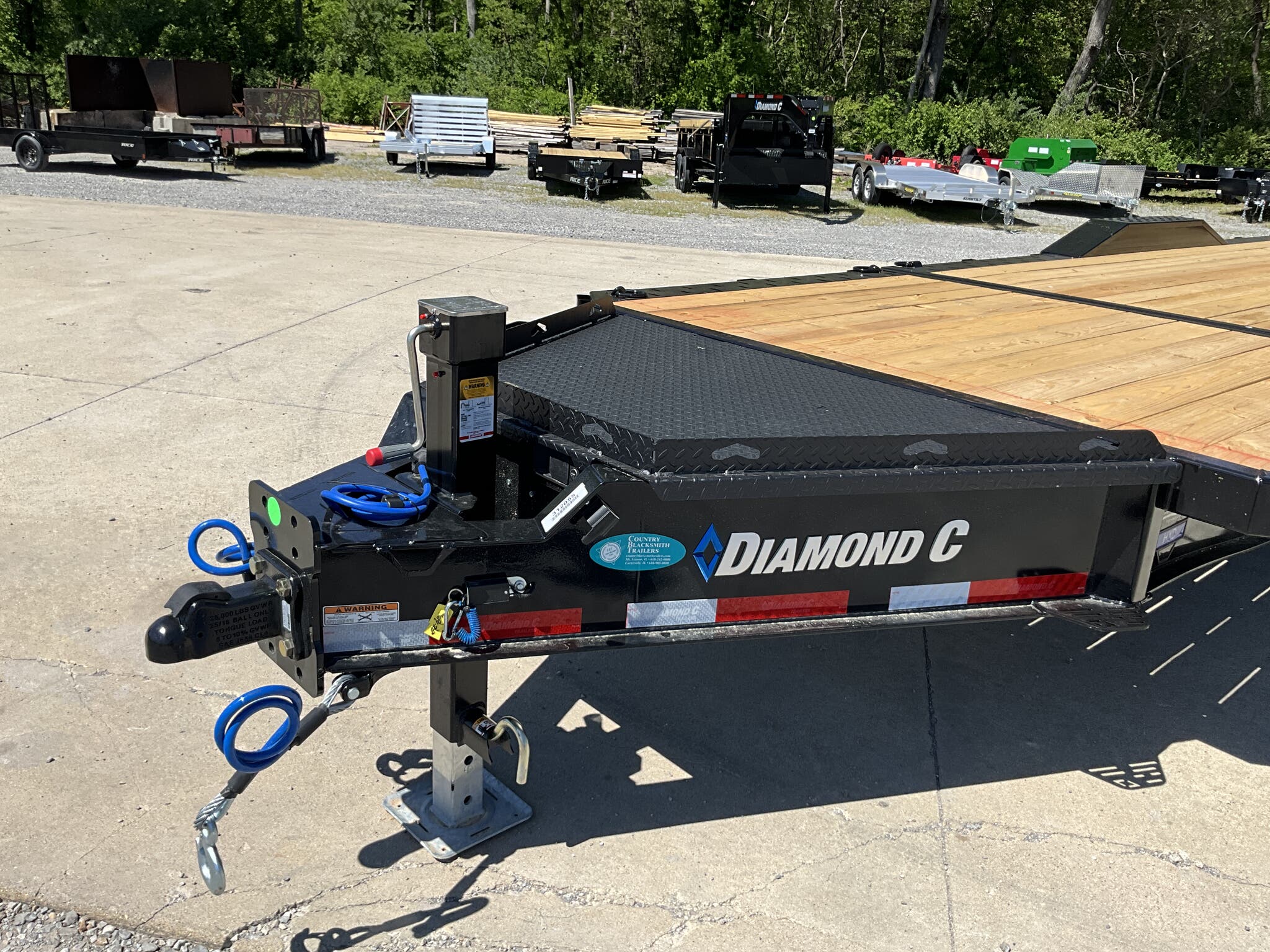 2026 DIAMOND C HXD210 20K 102" 24' MAX WIDTH HYDRAULIC TILT EQUIPMENT TRAILER, ONYX BLACK, 6' STATIONARY / 18' TILT BED FOR SALE IN MOUNT VERNON, IL 62864 Feature: Hydraulic dampened gravity tilt system for smooth, controlled operation Feature: MAX Width package with 10 gauge HD drive over fenders and frame extension Feature: Engineered beam frame with 3" I beam crossmembers on 16" centers Feature: 25K Demco EZ Latch flat mount coupler for secure heavy duty towing Feature: 5/8" D ring tie down system with rub rail, stake pockets, and pipe spools Specs Model: HXD210 Max Width Hydraulic Tilt Equipment Trailer Specs Size: 102" 24' (6' stationary + 18' tilt) Specs GVWR: 20,000 lb Specs Axles/Brakes: (2) 10,000 lb drop axles with electric drum brakes and oil bath hubs Specs Suspension: 10K torsion axles Specs Frame: Engineered beam frame Specs Crossmembers: 3" I beam on 16" centers Specs Deck: 2" treated wood floor Specs Tilt: Hydraulic dampened gravity tilt system Specs Coupler: 2 5/16" 25K Demco EZ Latch flat mount Specs Jack: 15K 2 speed drop leg jack Specs Storage: HD V tongue toolbox Specs Fenders: 10 gauge HD drive over fenders with frame extension Specs Tie Downs: (8) 5/8" D rings Specs Rail: 2" 3/8" rub rail with stake pockets and pipe spools Specs Tires/Wheels: ST235/75R17.5 super single 18 ply, black steel wheels Specs Spare: Matching ST235/75R17.5 super single 18 ply with tongue mount Specs Spare Mount: Passenger side tongue mount Specs Lighting: Full LED lighting package Specs Finish: Onyx Black powdercoat Specs Certification: NATM compliant Specs Warranty: 6 year Diamond C structural warranty Specs Web ID: 354805 1 Weights & Capacities GVWR: 20,000 lb Empty Weight: 5,220 lb Payload on Axles: 20,000 5,220 = 14,780 lb Target Tongue Load (10% of GVWR): 2,000 lb Total Effective Payload: 16,780 lb Delivery from 62864 (Lower 48) Up to 100 miles $150 101 300 miles $2.00/mile 301 1200 miles $3.00/mile Over 1200 miles $4.00/mile