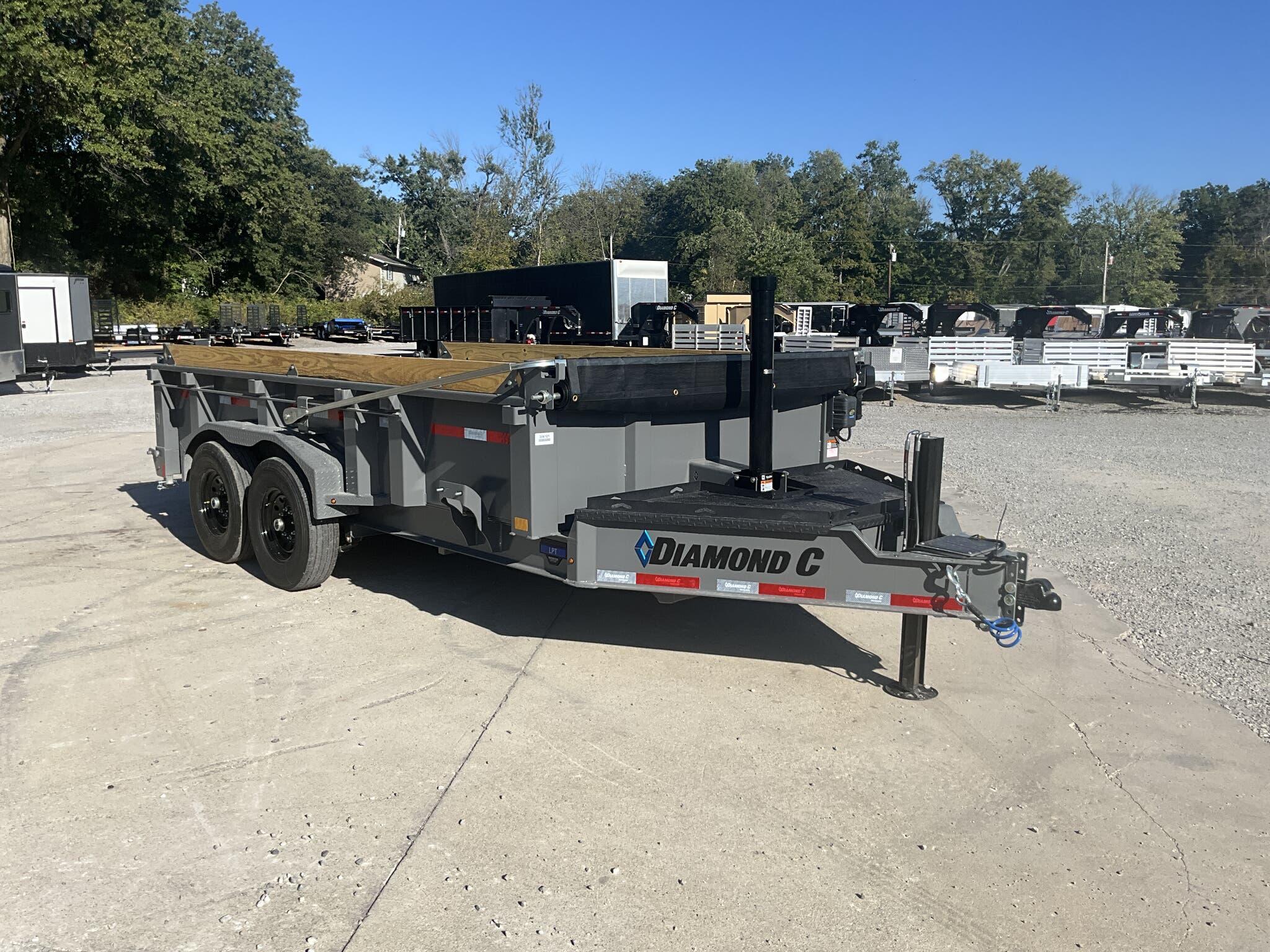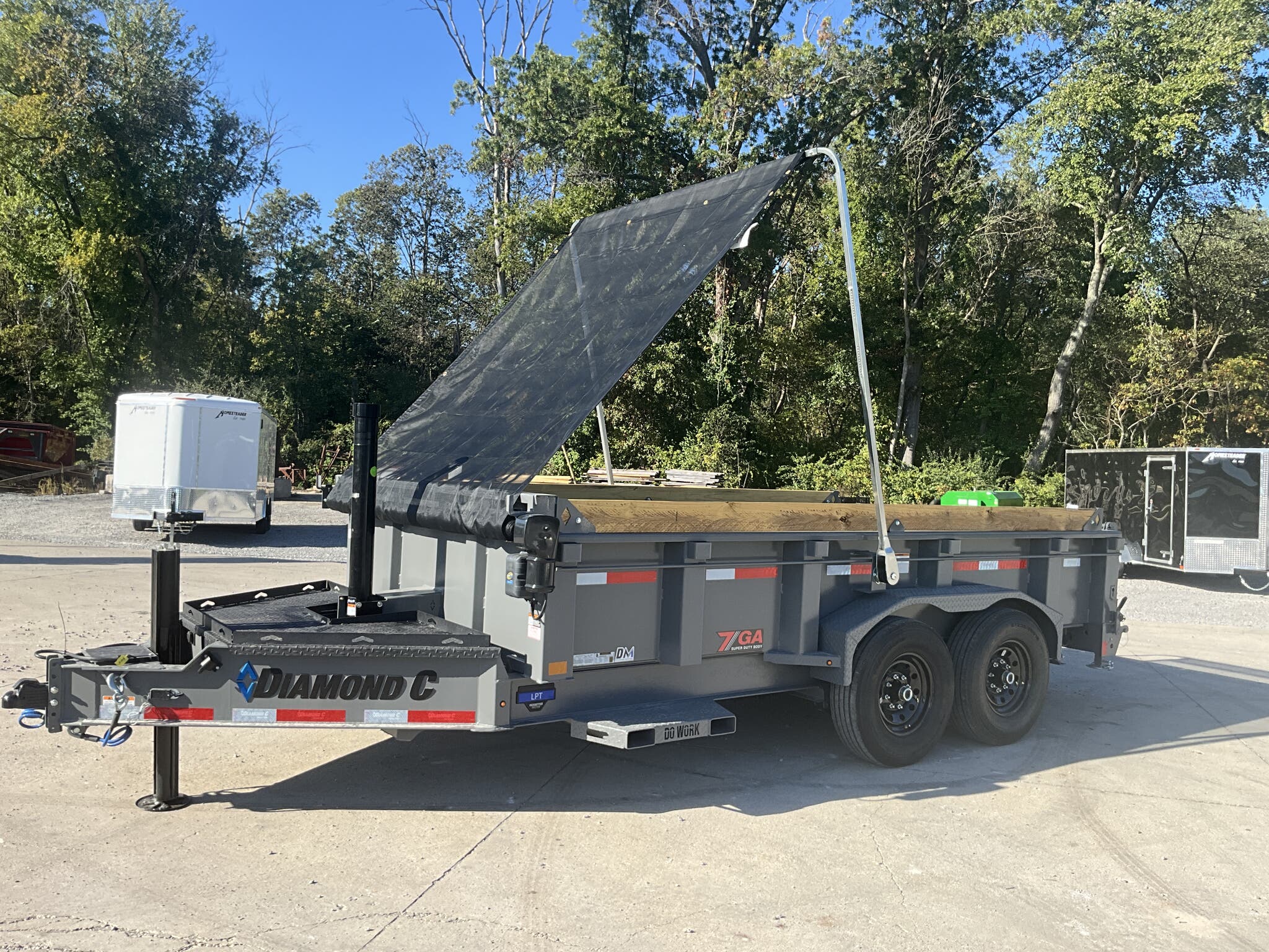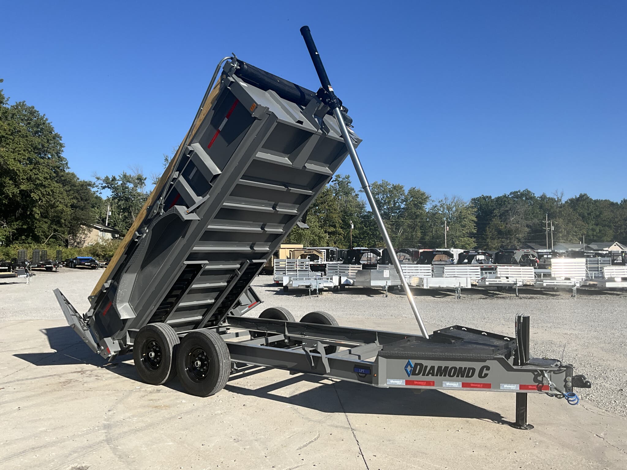 2026 Diamond C LPT207 14 82 Low Profile Telescopic Dump Trailer Pacesetter Edition Cement Gray For Sale in Illinois OVERVIEW: 2026 DIAMOND C LPT 14 82 TELESCOPIC DUMP TRAILER PACESETTER EDITION HEAVY DUTY LOW PROFILE DUMP WITH TELESCOPIC HOIST, ELECTRIC TARP, AND SOLAR CHARGER CEMENT GRAY DIFFERENCE MAKER POWDERCOAT FINISH SPECIFICATIONS: Axles: (2) 7,000 lb drop axles with electric brakes Suspension: 6 leaf slipper roller springs Frame: 8 15# I beam main frame with 16 center crossmembers GVWR: 14,900 lbs Coupler: 2 5/16 21K Demco EZ Latch adjustable channel coupler Jack: Single 20K hydraulic jack Hoist: Telescopic cylinder power up, gravity down with Bluetooth wireless controller Sides/Floor: 24 tall, 7 GA (3/16 ) steel sides + 3/16 steel floor Gate: 3 way rear dump gate Ramps: 72 rear slide in channel ramps Board Brackets: Includes boards and raised front panel Fenders: 3/16 diamond plate super heavy duty Stabilizer Jacks: Drop leg pair Fork Holder Step: Driver side Tie Downs: (4) standard 5/8 D rings Tires/Wheels: ST235/80R16 14 ply radial tires on black wheels + matching spare Battery: Group 27 deep cycle battery + SolarPulse 7 watt charger Tarp System: 20 electric long arm tarp, black mesh Color: Cement Gray WEIGHTS: Empty Weight: ~4,350 lbs GVWR: 14,900 lbs Payload Capacity: ~10,550 lbs Tongue Weight Capacity (10% of GVWR Bumper Pull): 1,490 lbs Total Effective Payload: ~12,040 lbs DELIVERY RATES FROM ZIP CODE 62864: Up to 100 miles $150 101 to 300 miles $2.00 per mile 301 to 1,200 miles $3.00 per mile Over 1,200 miles $4.00 per mile (Lower 48 states only)