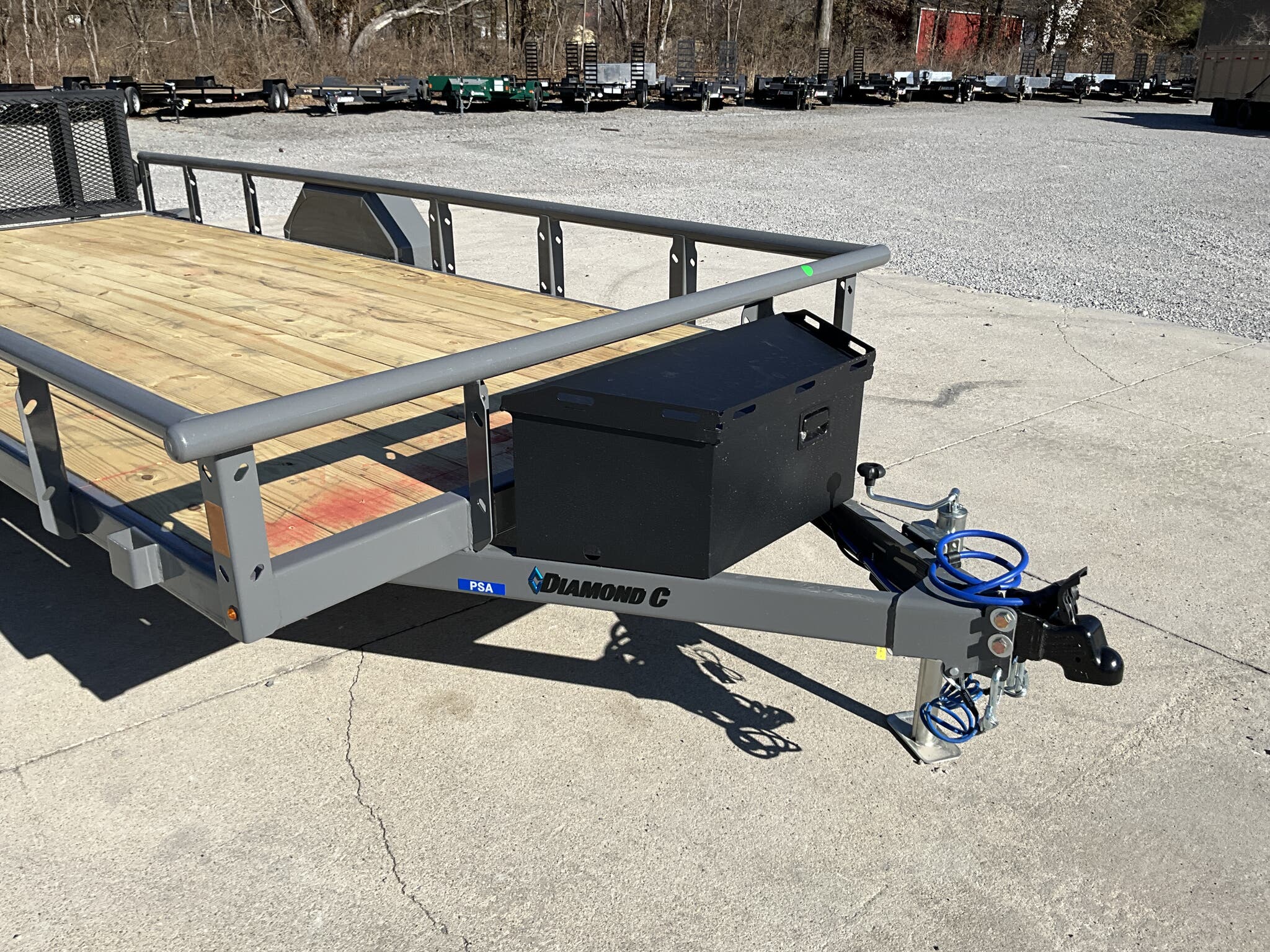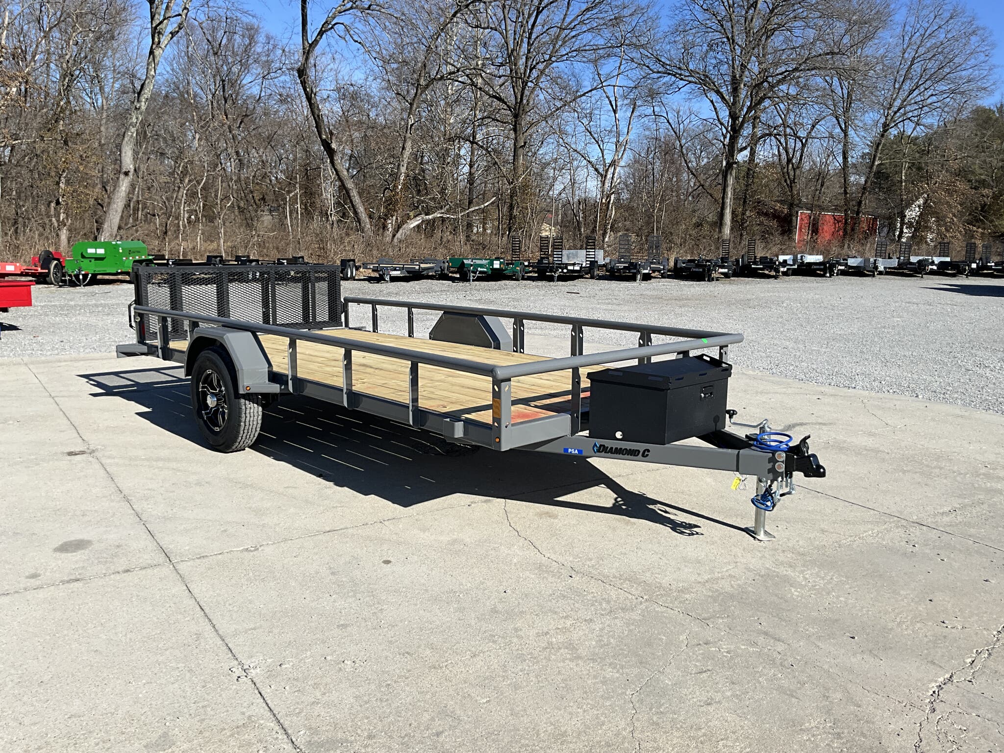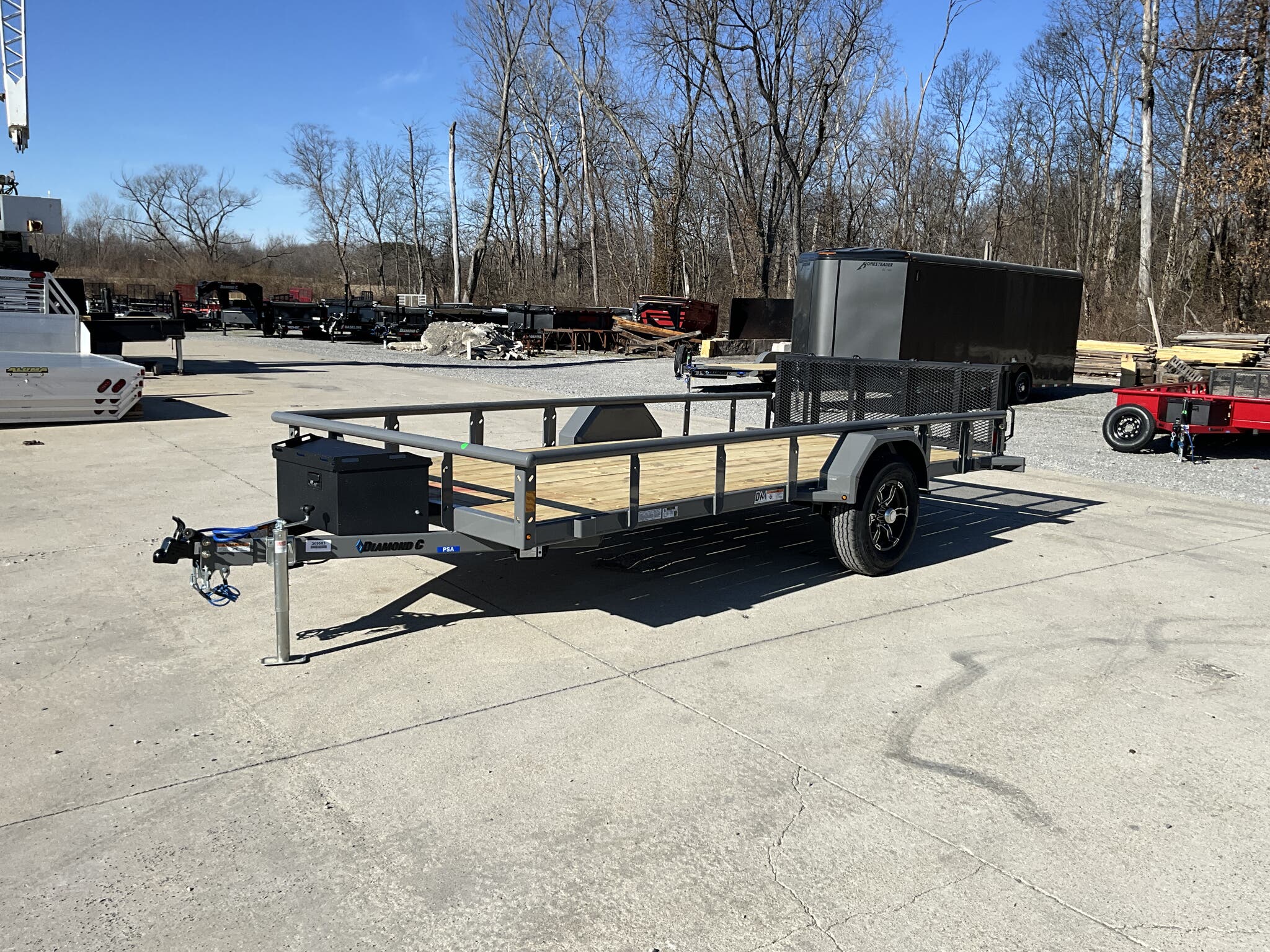 2026 DIAMOND C PSA106 14' 77" Utility Trailer, Cement Gray, Single 6K Axle w/ Electric Brake For Sale in Illinois Feature: Retractable under frame spare cable winch Feature: Lockable 10" 13" steel tongue box Feature: 48" bi fold ramp gate Specs Frame: 4" channel with 2" channel crossmembers on 24" centers Specs Top Rail: 2 3/8" pipe open sides Specs Jack: 2K flip jack (top wind) Specs Tires/Wheels: ST225/75R15 aluminum wheels Specs Lighting: All LED Specs Finish: Cement Gray Specs Web ID: 347348 Specs Warranty: 6 year manufacturer warranty (2026+) Weights & Capacities Total Axle Capacity: 6,000 lb Weights & Capacities Empty Weight: 1,500 lb Weights & Capacities Payload on Axles: 4,500 lb Weights & Capacities Tongue Load (10%): 600 lb Weights & Capacities Total Payload Including Tongue: 5,100 lb Delivery from 62864 (Lower 48): Up to 100 miles $150 Delivery from 62864 (Lower 48): 101 300 miles $2.00/mile Delivery from 62864 (Lower 48): 301 1200 miles $3.00/mile Delivery from 62864 (Lower 48): Over 1200 miles $4.00/mile