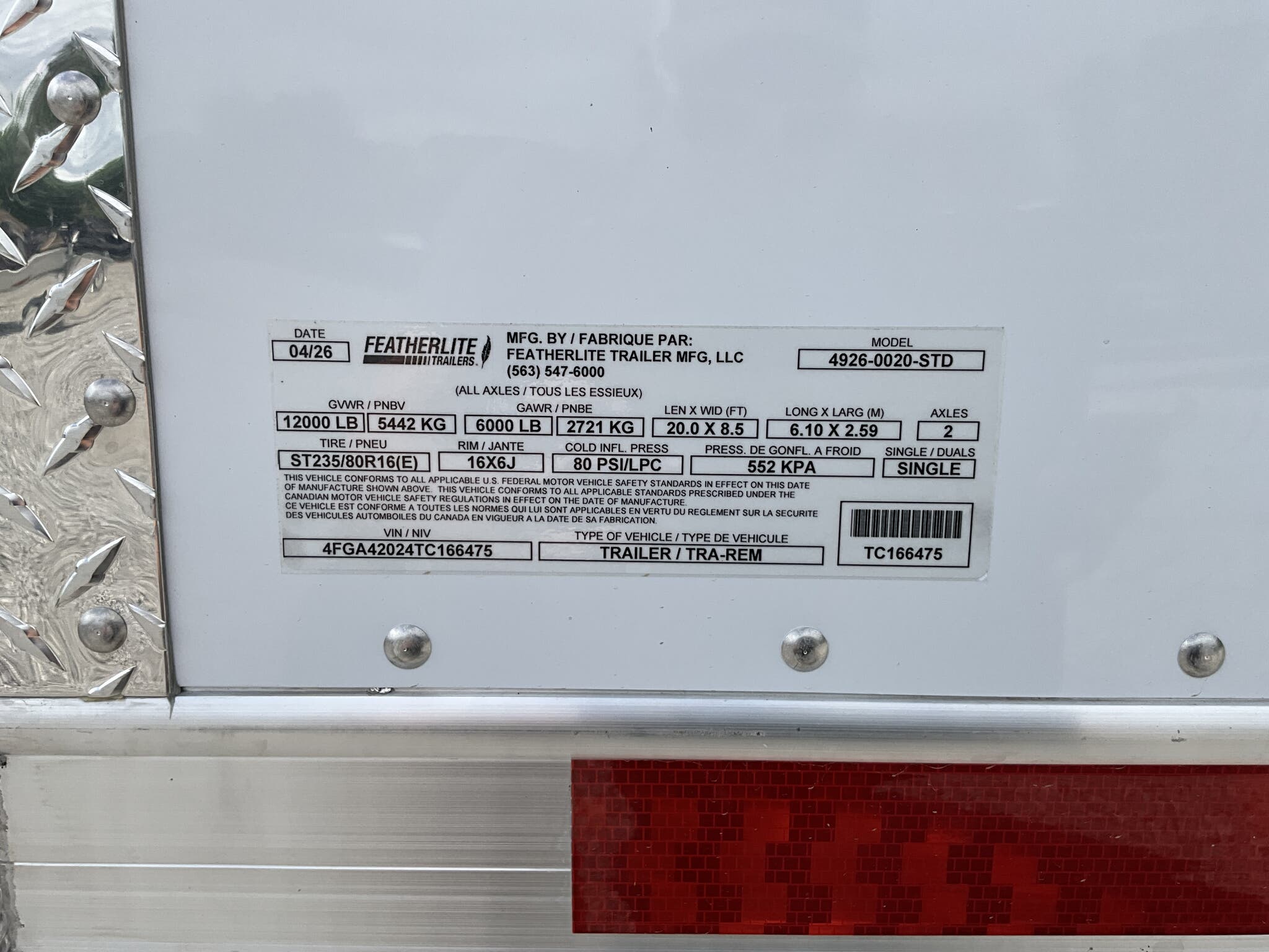2026 FEATHERLITE MODEL 4926 ENCLOSED CAR HAULER, 12,000 GVWR, 8'6" × 20' × 7' ALL-ALUMINUM ENCLOSED TRAILER — FOR SALE IN MOUNT VERNON, IL 62864