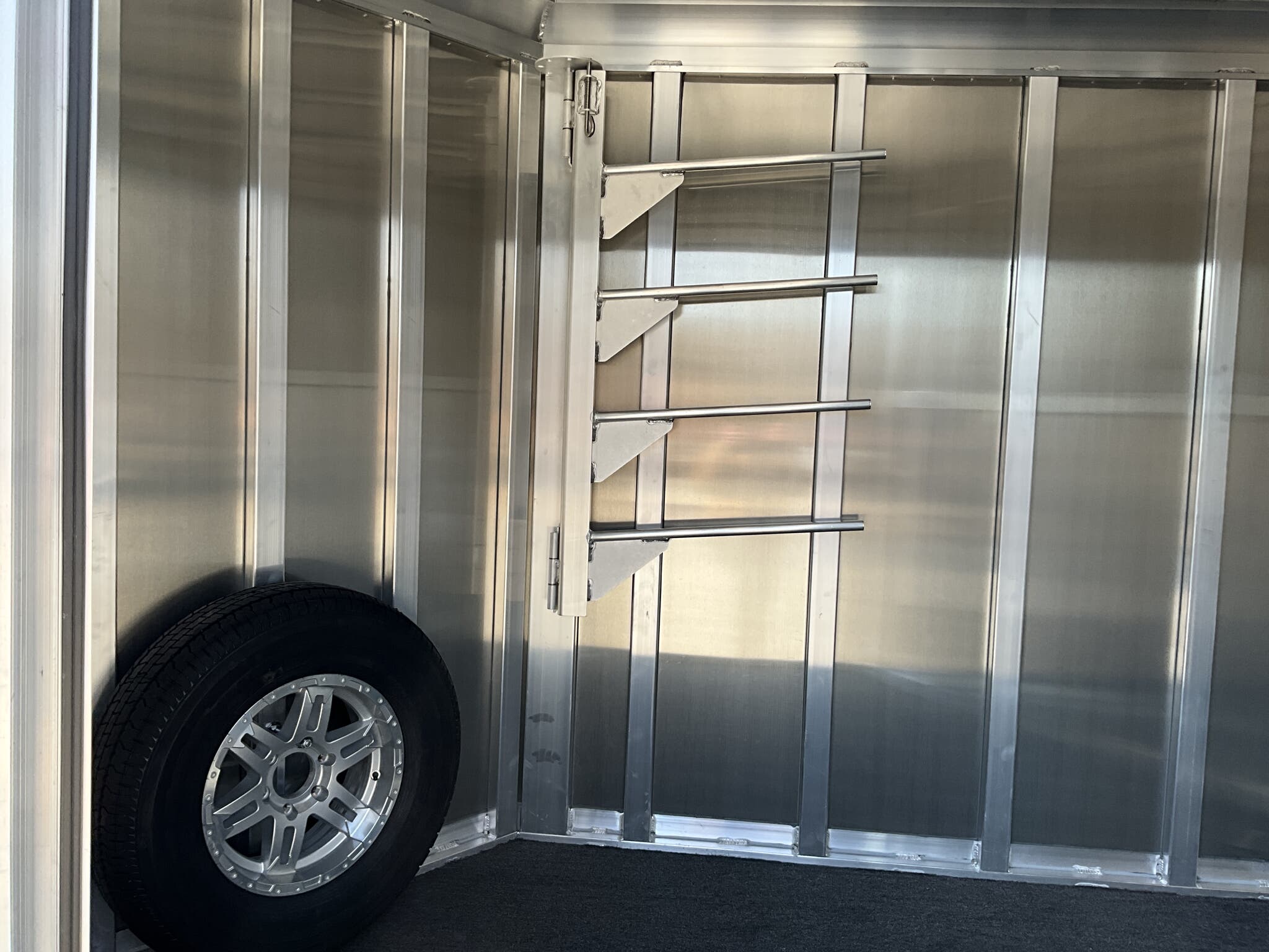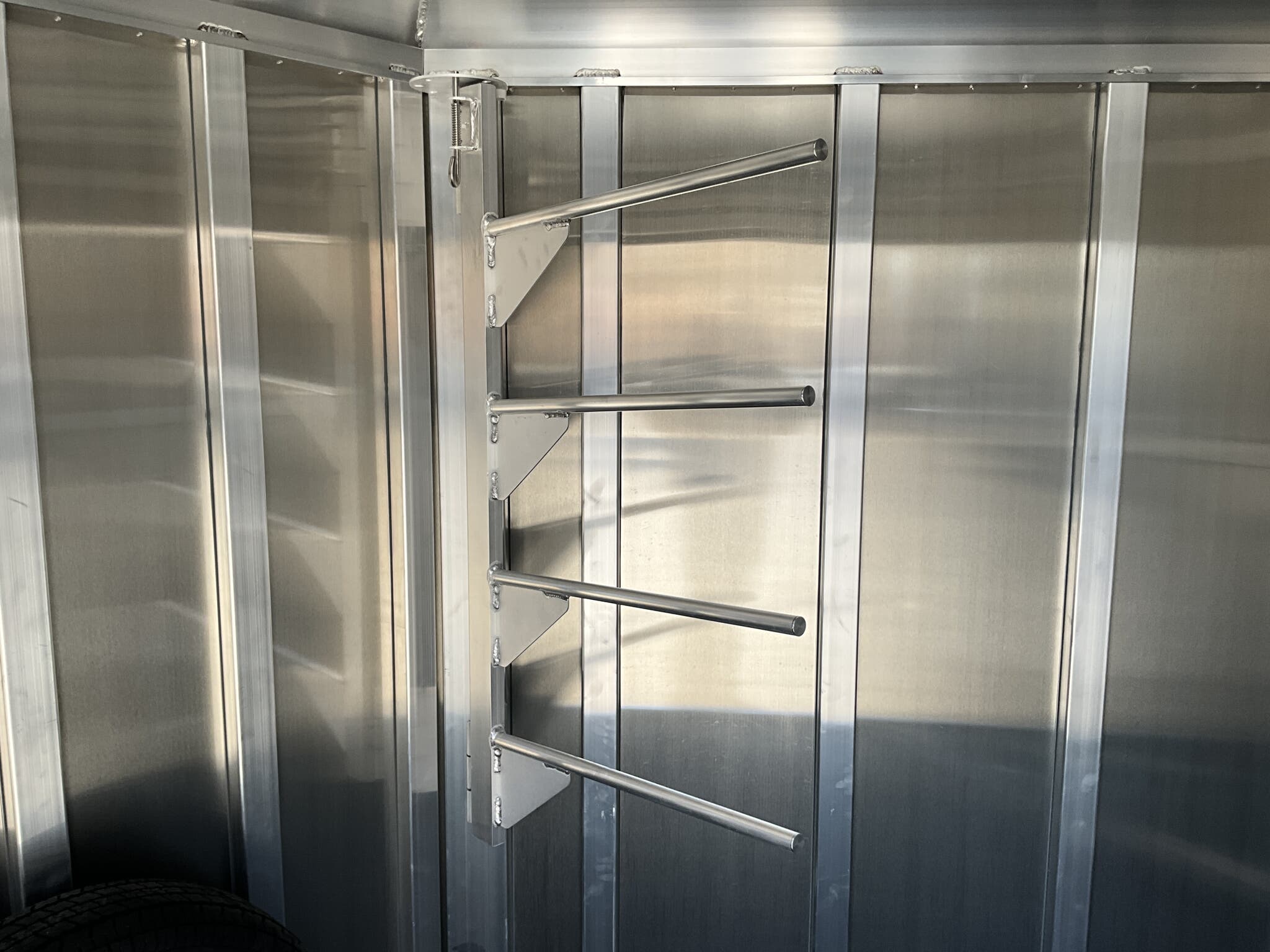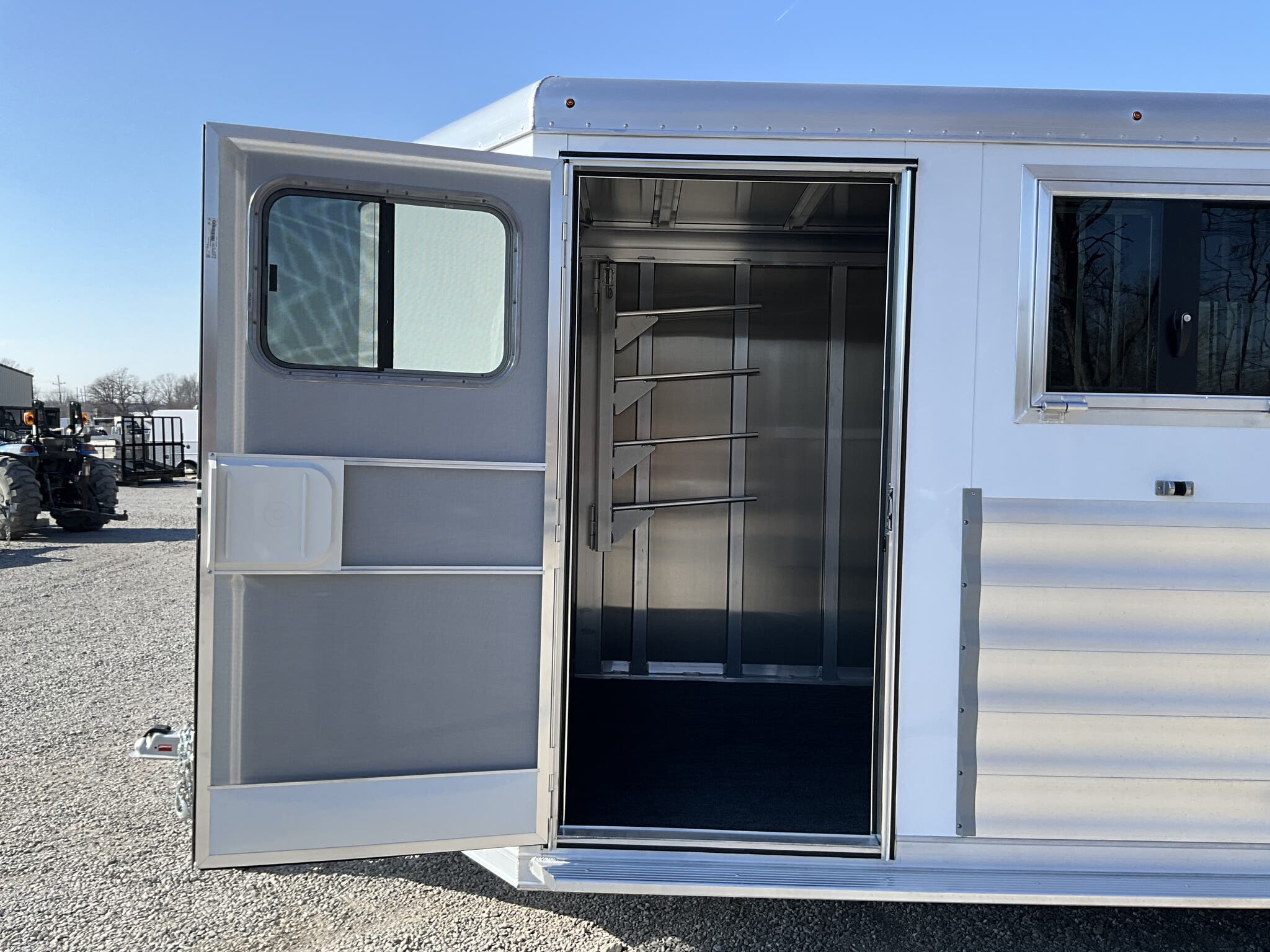 Specs — Dressing Room: Camper-style door with deadbolt; clothes rod; saddle racks; blanket bars; brush tray