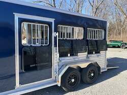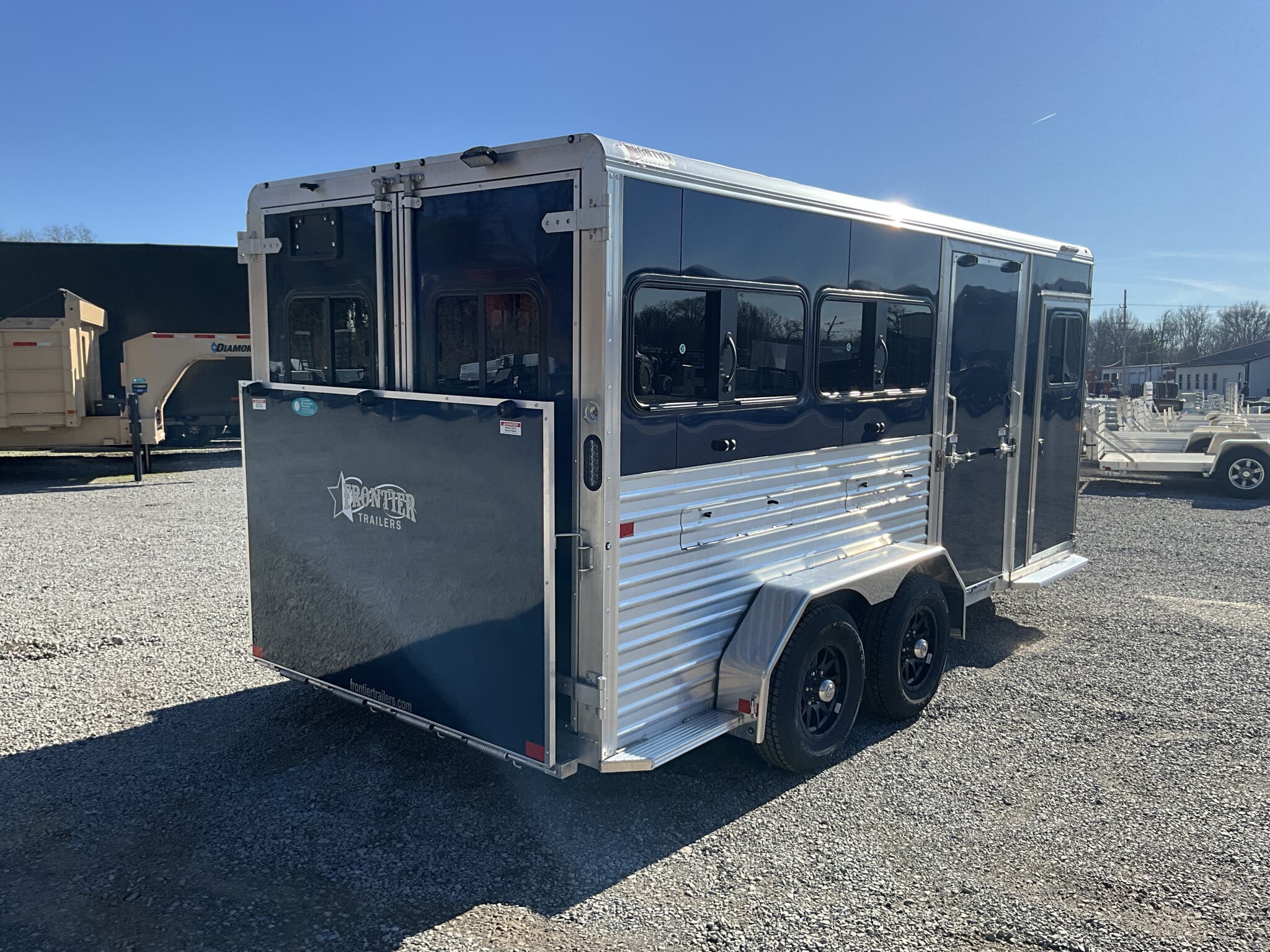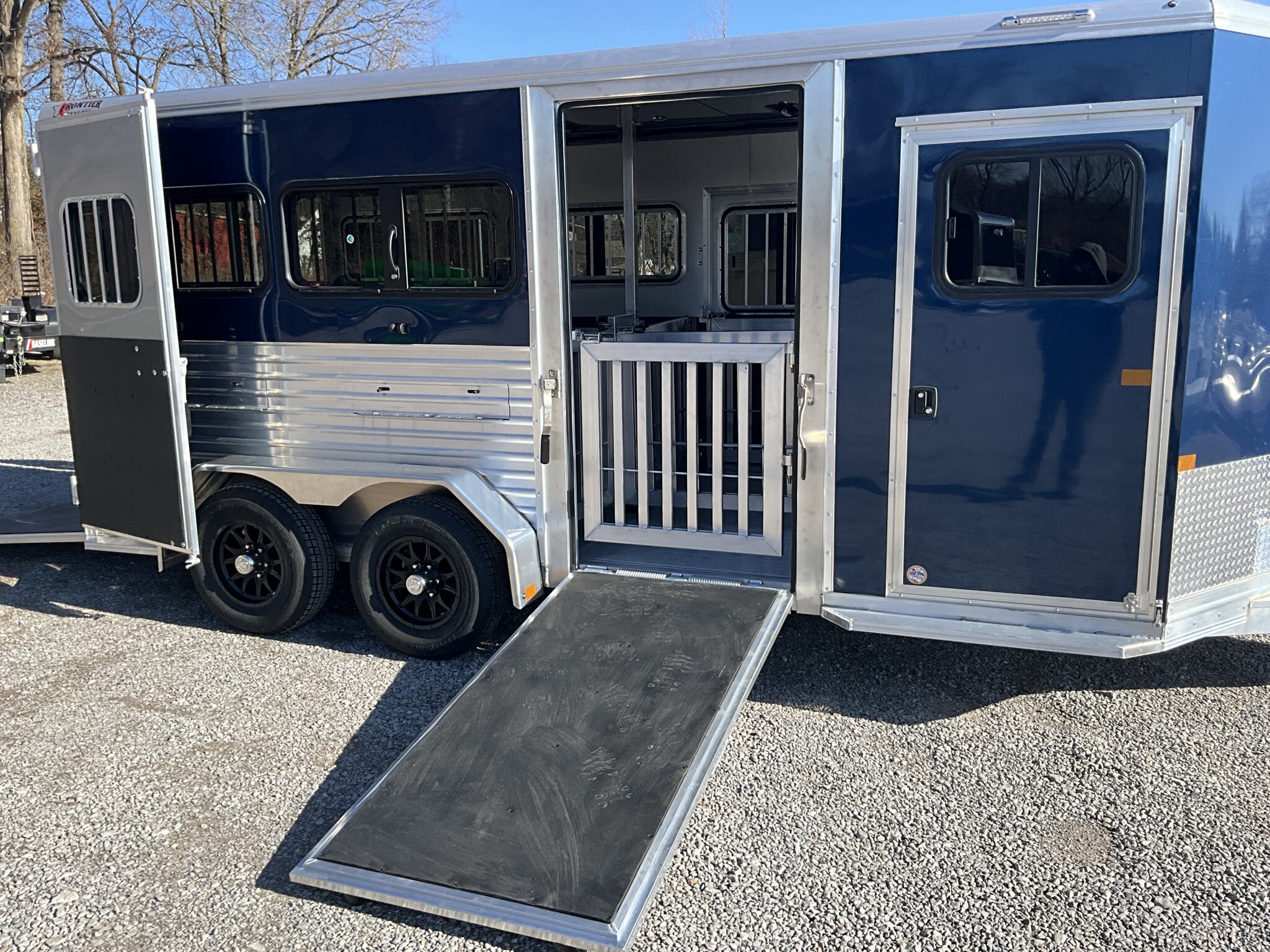 2026 FRONTIER LOW PRO 6-PEN SYSTEM TRAILER (DDFW) — 7×16 Bumper Pull, 78" Interior Height, Indigo Blue w/ Silver Graphics, Drop-Down Feed Windows, Side Ramp + Rear Ramp — For Sale in Illinois