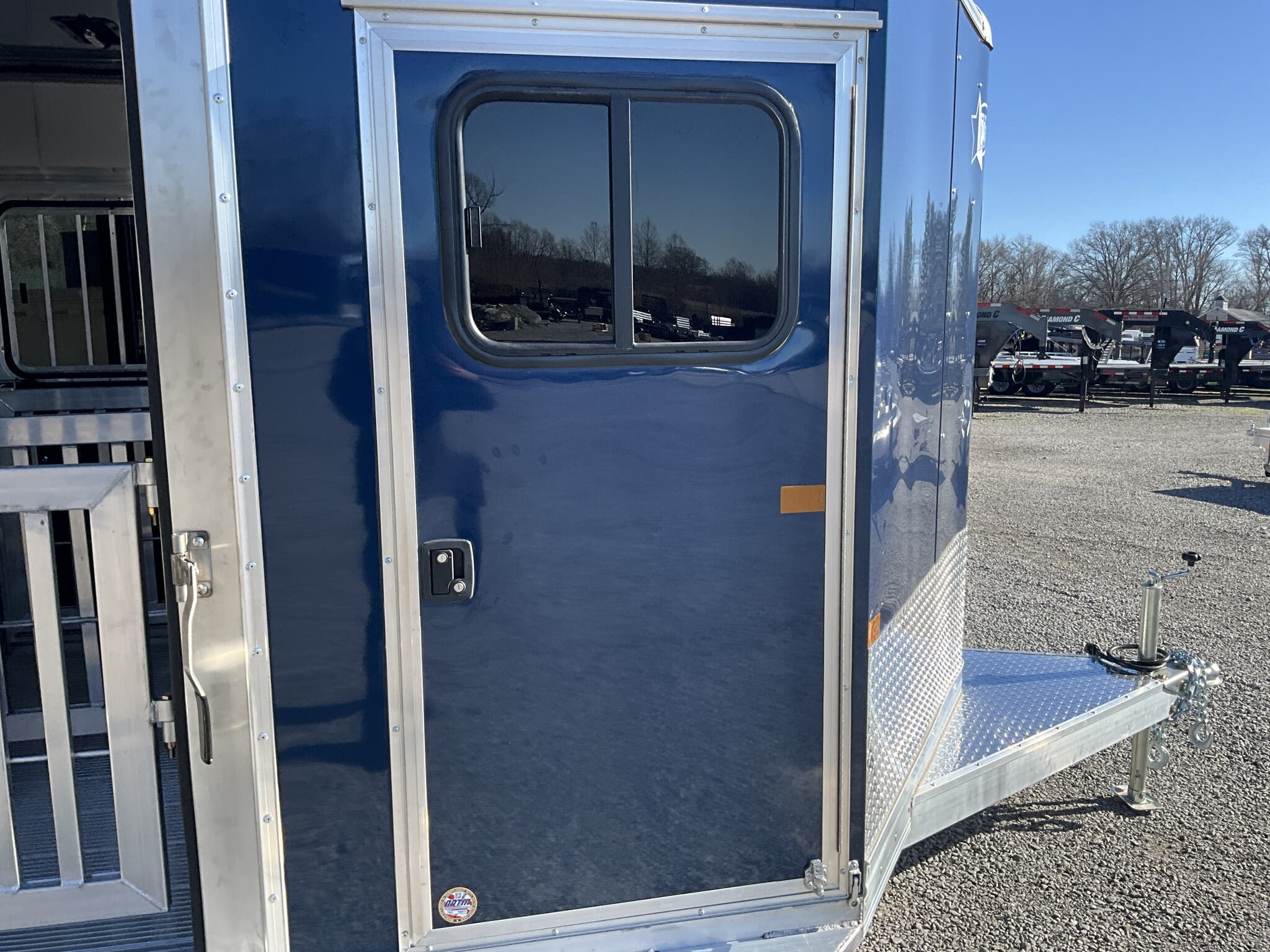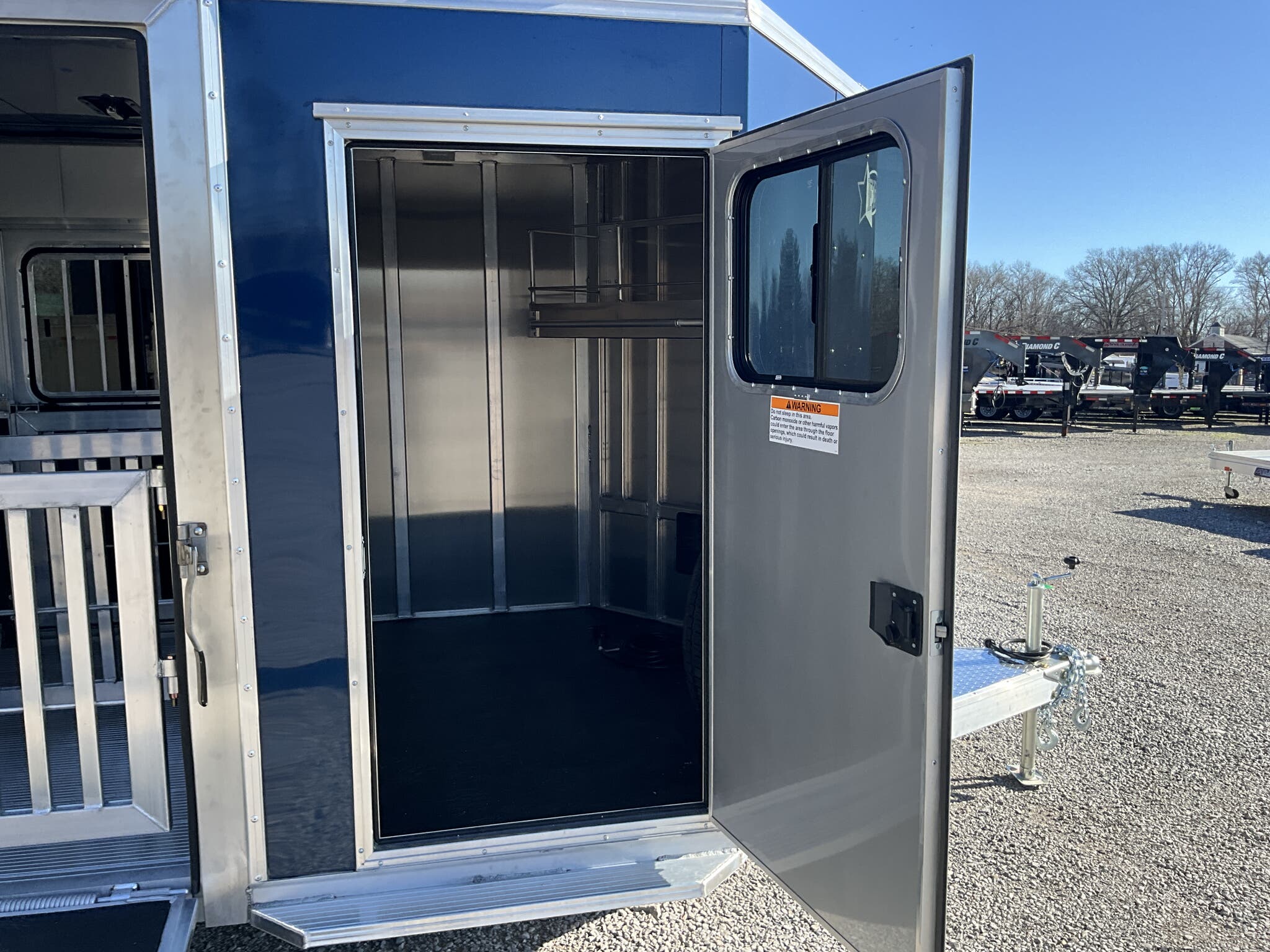 Specs — Tack Area: 44" tack; curbside tack door with sliding window & screen; rubber mats; LED dome light; 20" × 64" interior tack access door
