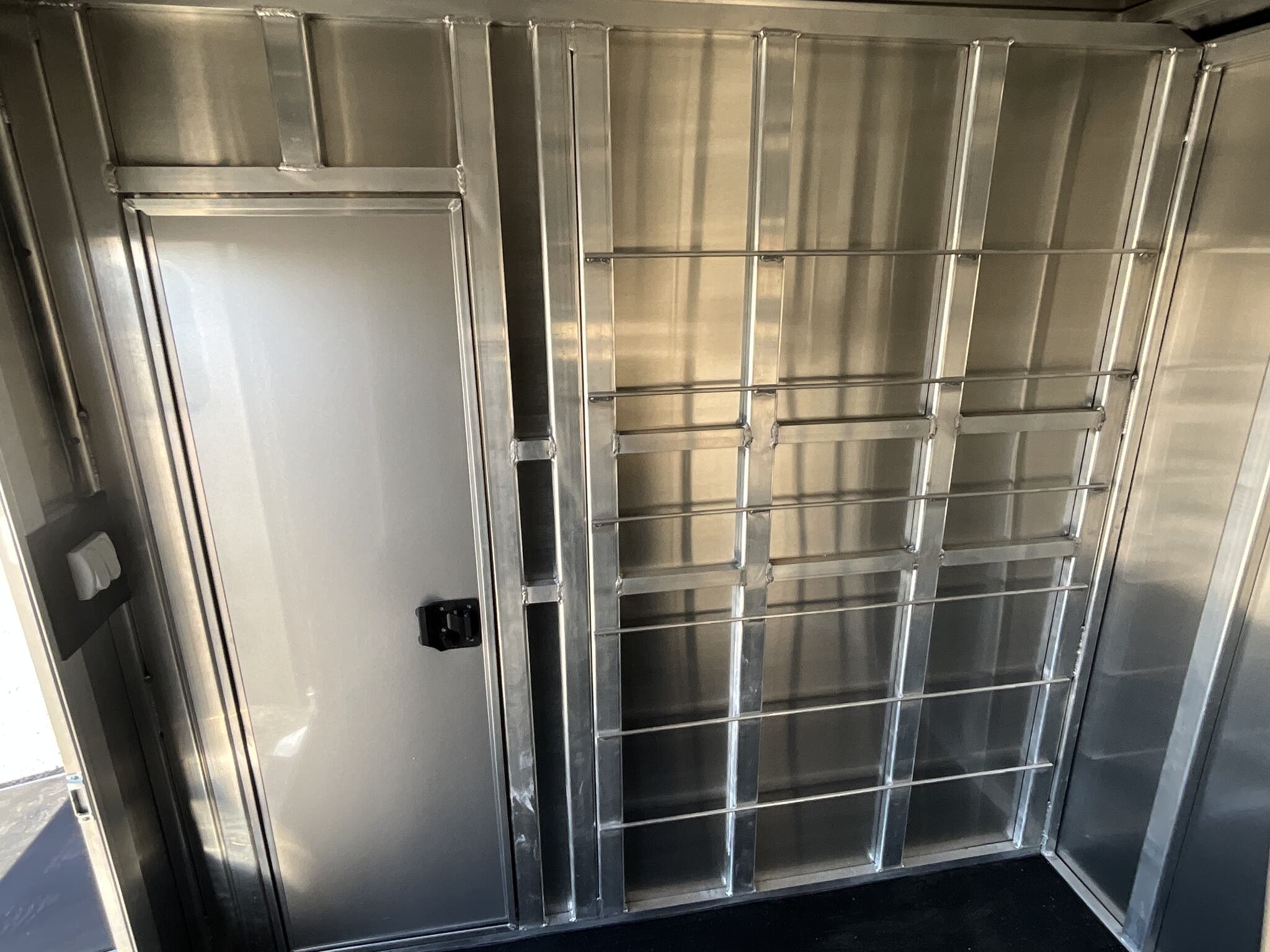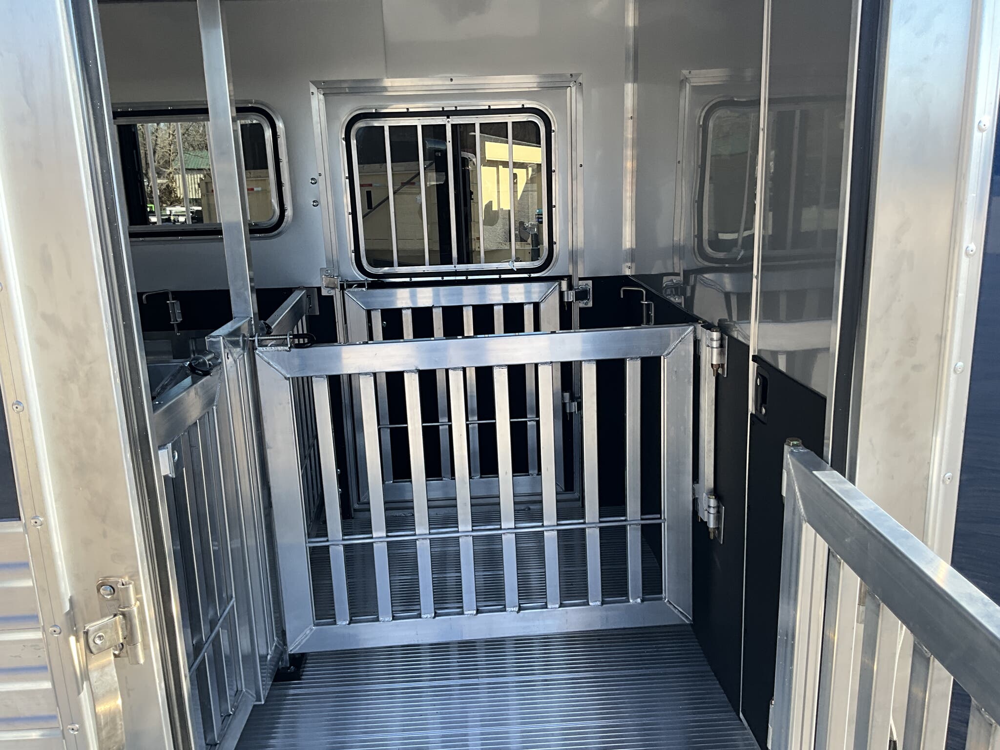 Specs — Doors: 50/50 double rear doors with sliding windows and bars