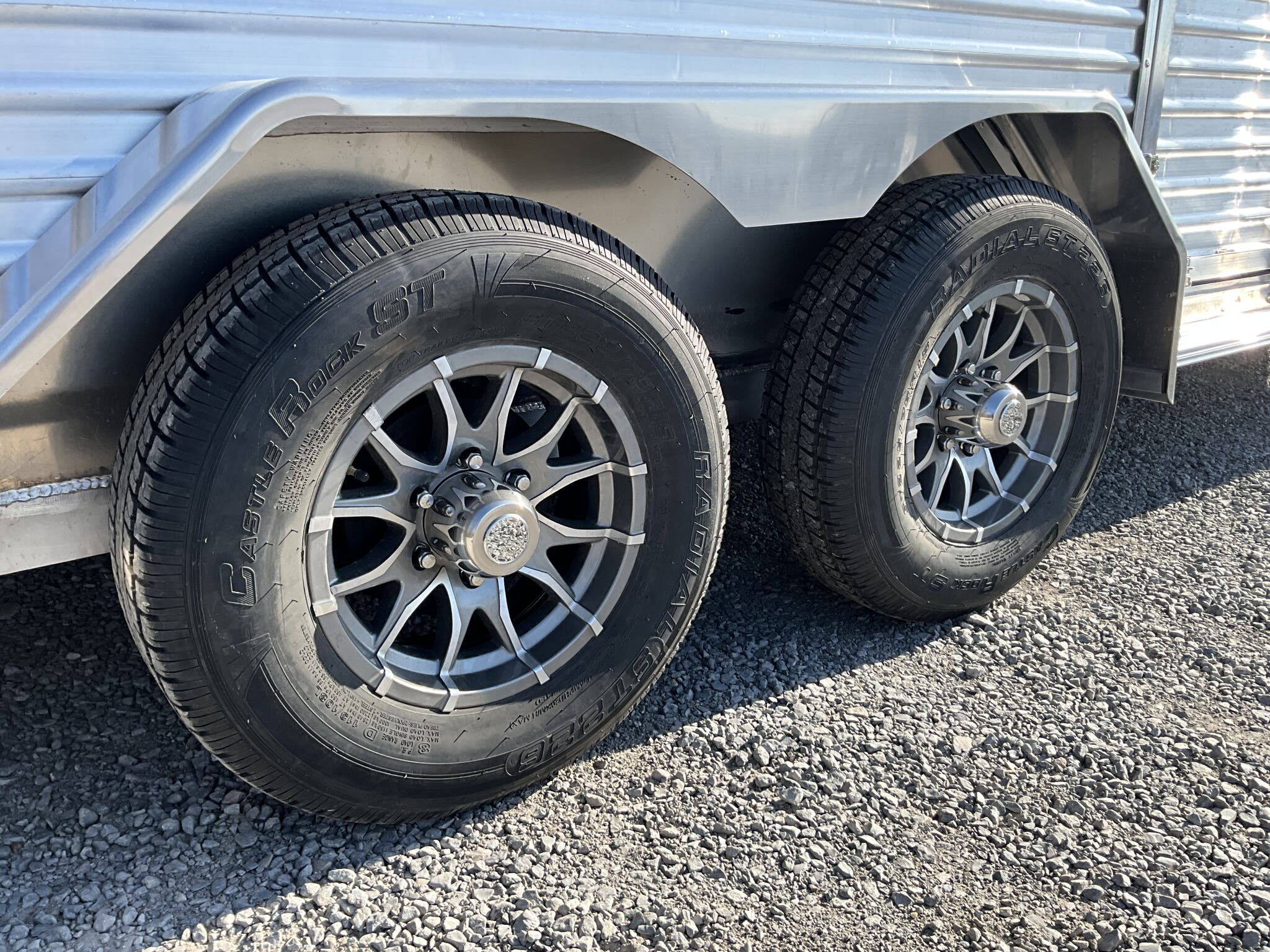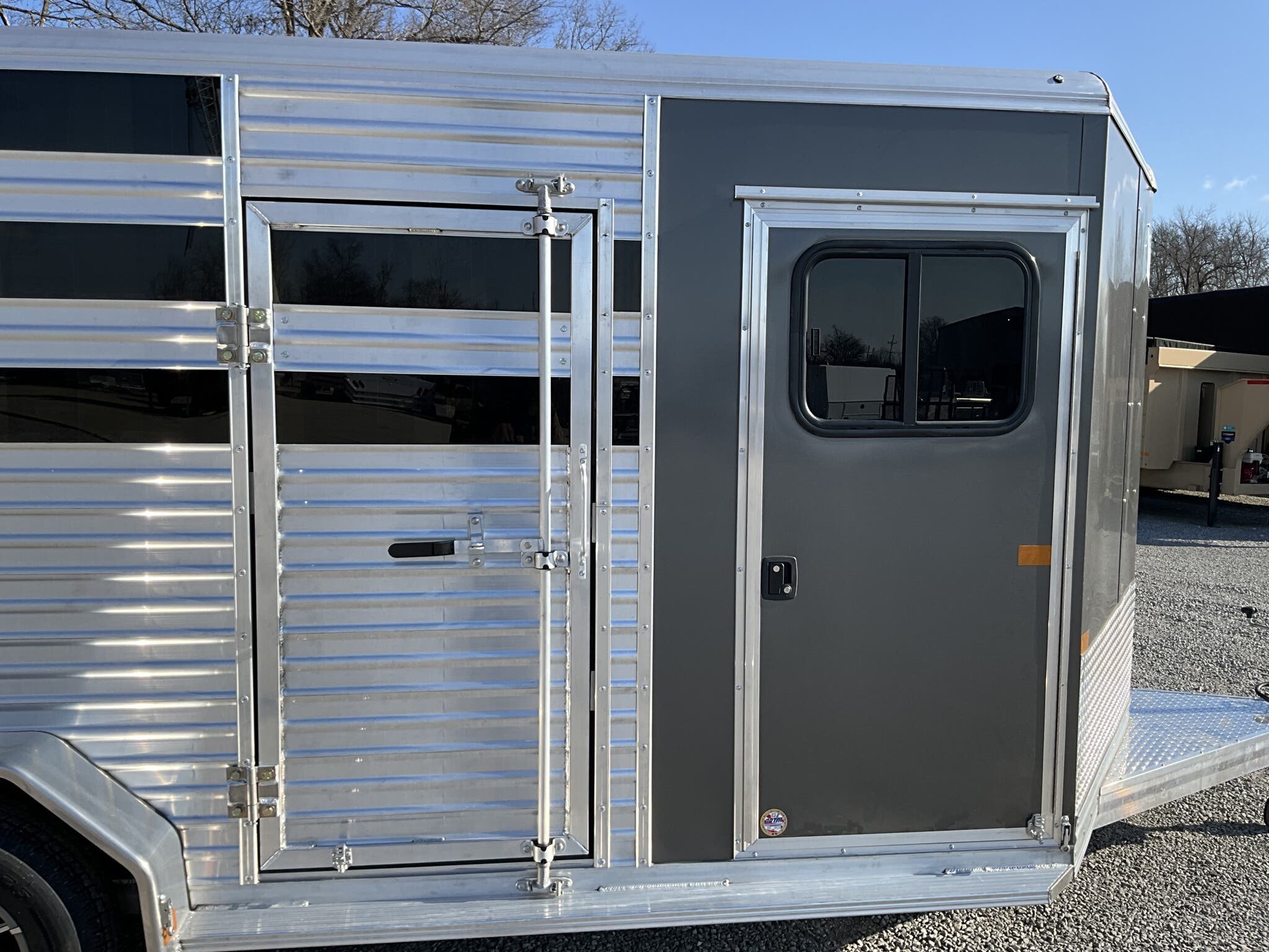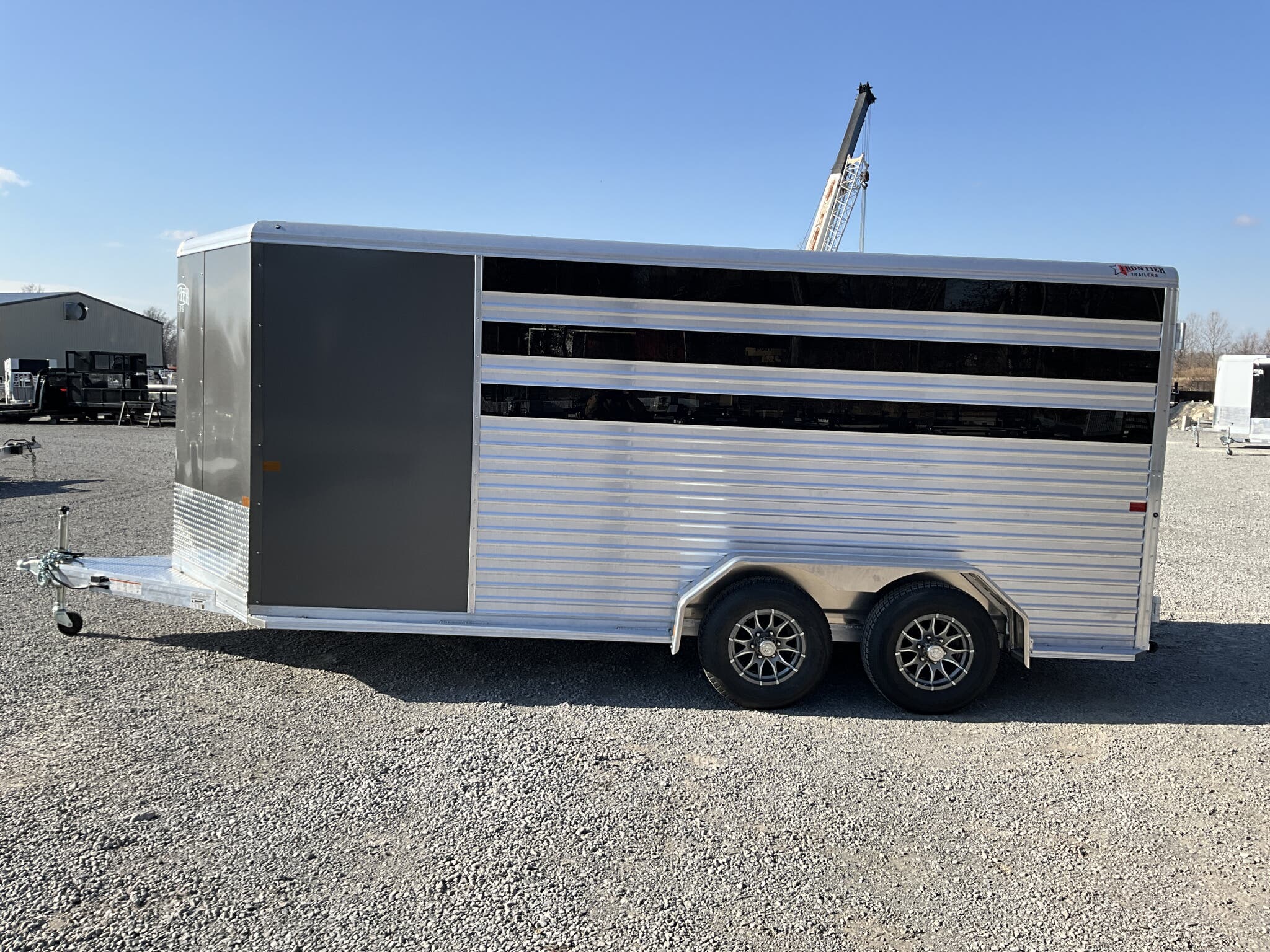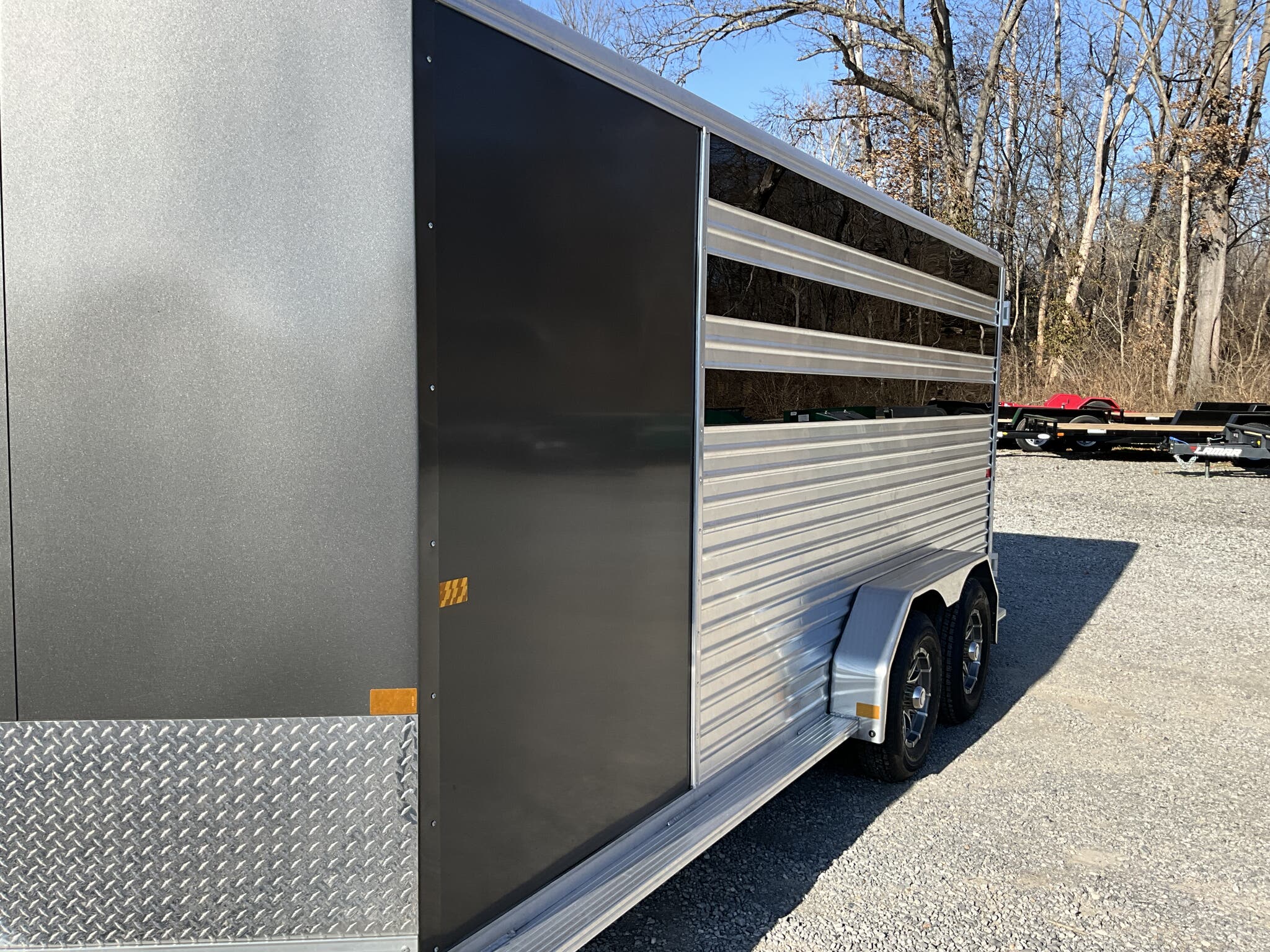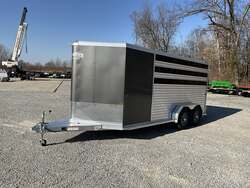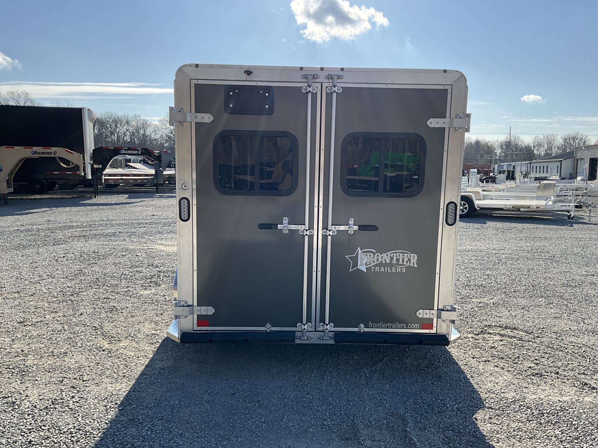 2026 FRONTIER LOW PRO LIVESTOCK TRAILER w/ PEN SYSTEM 7' 16', 78" Interior Height, Charcoal w/ Silver Graphics, Bumper Pull, Tandem Torsion Axles For Sale in Illinois Feature: Low Pro livestock trailer with adjustable pen/stall system 60/40 or 50/50 split Feature: +6" box height upgrade for full 78" interior height Feature: Curbside tack door + curbside escape door Feature: Extended tongue (+6") with center beam upgrade Feature: 110V power package with shore line and interior outlets Specs Interior Size: 16' floor length 7' wide 78" tall Specs Construction: All box tube aluminum chassis Specs Floor: Extruded aluminum decking; 12" O.C. I beam crossmembers Specs Roof: One piece .040 aluminum roof with heavy duty radius extrusion Specs Ceiling: White .030 aluminum ceiling liner with insulation (horse area) Specs Exterior: .040 pre painted aluminum side sheets; V nose with 24" stone guard Specs Axles/Brakes: (2) 3,500 lb Dexter torsion axles; electric brakes on all wheels Specs Tires/Wheels: ST225/75R15 tires on aluminum wheels; matching spare included Specs Spare Mount: Interior floor level spare mount in tack area Specs Doors: 32" 64" livestock access door; 50/50 double rear doors with slider Specs Gates/Pens: New 4' adjustable stalls with spring latch system; escape door pen gate with U bolt spring latches Specs Ventilation: (3) air gaps with Plexitrac for plexiglass sides Specs Tack Area: 44" tack with rubber mats; LED dome light with wall switch Specs Electrical: 110V power package (30 amp breaker box, 25' shore line, standard outlet, GFI outlet); brace & stub wiring for future A/C Specs Lighting: Full LED exterior lighting; full length LED strip lights in stock area (both sides) Specs Tongue/Jack: Extended tongue; top winding jack with wheel Specs Exterior Features: Full length running boards; heavy duty rear step up rubber bumper Specs Finish: Charcoal exterior with silver graphics Specs Warranty: 8 year limited manufacturer warranty Weights & Capacities Total Axle Capacity: 7,000 lb Weights & Capacities Empty Weight: 2,931 lb Weights & Capacities Payload on Axles: 7,000 2,931 = 4,069 lb Weights & Capacities Tongue Load (Bumper Pull @ 10%): 700 lb Weights & Capacities Total Payload Including Tongue: 4,769 lb Delivery from 62864 (Lower 48): Up to 100 miles $150 101 300 miles $2.00/mile 301 1200 miles $3.00/mile Over 1200 miles $4.00/mile