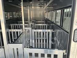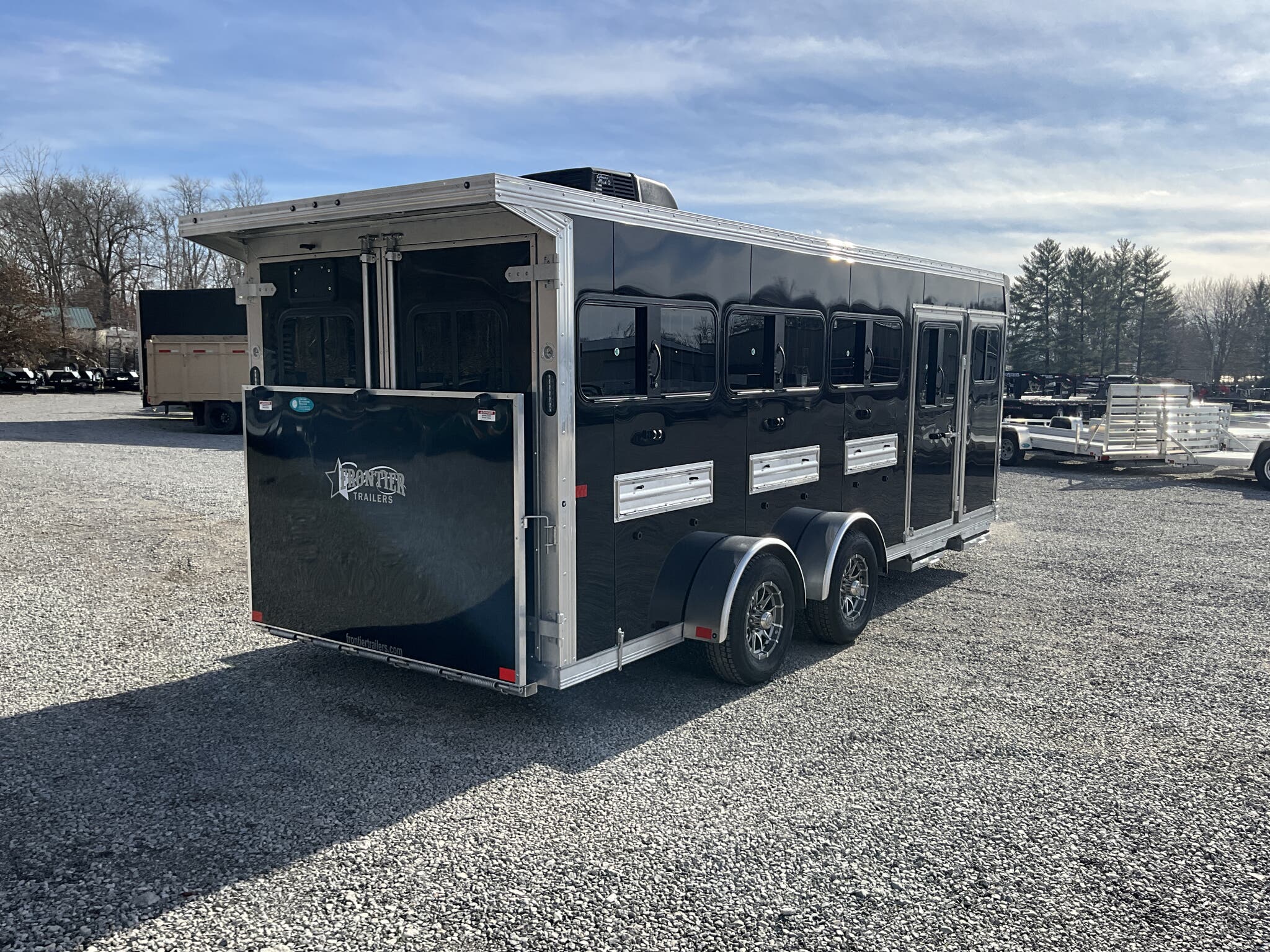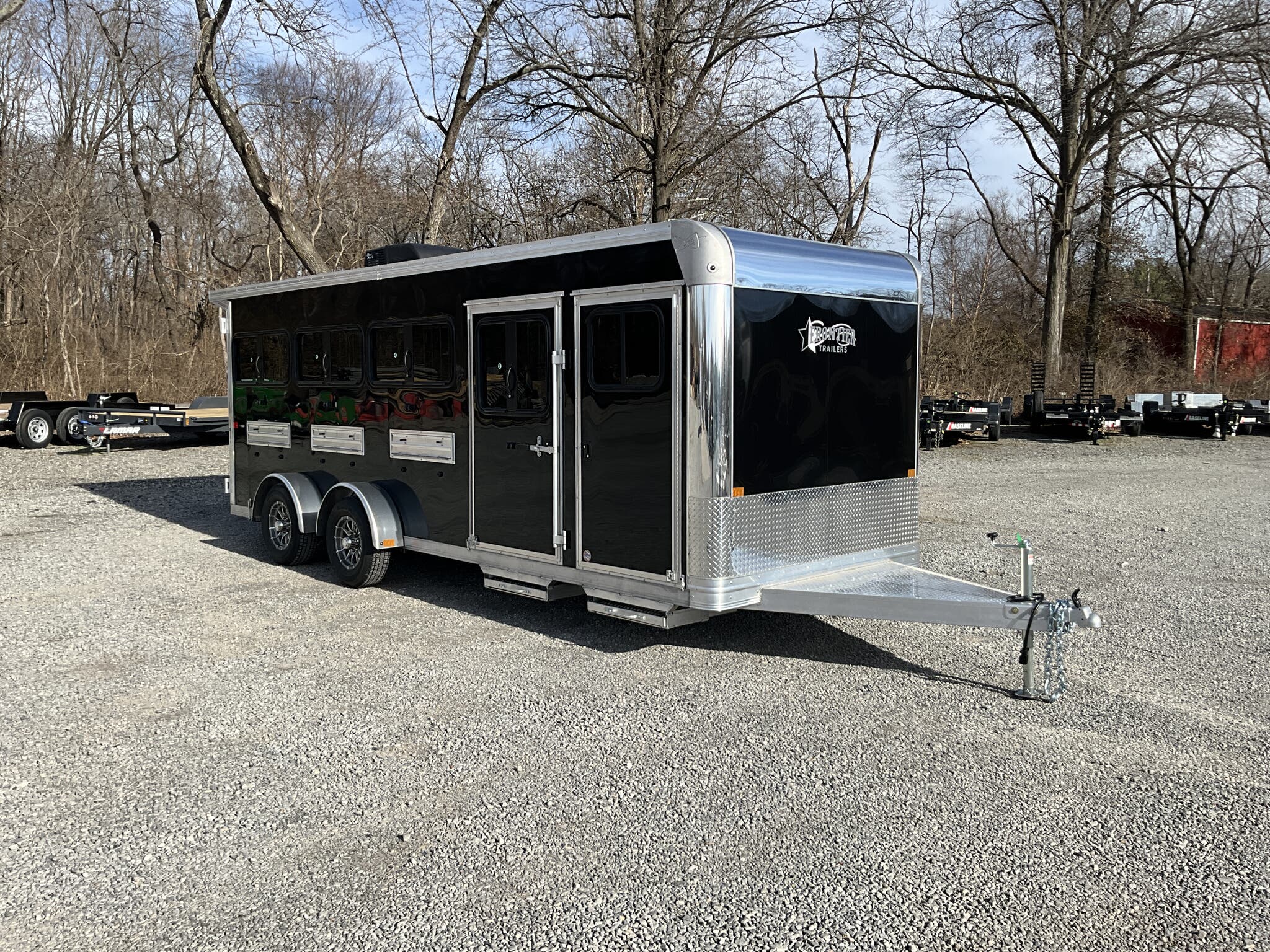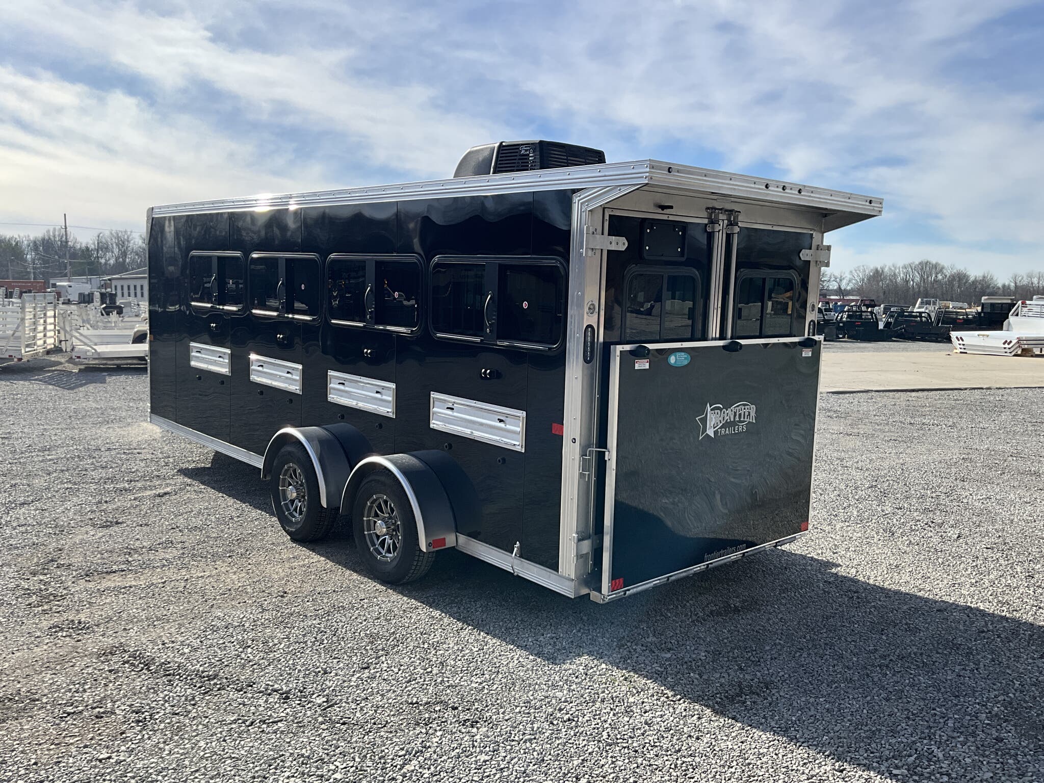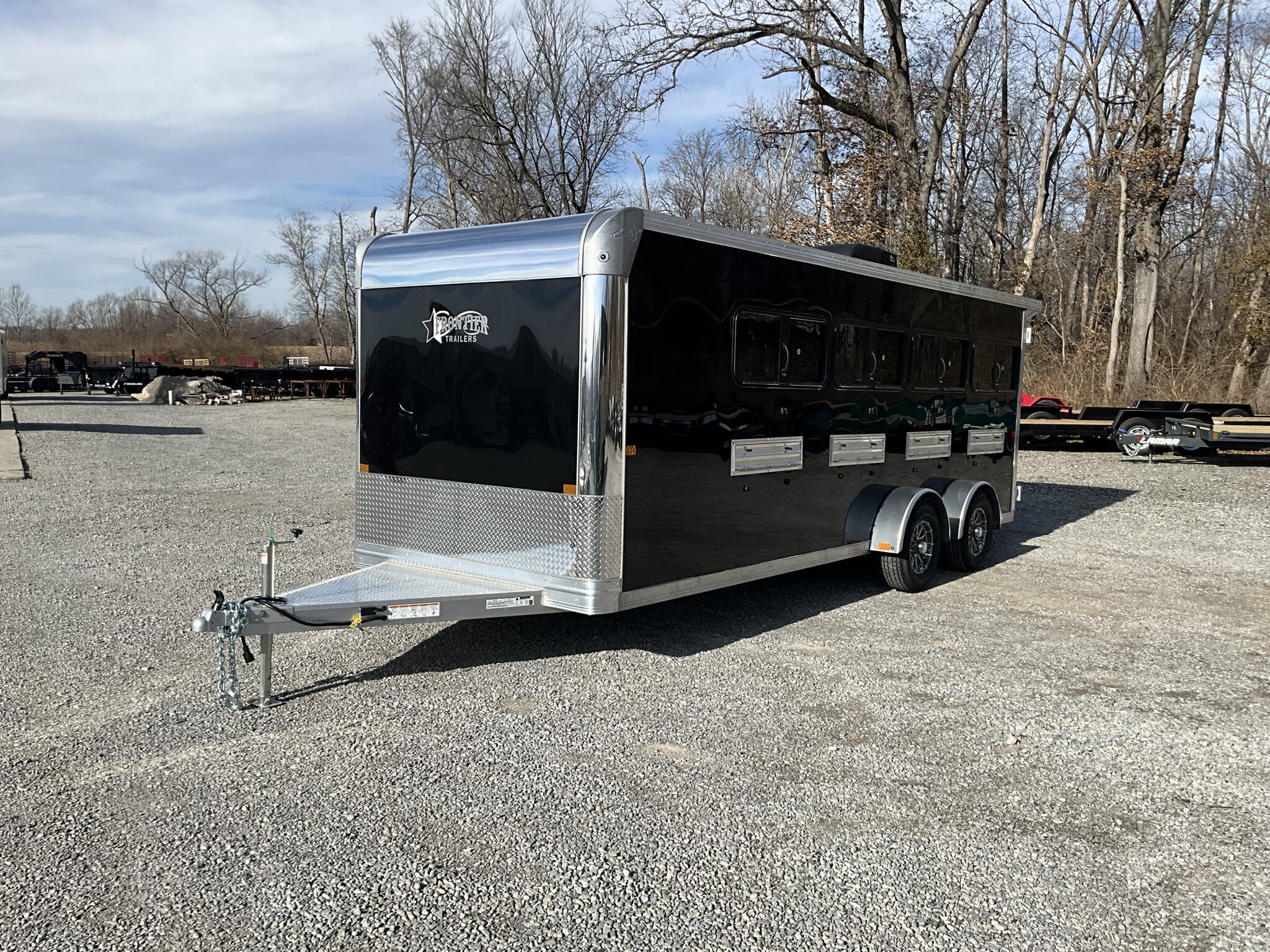 2026 FRONTIER 7 20 LOW PRO 8 PEN SYSTEM TRAILER JACKPOT PACKAGE Drop Down Feed Windows, 78" Interior Height, Bumper Pull, Tandem Torsion Axles For Sale in Illinois Feature: Low Pro 8 pen system trailer with adjustable stall/pen layout Feature: NEW Jackpot Package with 110V power, A/C, ramp, canopy, and upgraded lighting Feature: 13,500 BTU Penguin II roof A/C with 30A power system Feature: Drop down feed windows per pen Feature: Ramp behind double rear doors Feature: Rear canopy system with integrated lights Specs Interior Size: 20' floor length 7' wide 78" tall Specs Construction: All box tube aluminum chassis Specs Floor: Extruded aluminum decking; 12" O.C. I beam crossmembers Specs Roof: One piece .040 aluminum roof with heavy duty radius extrusion Specs Exterior: Lower half extruded aluminum sides; .040 aluminum upper skin & V nose; 24" stone guard Specs Axles/Brakes: (2) 3,500 lb Dexter torsion axles; electric brakes on all wheels with breakaway kit Specs Tires/Wheels: ST225/75R15 tires on aluminum rims (6 lug); matching spare & mount included Specs Doors: 50/50 double rear doors with sliding windows and bars Specs Feed Windows: 45" 18" drop down feed window per pen; 30" 24" feed window at escape door Specs Ventilation: Double action pop up roof vent per pen; (1) air gap with flip down cover Specs Pen System: (8) adjustable pens with new 4' spring loaded latch system; escape door pen gate with U bolt spring latch tie backs Specs Tack Area: 44" tack; curbside tack door (32" 64") with sliding window & screen; rubber mats; LED dome light Specs Electrical (Jackpot): 110V package with (2) standard outlets, (2) GFI outlets, 30A breaker, 30A power converter Specs A/C (Jackpot): 13,500 BTU Penguin II roof A/C Specs Lighting: All LED exterior lights; full length interior LED strip lights both sides of pen area with exterior cup switch; recessed LED puck lighting Specs Exterior Features: Full length running boards; heavy duty rear step up rubber bumper Specs Tongue/Jack: Manual landing gear Specs Finish: Pre painted aluminum exterior Specs Warranty: 8 year limited manufacturer warranty Weights & Capacities Total Axle Capacity: 7,000 lb Weights & Capacities Empty Weight: 3,412 lb Weights & Capacities Payload on Axles: 7,000 3,412 = 3,588 lb Weights & Capacities Tongue Load (Bumper Pull @ 10%): 700 lb Weights & Capacities Total Payload Including Tongue: 4,288 lb Delivery from 62864 (Lower 48): Up to 100 miles $150 101 300 miles $2.00/mile 301 1200 miles $3.00/mile Over 1200 miles $4.00/mile