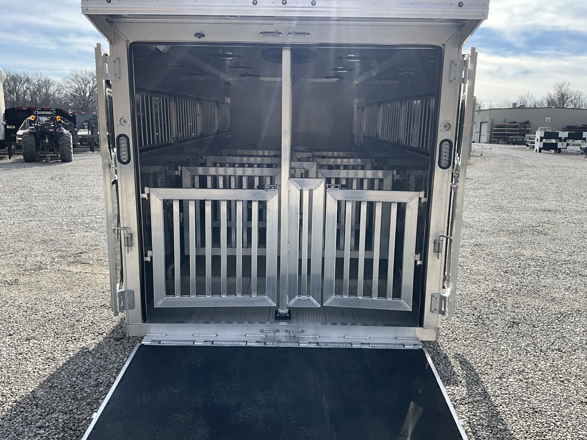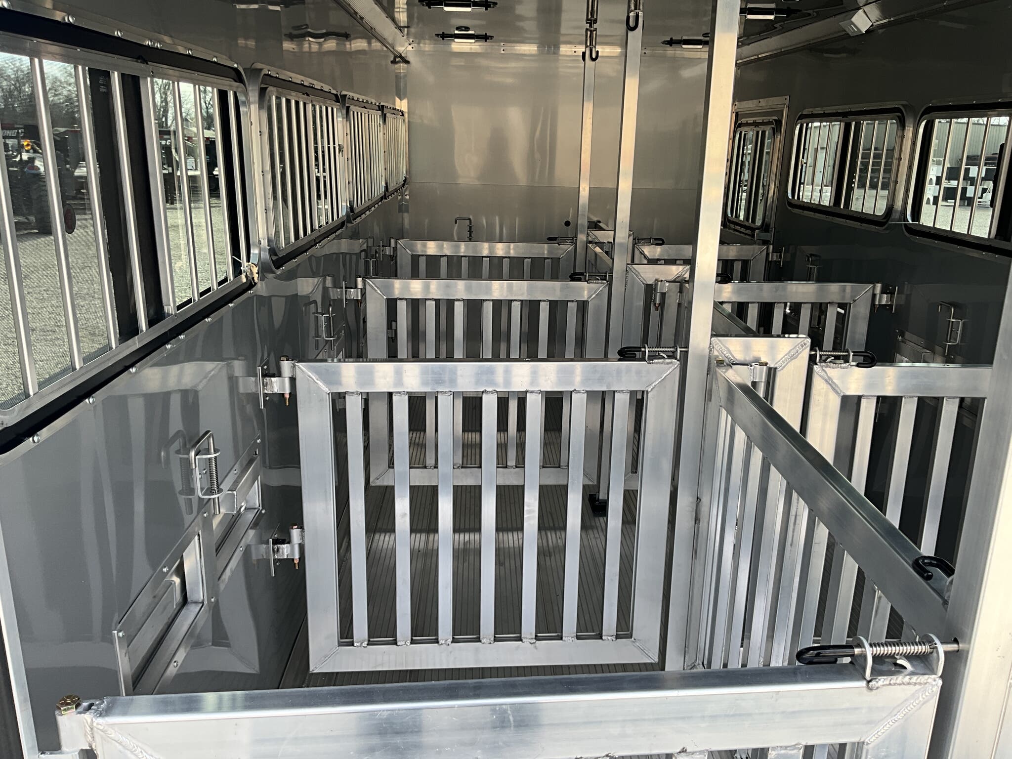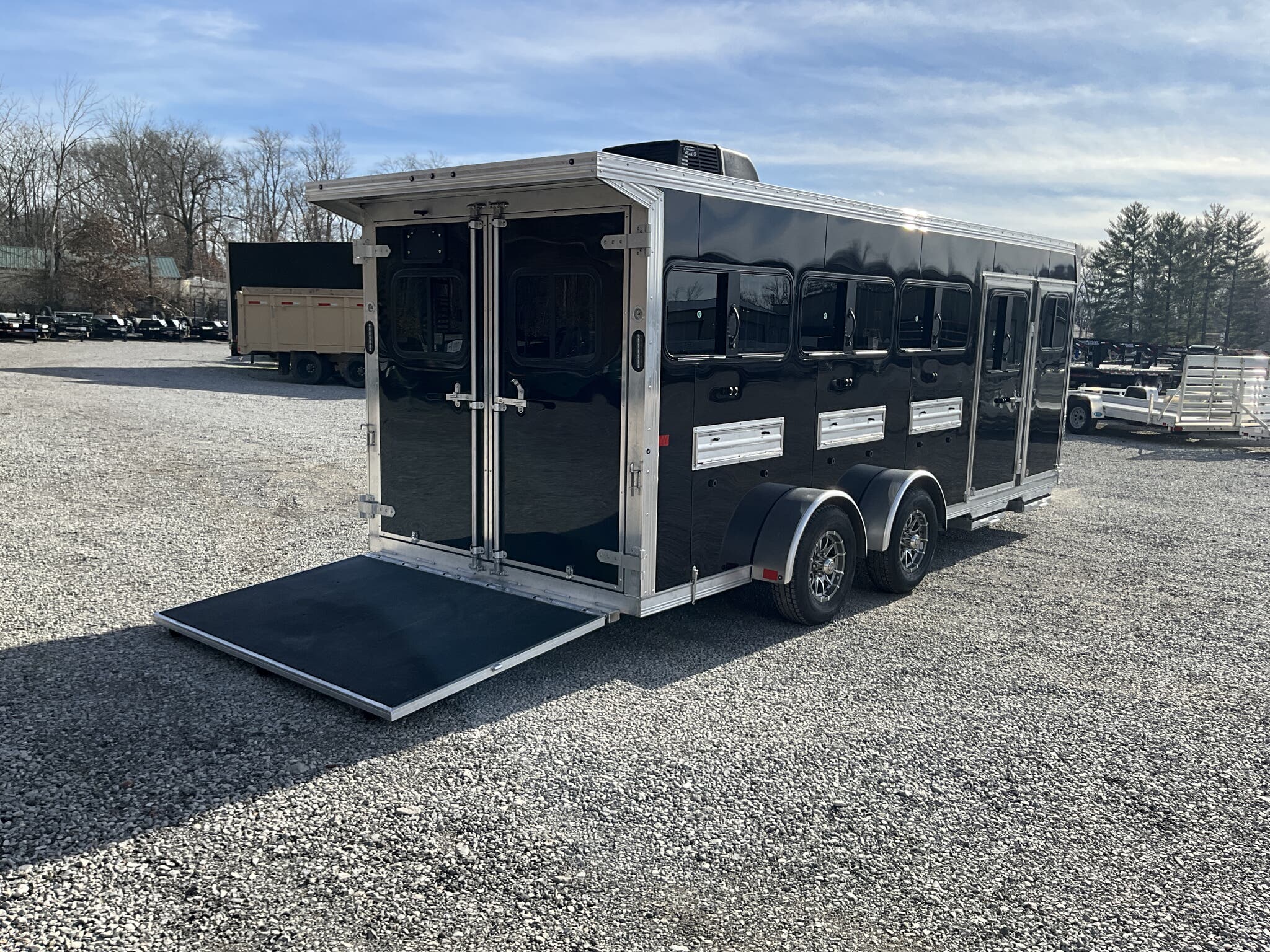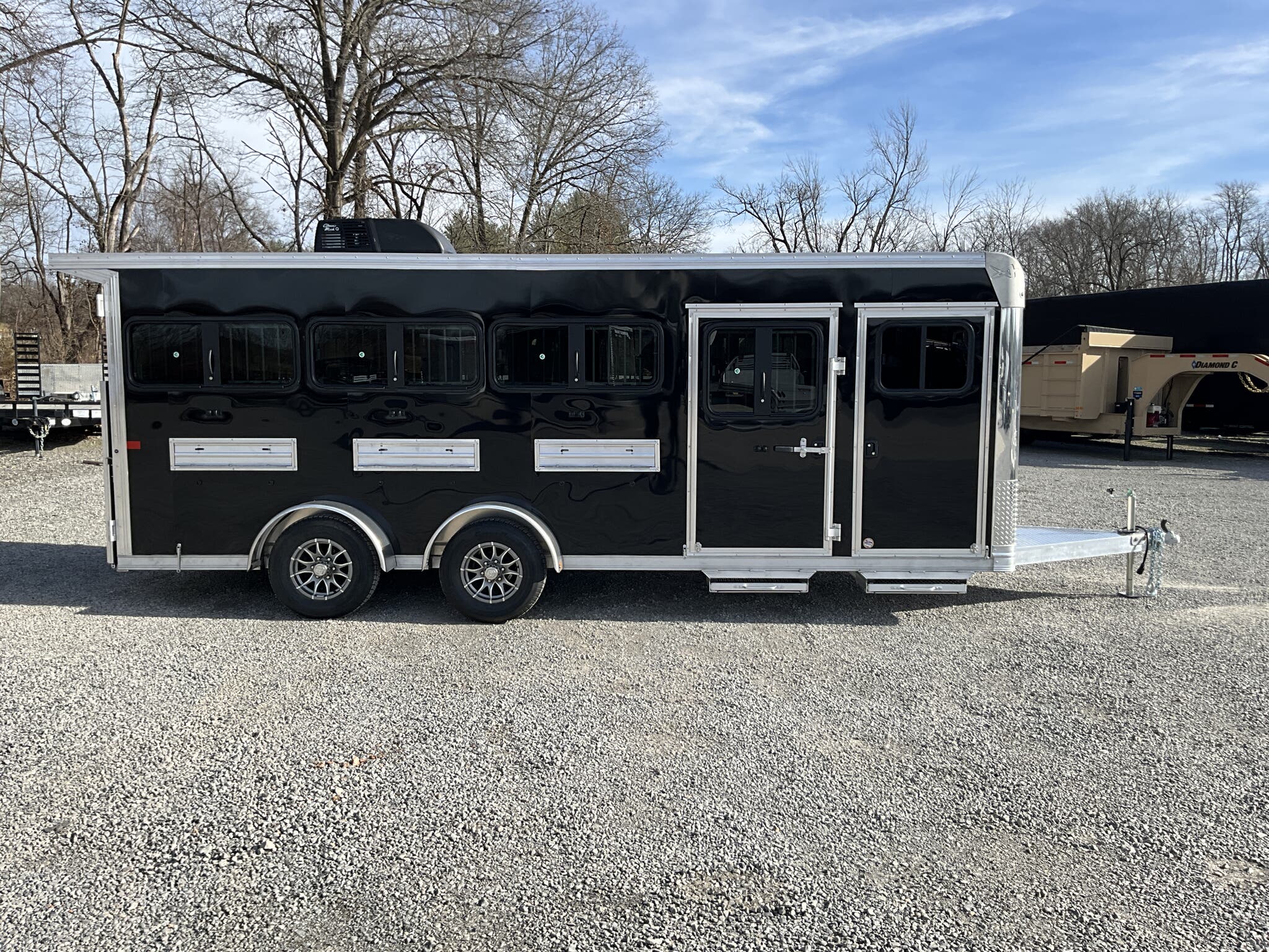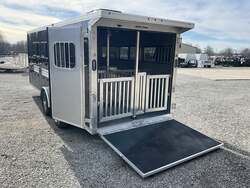 2026 FRONTIER 7 20 LOW PRO 8 PEN SYSTEM TRAILER JACKPOT PACKAGE Drop Down Feed Windows, 78" Interior Height, Bumper Pull, Tandem Torsion Axles For Sale in Illinois Feature: Low Pro 8 pen system trailer with adjustable stall/pen layout Feature: NEW Jackpot Package with 110V power, A/C, ramp, canopy, and upgraded lighting Feature: 13,500 BTU Penguin II roof A/C with 30A power system Feature: Drop down feed windows per pen Feature: Ramp behind double rear doors Feature: Rear canopy system with integrated lights Specs Interior Size: 20' floor length 7' wide 78" tall Specs Construction: All box tube aluminum chassis Specs Floor: Extruded aluminum decking; 12" O.C. I beam crossmembers Specs Roof: One piece .040 aluminum roof with heavy duty radius extrusion Specs Exterior: Lower half extruded aluminum sides; .040 aluminum upper skin & V nose; 24" stone guard Specs Axles/Brakes: (2) 3,500 lb Dexter torsion axles; electric brakes on all wheels with breakaway kit Specs Tires/Wheels: ST225/75R15 tires on aluminum rims (6 lug); matching spare & mount included Specs Doors: 50/50 double rear doors with sliding windows and bars Specs Feed Windows: 45" 18" drop down feed window per pen; 30" 24" feed window at escape door Specs Ventilation: Double action pop up roof vent per pen; (1) air gap with flip down cover Specs Pen System: (8) adjustable pens with new 4' spring loaded latch system; escape door pen gate with U bolt spring latch tie backs Specs Tack Area: 44" tack; curbside tack door (32" 64") with sliding window & screen; rubber mats; LED dome light Specs Electrical (Jackpot): 110V package with (2) standard outlets, (2) GFI outlets, 30A breaker, 30A power converter Specs A/C (Jackpot): 13,500 BTU Penguin II roof A/C Specs Lighting: All LED exterior lights; full length interior LED strip lights both sides of pen area with exterior cup switch; recessed LED puck lighting Specs Exterior Features: Full length running boards; heavy duty rear step up rubber bumper Specs Tongue/Jack: Manual landing gear Specs Finish: Pre painted aluminum exterior Specs Warranty: 8 year limited manufacturer warranty Weights & Capacities Total Axle Capacity: 7,000 lb Weights & Capacities Empty Weight: 3,412 lb Weights & Capacities Payload on Axles: 7,000 3,412 = 3,588 lb Weights & Capacities Tongue Load (Bumper Pull @ 10%): 700 lb Weights & Capacities Total Payload Including Tongue: 4,288 lb Delivery from 62864 (Lower 48): Up to 100 miles $150 101 300 miles $2.00/mile 301 1200 miles $3.00/mile Over 1200 miles $4.00/mile