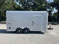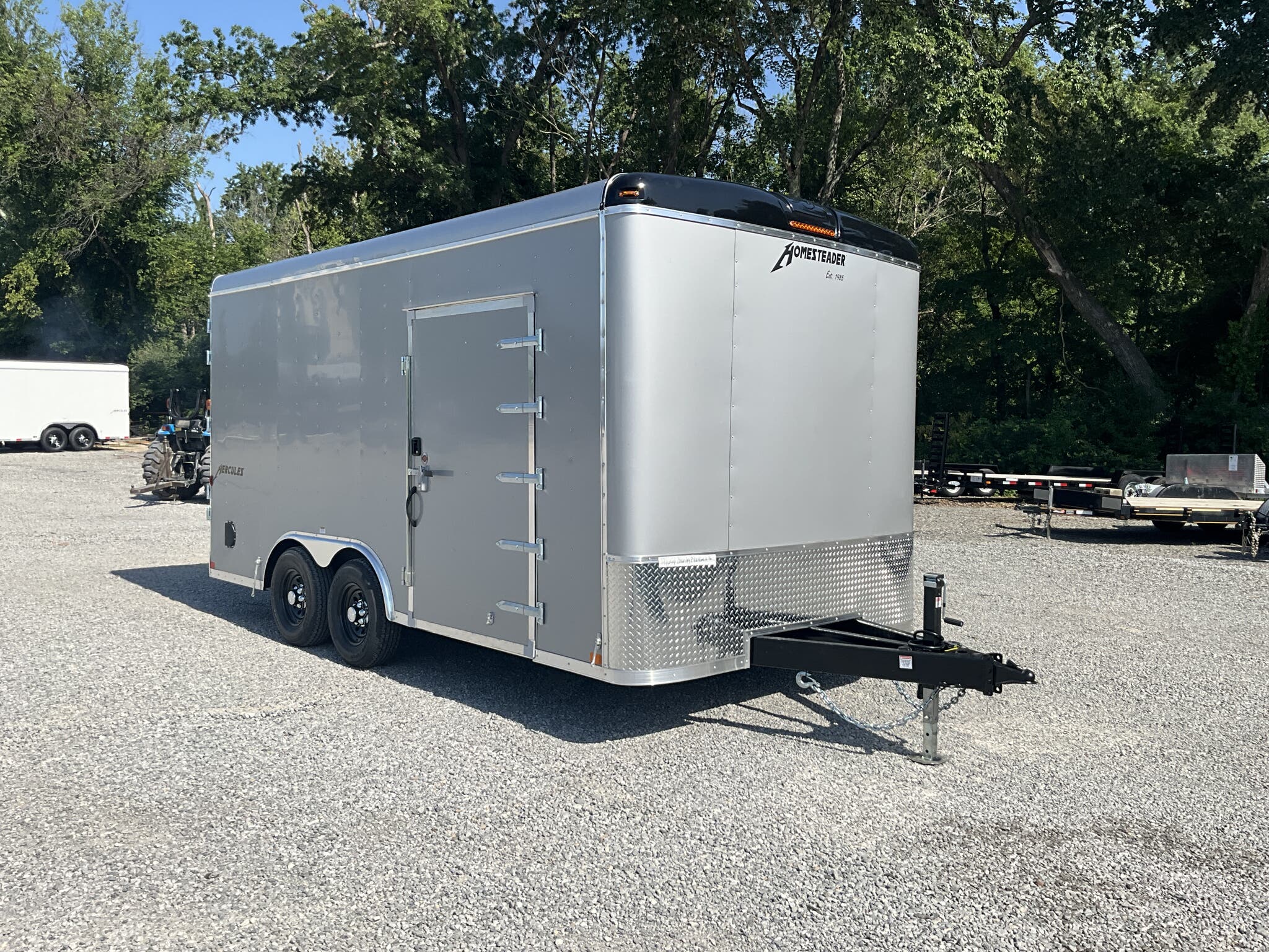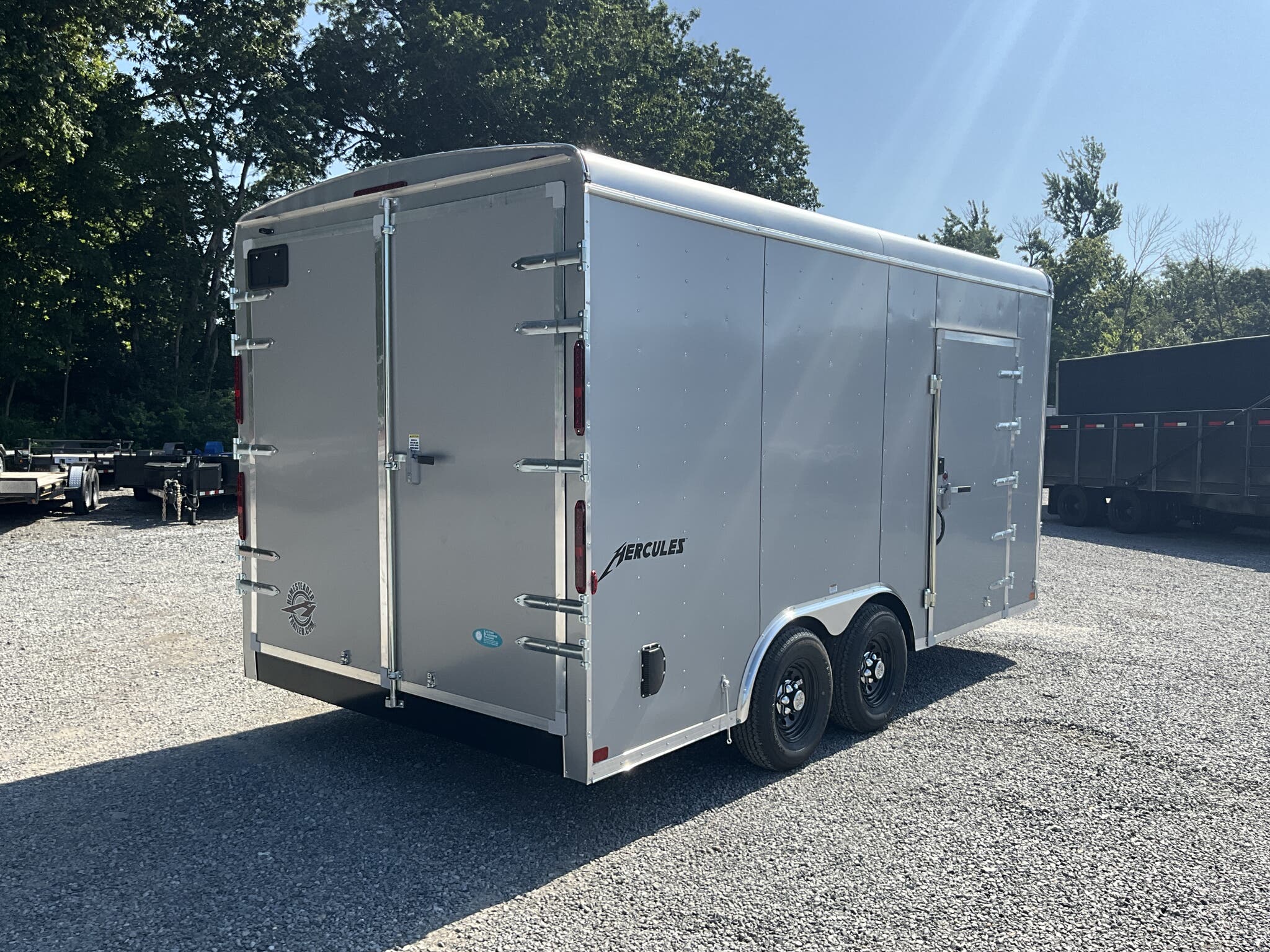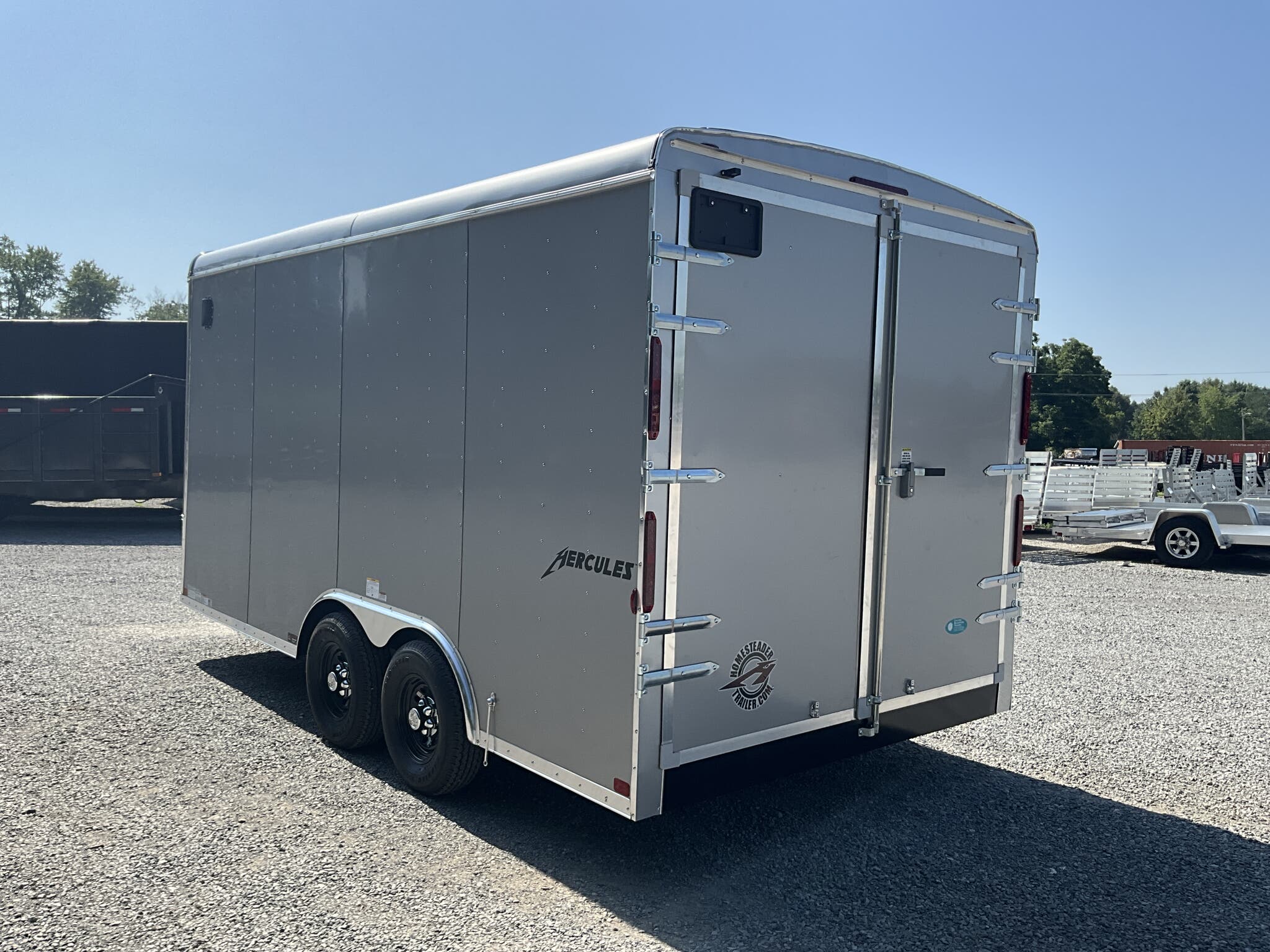 2026 HOMESTEADER HERCULES 8.5' 16' 7'6" TALL ENCLOSED CARGO TRAILER, SILVER MIST .080 POLYCOR, REAR DOUBLE DOORS FOR SALE IN MOUNT VERNON, IL 62864 Feature: Heavy duty Hercules series construction Feature: .080 Polycor aluminum exterior upgrade Feature: Extra tall 7'6" interior height Feature: 48" side door with flush lock and extra hinges Feature: (3) interior LED dome lights with wall switch Specs Model: Hercules Specs Size: 8.5' 16' Specs Exterior: Silver Mist .080 Polycor aluminum exterior Specs Interior Height: 7'6" tall interior clearance Specs Axles/Brakes: (2) 5,200 lb torsion axles with electric brakes Specs Suspension: Torsion suspension Specs Frame: Heavy duty frame with 12" O.C. crossmembers, wall posts, and roof bows Specs Roof: One piece aluminum roof Specs Floor/Walls: 3/4" plywood floor; 3/8" plywood walls Specs Doors: Rear double doors with double LED tail lights; 48" side door with flush lock and extra hinges Specs Lighting: (3) interior LED dome lights with wall switch; LED exterior lighting package Specs Tongue: 60" extended tongue with HD V tongue lid storage Specs Coupler: Adjustable 2 5/16" coupler Specs Jack: 8K drop leg jack Specs Certification: NATM compliant Specs Warranty: 3 year Homesteader structural warranty Weights & Capacities GVWR: 9,990 lb Empty Weight: 3,126 lb Payload on Axles: 9,990 3,126 = 6,864 lb Target Tongue Load (10% of GVWR): 999 lb Total Effective Payload: 7,863 lb Delivery from 62864 (Lower 48) Up to 100 miles $150 101 300 miles $2.00/mile 301 1200 miles $3.00/mile Over 1200 miles $4.00/mile