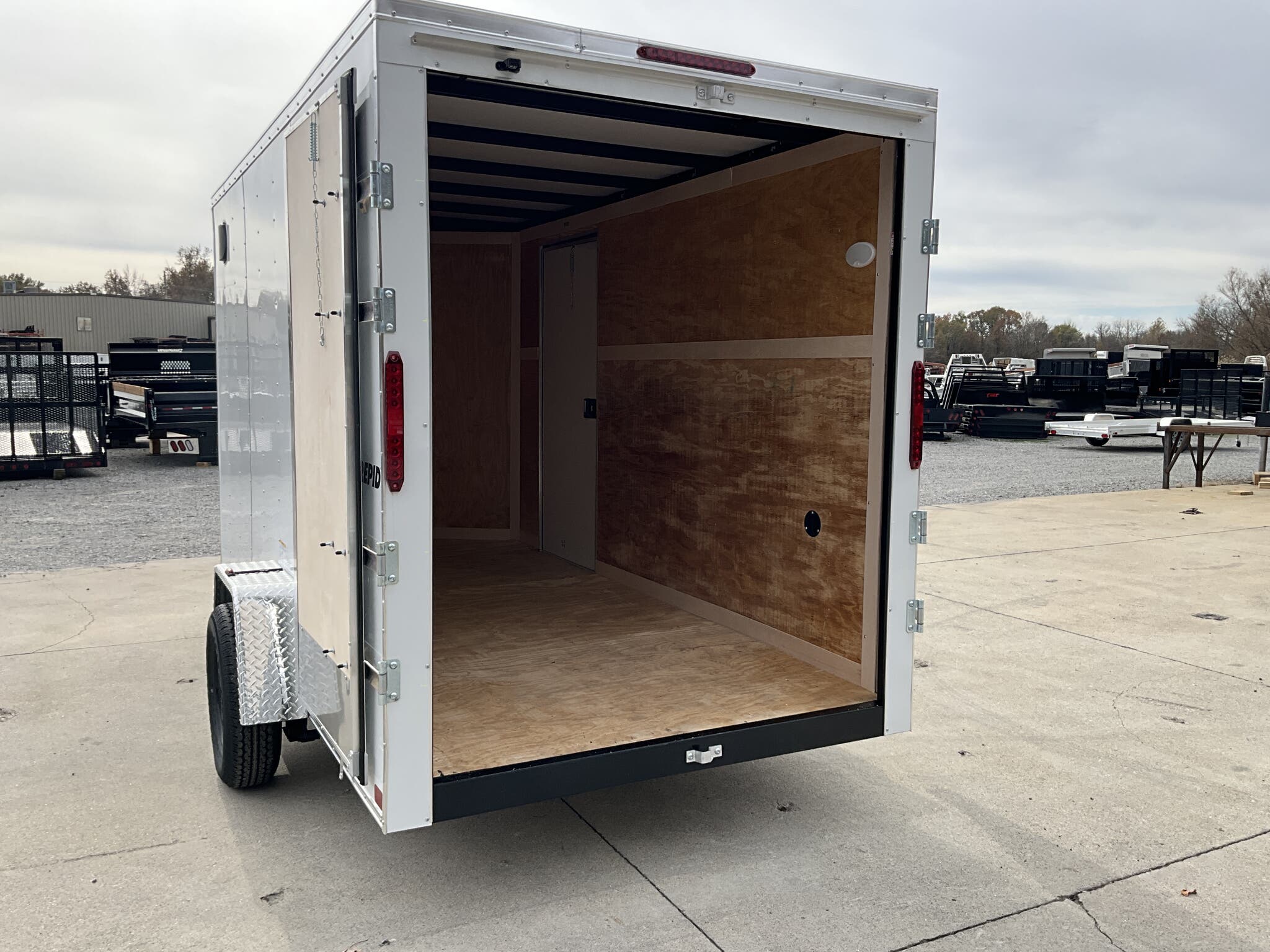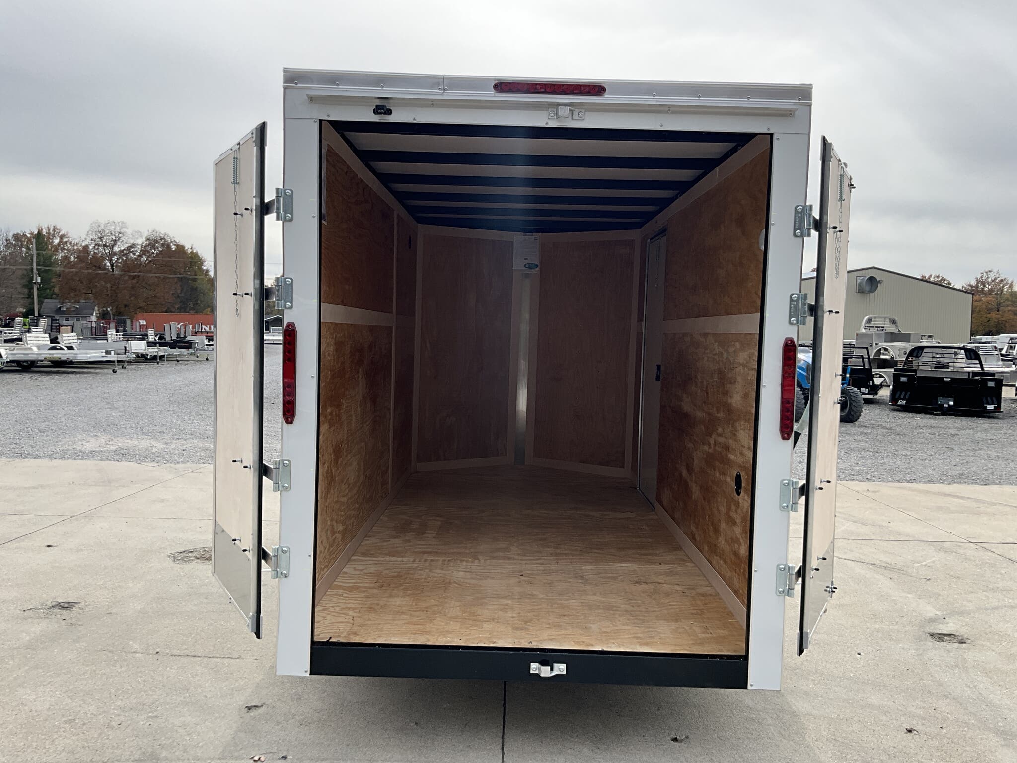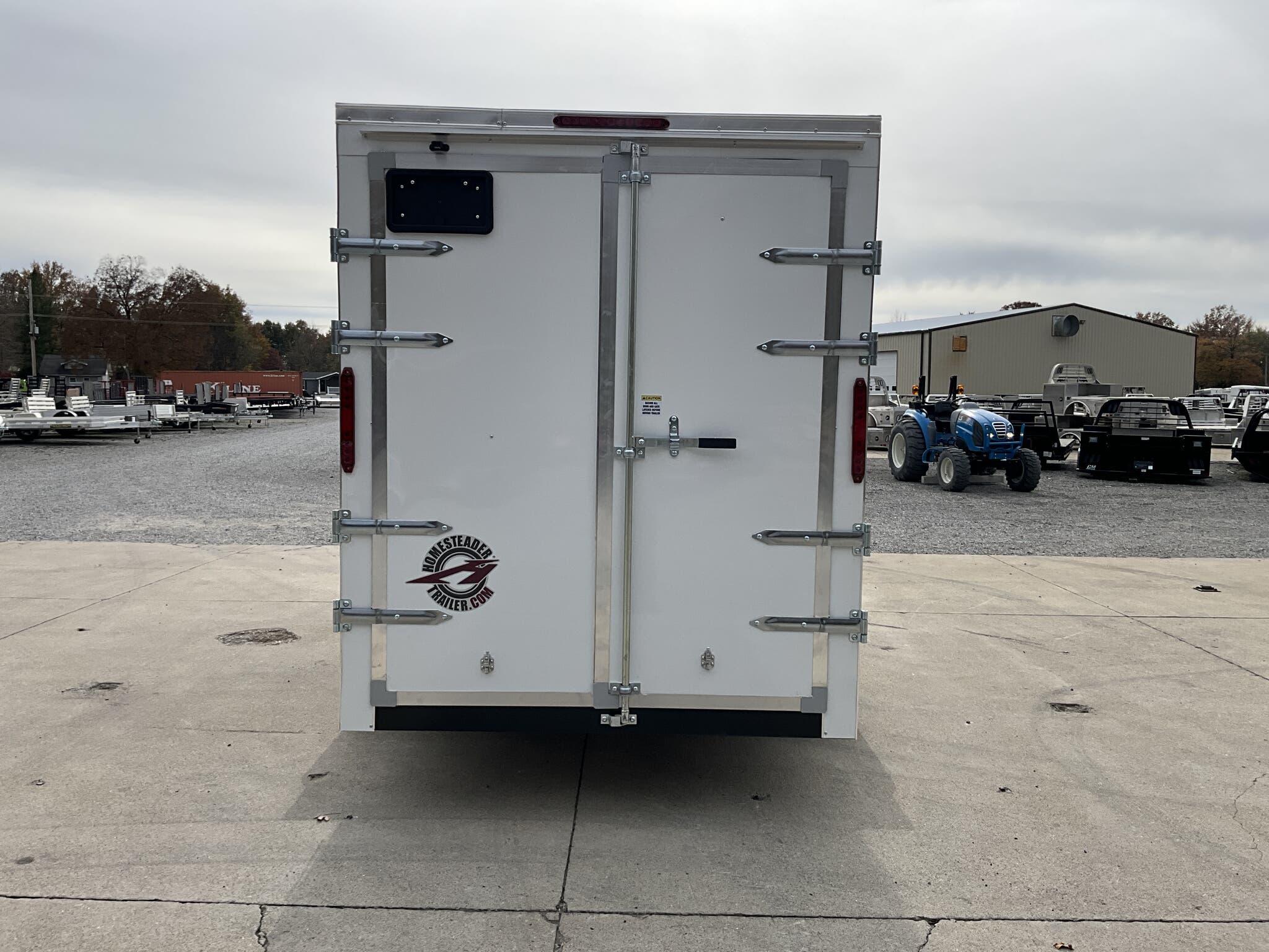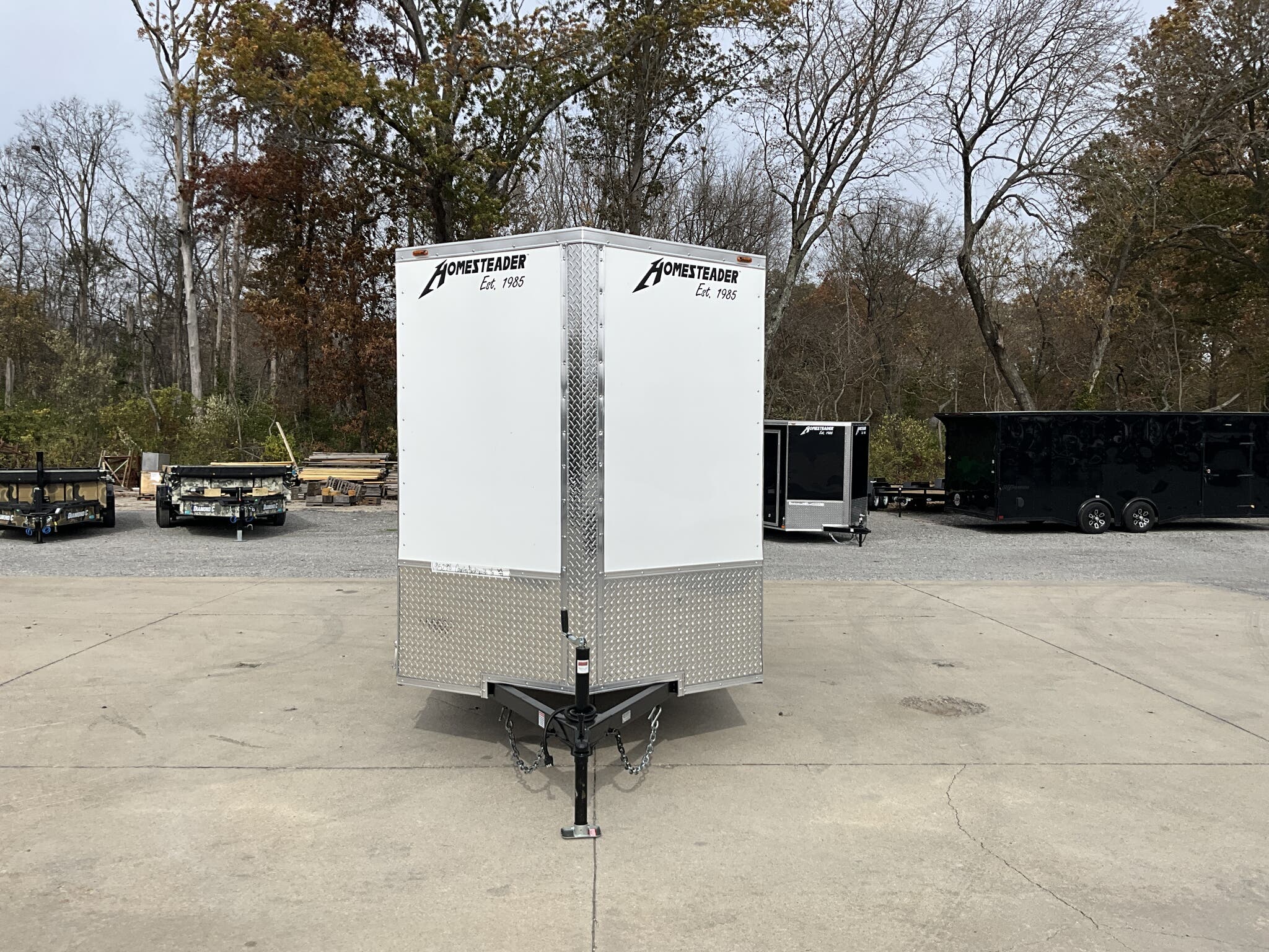2026 HOMESTEADER 6' x 12' Enclosed Cargo Trailer 2,990 lb GVWR, White Aluminum, 24" V Nose (adds length), 32" Bonded Side Door (no bar lock), Rear Double Doors (barn doors) with 2 Extra Hinges Each, 6.5' Interior Height For Sale in Illinois Standout Options: Rear double doors with 2 extra hinges per door (heavy duty upgrade) Standout Options: 24" V nose adds usable cargo length Standout Options: LED exterior lighting; flow thru sidewall vents; interior dome light Standout Options: (4) floor mounted D rings Specs Exterior: White aluminum; 24" V nose (additional to 12' box) Specs Doors: 32" bonded side door (no bar lock); rear double doors (barn doors) with 2 extra hinges each Specs Floor/Walls: 3/4" plywood floor; 3/8" plywood walls Specs Ventilation/Lighting: Flow thru vents; interior dome light; LED exterior lighting Specs Axle/Suspension: 3.5K idler axle; spring suspension Specs Tires/Wheels: 15" radial tires; steel wheels Specs Height/Dimensions: 78" interior height (6.5'); 12' L x 6' W box + 24" V nose Specs Coupler/Jack: 2" coupler; A frame tongue jack Specs Structure: Undercoated steel frame; tubular wall studs 16" O.C.; tubular roof supports 24" O.C.; one piece aluminum roof; NATM compliant Specs Warranty: 3 year limited manufacturer warranty Weights & Capacities GVWR: 2,990 lb Weights & Capacities Empty/Trailer Weight: 1,680 lb Weights & Capacities Payload on Axles: 2,990 1,680 = 1,310 lb Weights & Capacities Target Tongue Load (10% of GVWR): 299 lb Weights & Capacities Total Payload Including Tongue Support: 2,990 1,680 + 299 = 1,609 lb Delivery from 62864 (Lower 48): Up to 100 miles: $150 Delivery from 62864 (Lower 48): 101 300 miles: $2.00/mile Delivery from 62864 (Lower 48): 301 1200 miles: $3.00/mile Delivery from 62864 (Lower 48): Over 1200 miles: $4.00/mile