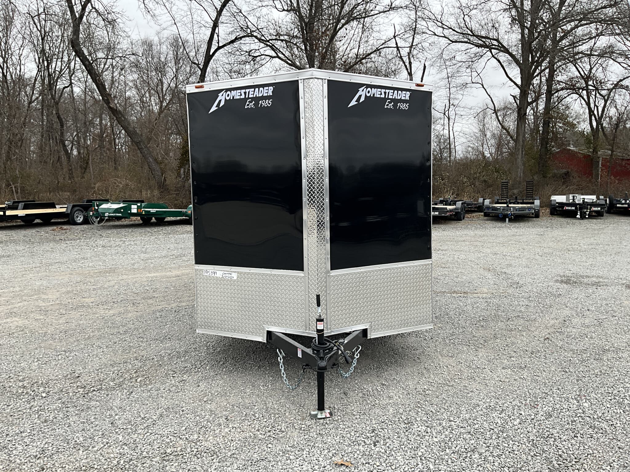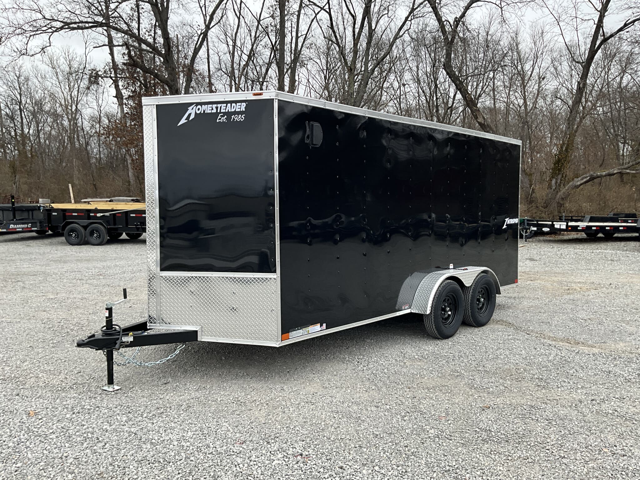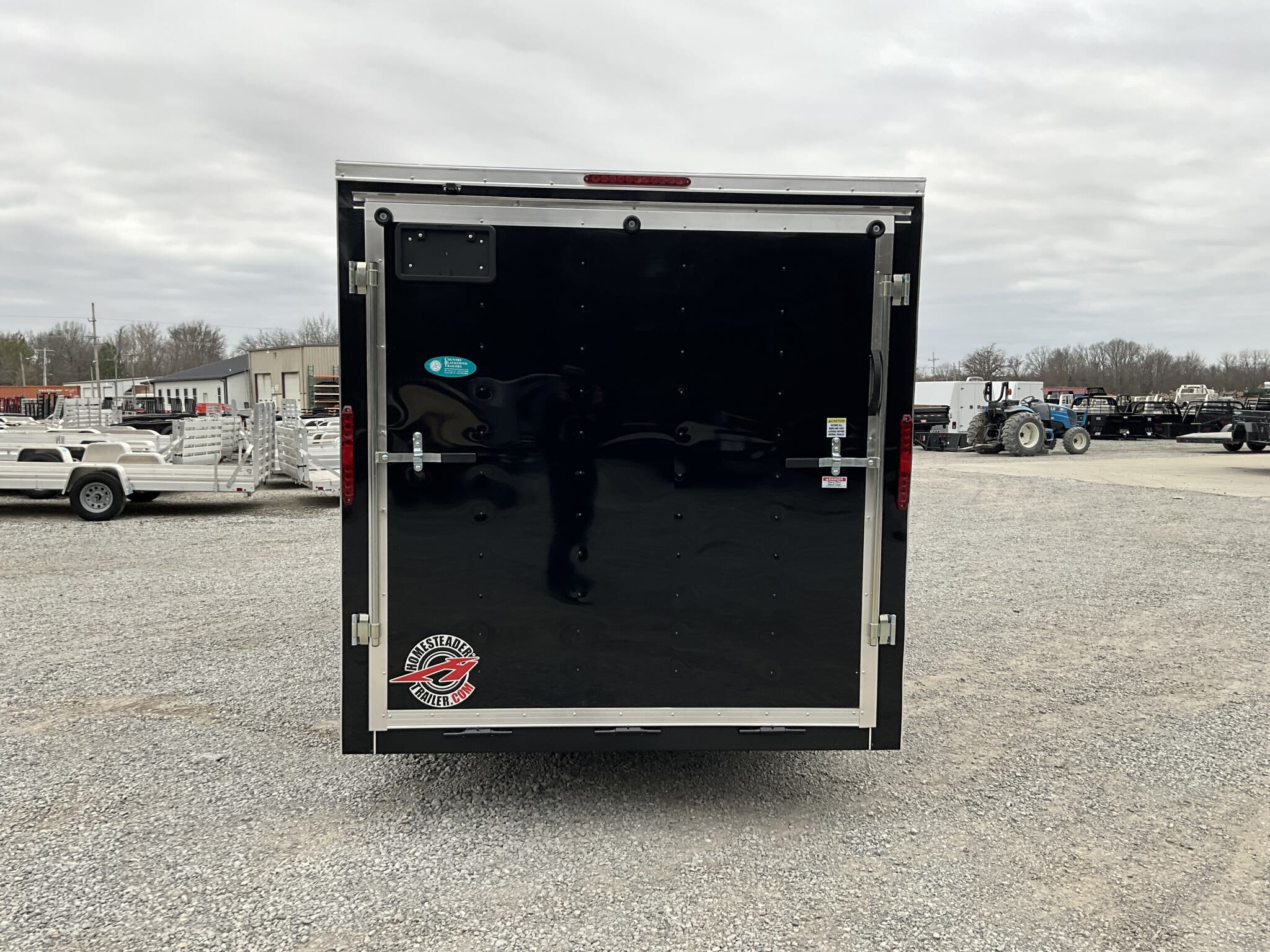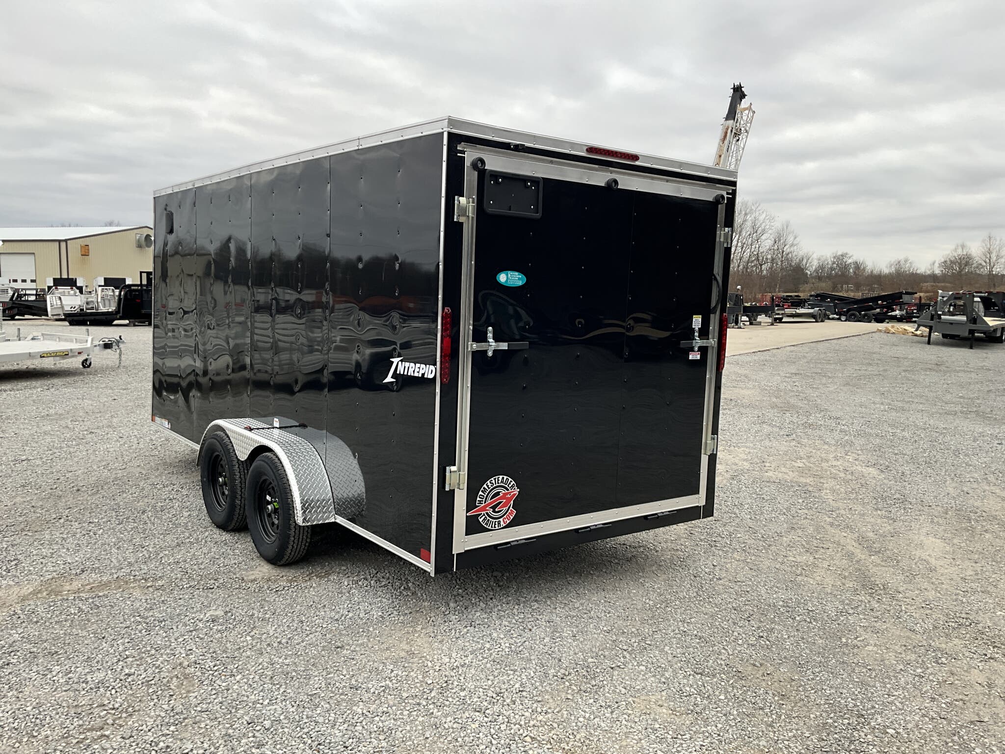 2026 HOMESTEADER 7' X 16' ENCLOSED CARGO TRAILER, V-NOSE WITH FRONT STONEGUARD, 78" INTERIOR HEIGHT, BLACK ALUMINUM EXTERIOR, 2-3.5K ELECTRIC BRAKE AXLES, SPRING SUSPENSION, 15" RADIAL TIRES, 32" SIDE DOOR WITH BAR LOCK, REAR RAMP DOOR WITH EXTENDED WOOD FLAP, 3/4" PLYWOOD FLOOR, 3/8" PLYWOOD WALLS, 16" ON CENTER FLOOR CROSSMEMBERS AND WALL POSTS, (4) FLOOR MOUNT D-RINGS, FLOW THRU VENTS - SIDEWALL, DOME LIGHT, LED EXTERIOR LIGHTS, 2-5/16" COUPLER, A-FRAME JACK.