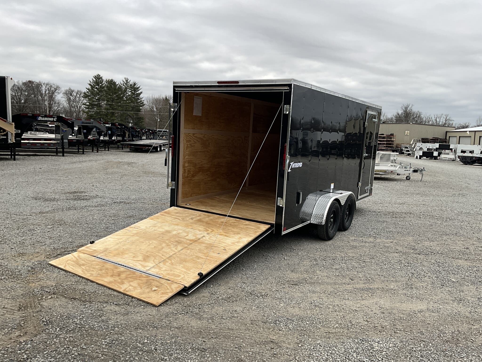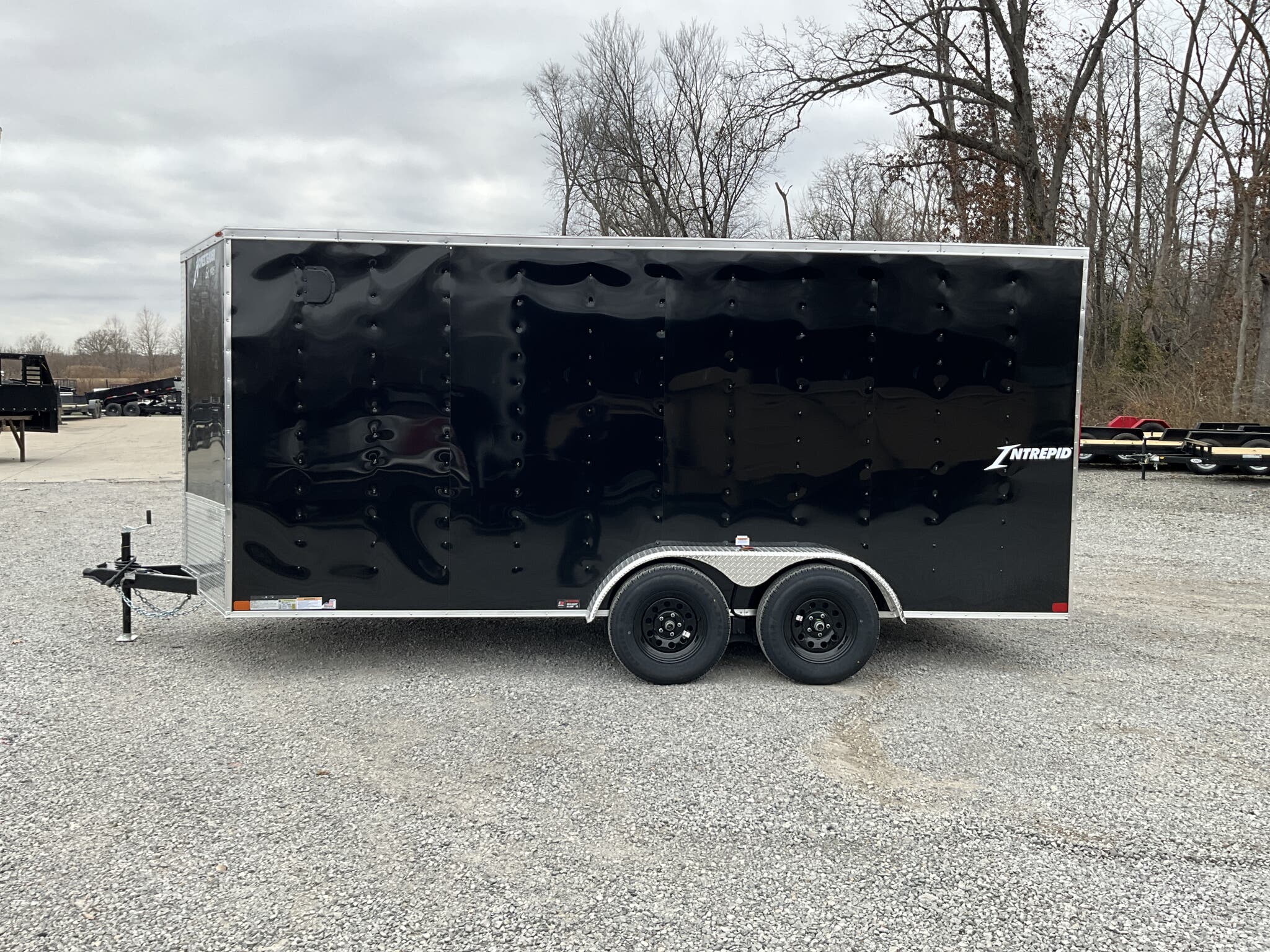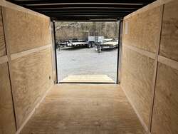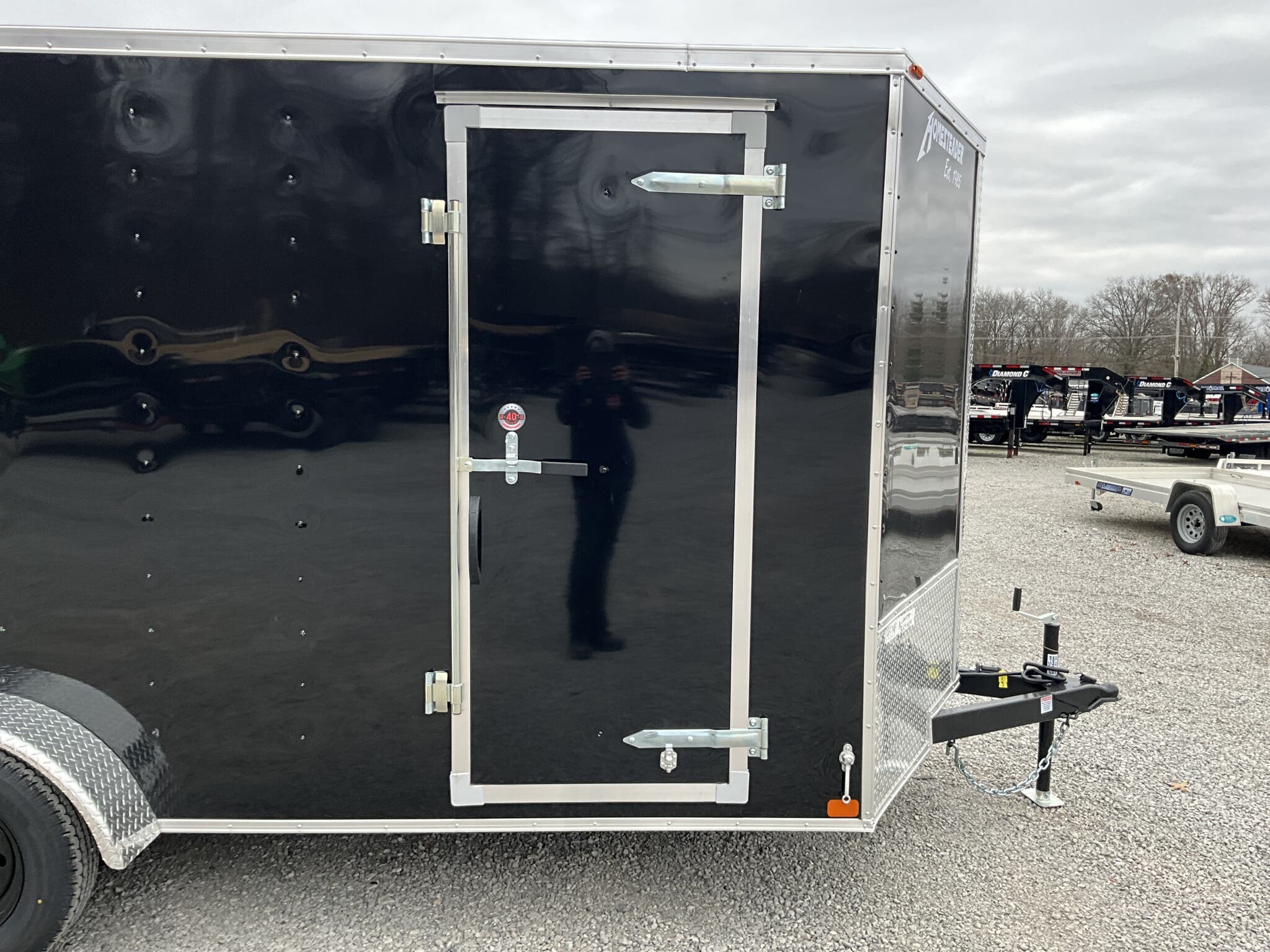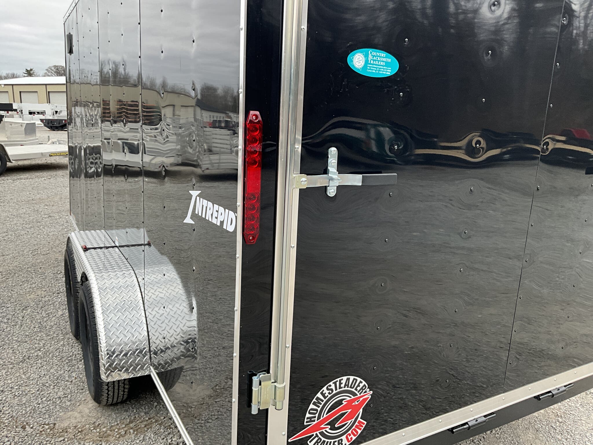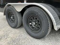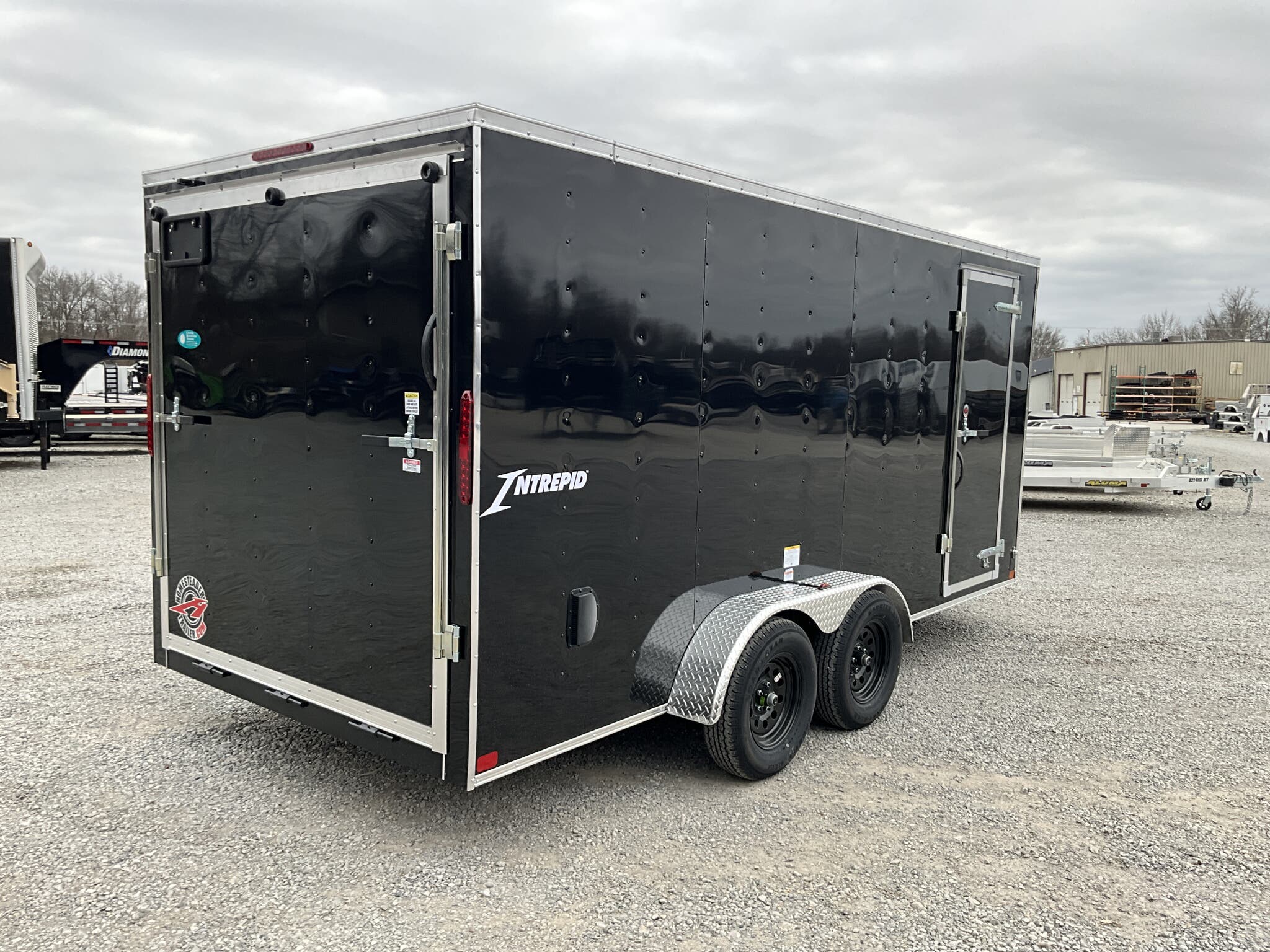 2026 HOMESTEADER 7' X 16' ENCLOSED CARGO TRAILER, V-NOSE WITH FRONT STONEGUARD, 78" INTERIOR HEIGHT, BLACK ALUMINUM EXTERIOR, 2-3.5K ELECTRIC BRAKE AXLES, SPRING SUSPENSION, 15" RADIAL TIRES, 32" SIDE DOOR WITH BAR LOCK, REAR RAMP DOOR WITH EXTENDED WOOD FLAP, 3/4" PLYWOOD FLOOR, 3/8" PLYWOOD WALLS, 16" ON CENTER FLOOR CROSSMEMBERS AND WALL POSTS, (4) FLOOR MOUNT D-RINGS, FLOW THRU VENTS - SIDEWALL, DOME LIGHT, LED EXTERIOR LIGHTS, 2-5/16" COUPLER, A-FRAME JACK.