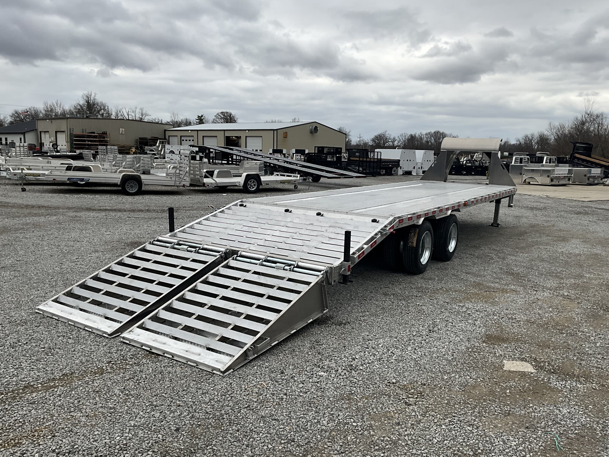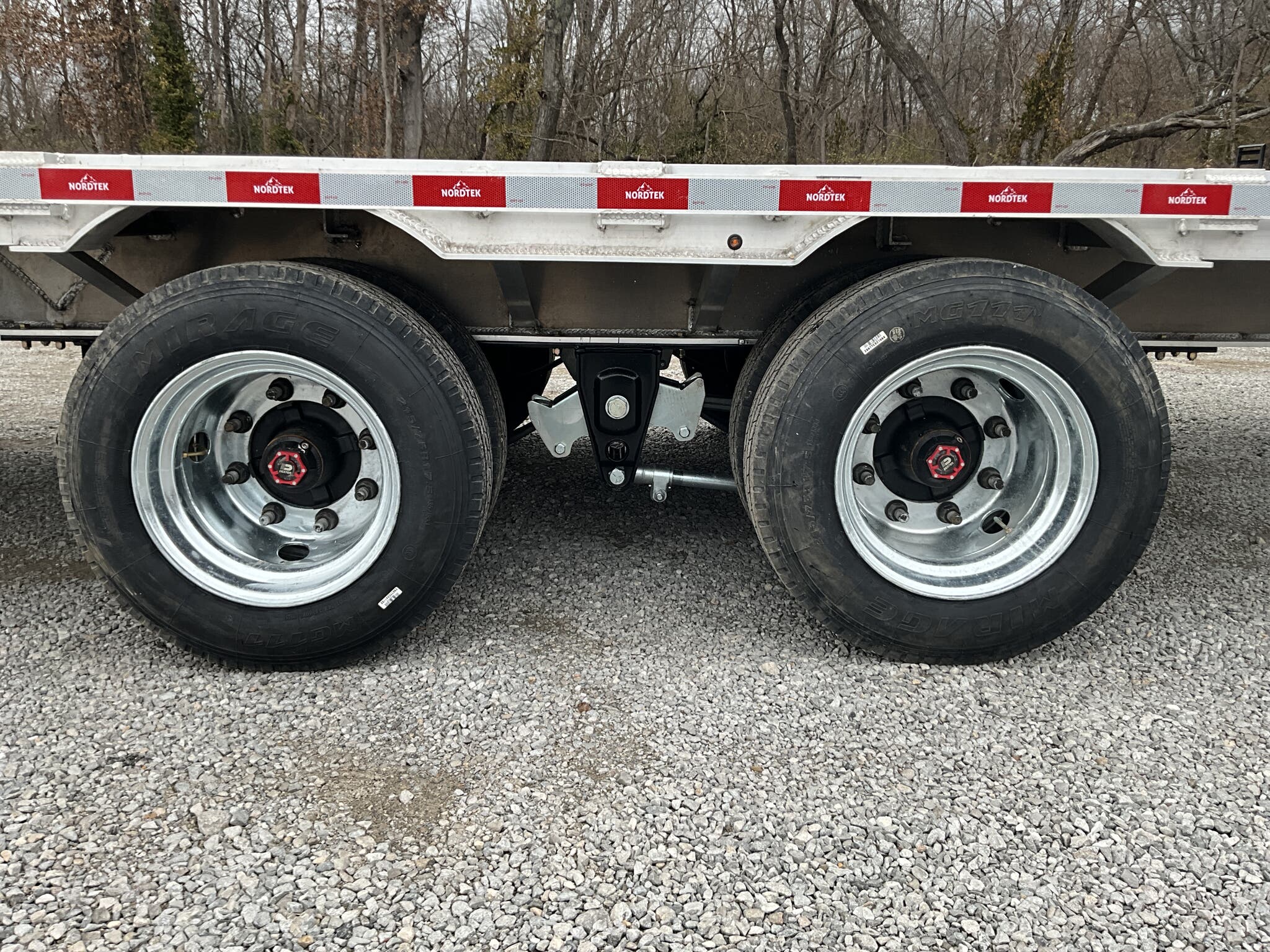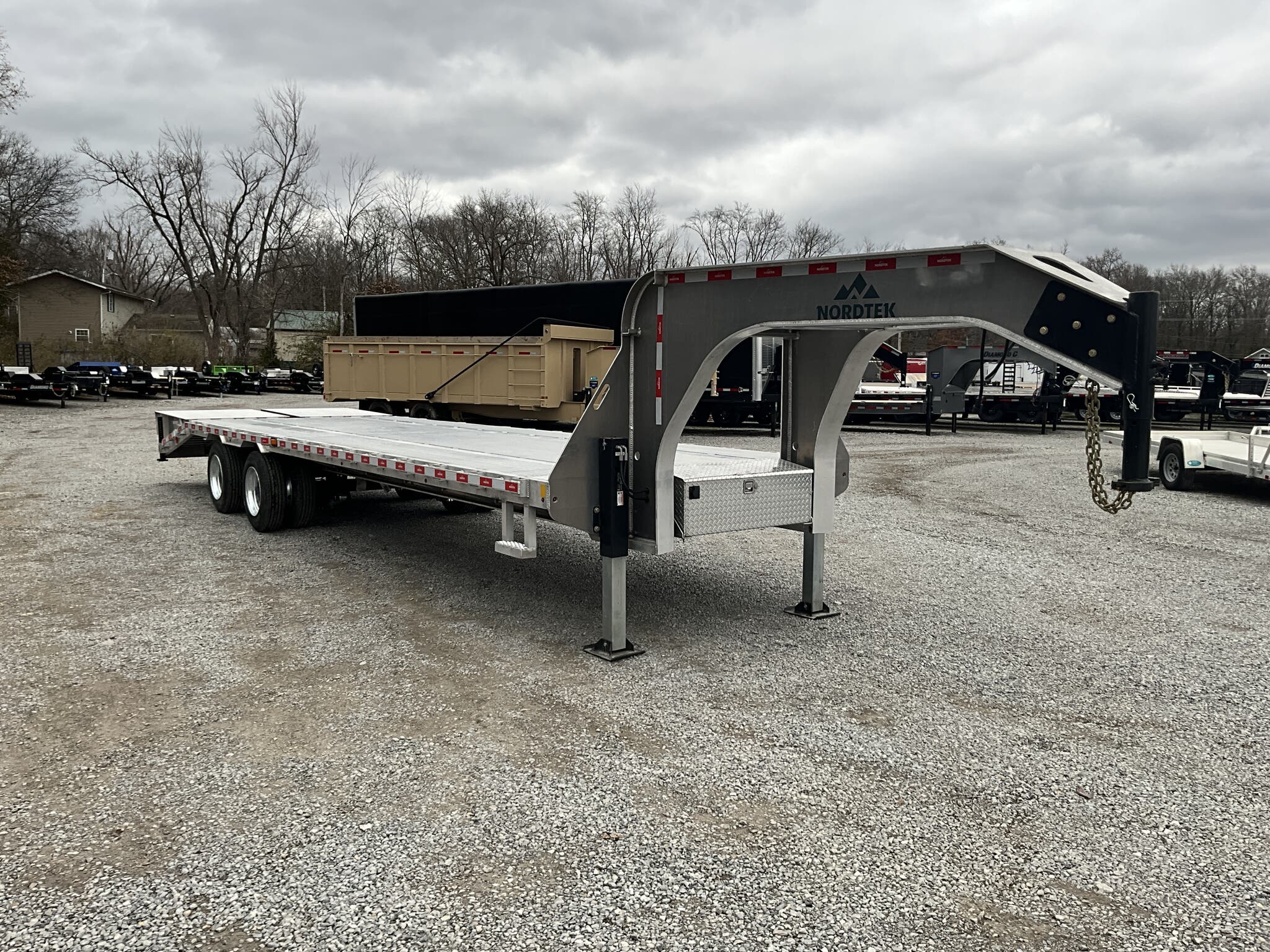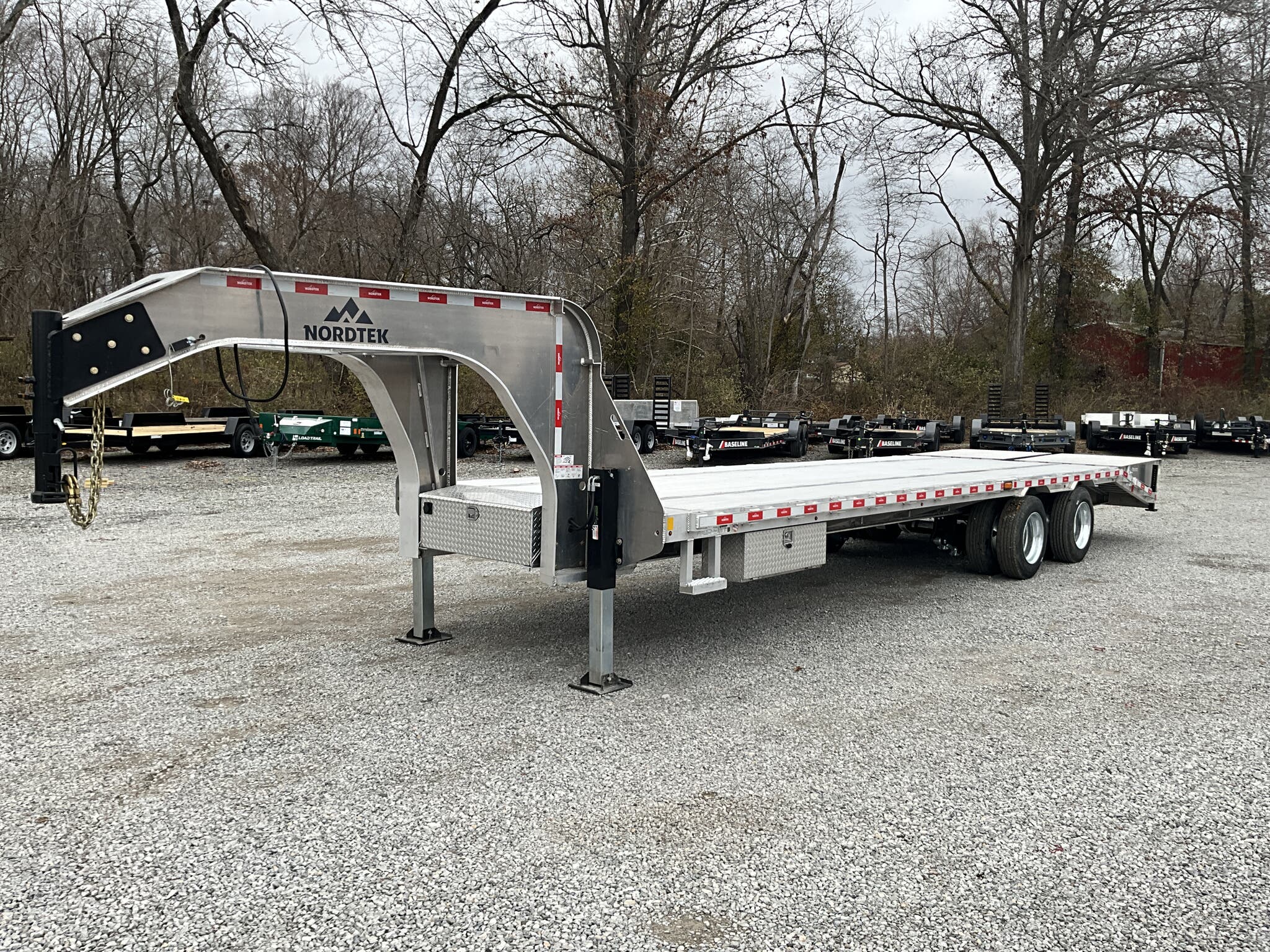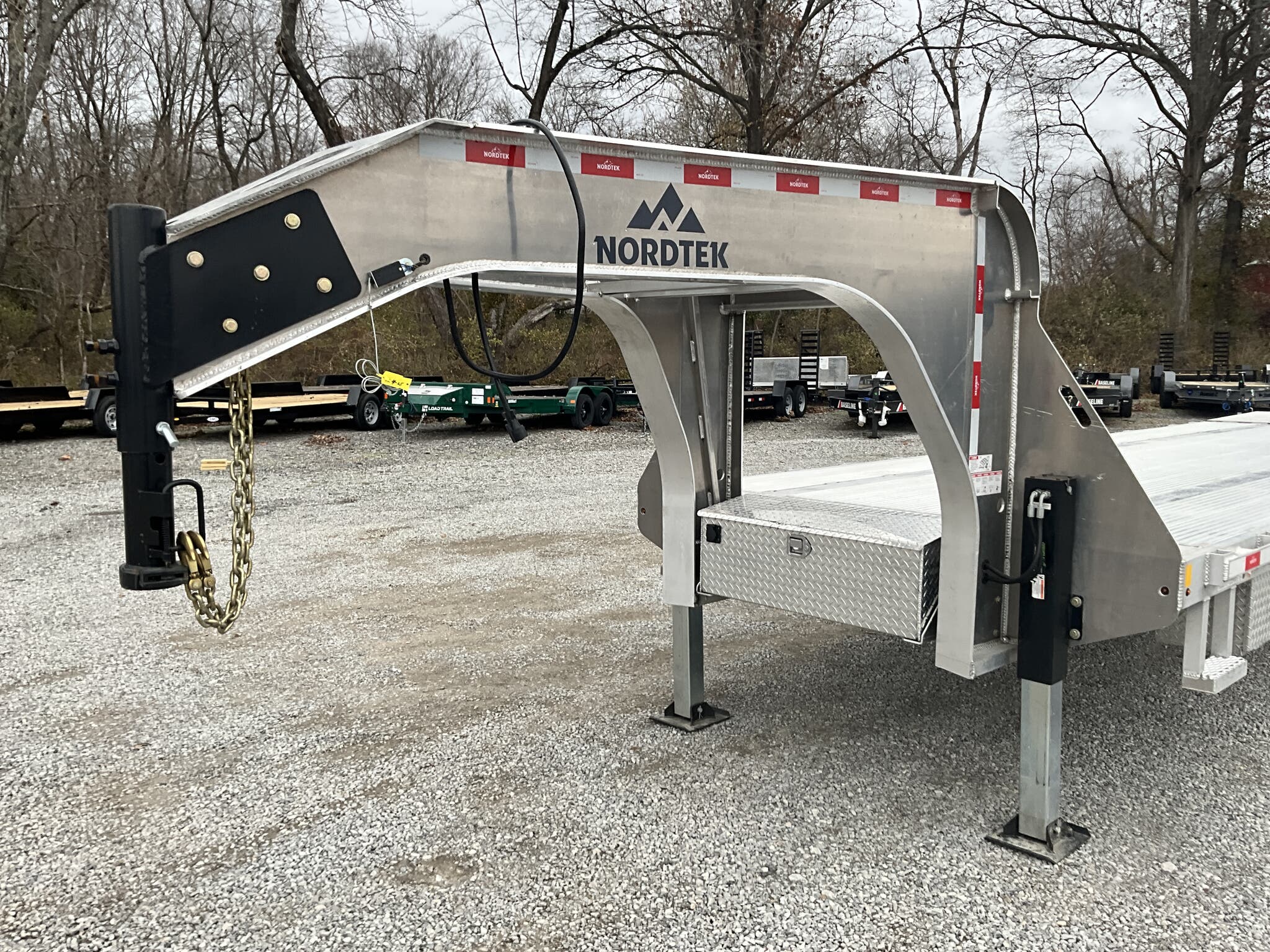 2026 NORDTEK 25+5 Gooseneck Deckover 24,000 lb GVWR, 25' Flat + 5' Wedge Ramps, 102" Wide, 12" Fabricated Beam, Hydraulic Jacks, Extruded Aluminum Deck For Sale in Illinois Feature: 12" fabricated main frame & neck (heavy duty commercial build) Feature: Extruded aluminum decking (superior traction, lifetime durability) Feature: Hydraulic jacks (dual) Feature: 5' wedge ramps for low angle loading Feature: Hutch style suspension (fleet grade durability) Feature: Front gooseneck toolbox Feature: 8 extra LED marker lights (high visibility safety package) Feature: Pipe spools between stake pockets for professional tie down flexibility Specs Deck Size: 25' flat + 5' wedge tail (30' overall) Specs GVWR: 24,000 lb Specs Axles: Tandem 12K axles with hydraulic drum brakes Specs Suspension: Hutch style suspension Specs Wheels/Rims: 17.5" galvanized wheels, 8 on 275mm heavy bolt pattern Specs Tires: 17.5" commercial grade radials (load range per axle spec) Specs Frame: 12" fabricated I beam frame and neck Specs Crossmembers: 4" channel crossmembers on 16" centers Specs Rail/Tie Downs: 6" channel lace rail; 2.5" rub rail; pipe spools and 4" stake pockets down both sides Specs Decking: Extruded aluminum deck boards Specs Coupler: 2 5/16" adjustable gooseneck coupler Specs Jacks: Hydraulic dual jacks Specs Toolbox: Large front gooseneck toolbox Specs Lights/Wiring: Full LED lighting; 8 extra LED marker lights; braided wiring harness Specs Fenders: Checker plated wheel covers Specs Stands: Rear drop stands (both corners) Specs Step: Driver side front corner step Specs Spare: Removable spare tire mount Specs Warranty: Manufacturer limited warranty Weights & Capacities Total Axle Capacity: 24,000 lb Weights & Capacities Empty/Trailer Weight: 5,400 lb Weights & Capacities Payload on Axles: 24,000 5,400 = 18,600 lb Weights & Capacities Target Tongue Load (Gooseneck @ ~20%): 4,800 lb Weights & Capacities Total Payload Including Tongue Support: 18,600 + 4,800 = 23,400 lb Delivery from 62864 (Lower 48): Up to 100 miles: $150 101 300 miles: $2.00/mile 301 1200 miles: $3.00/mile Over 1200 miles: $4.00/mile