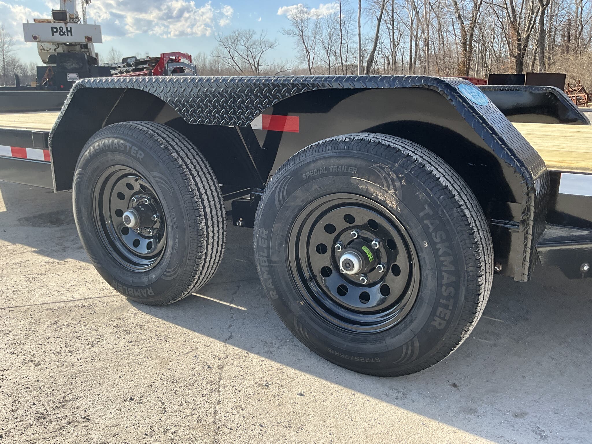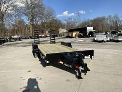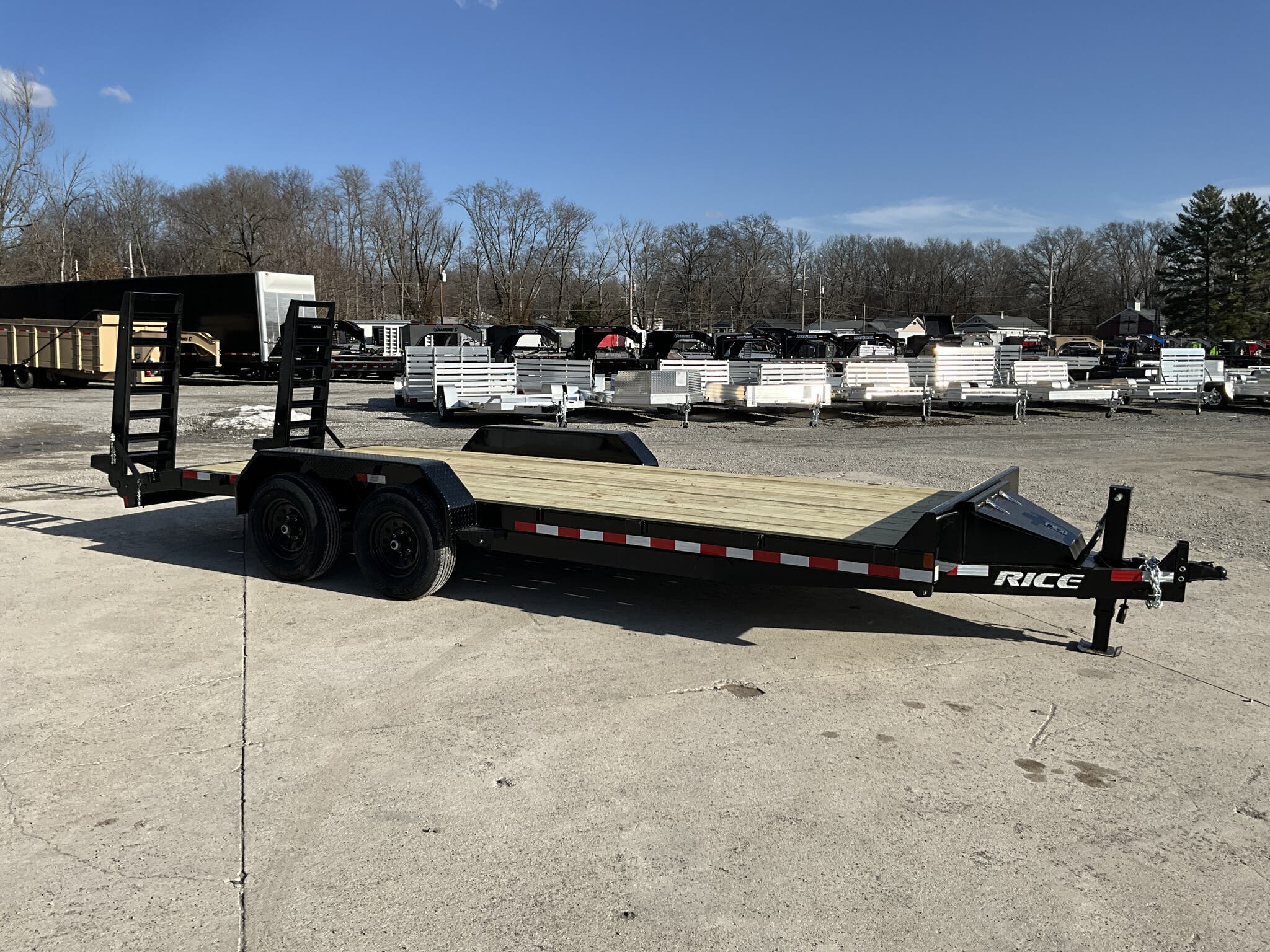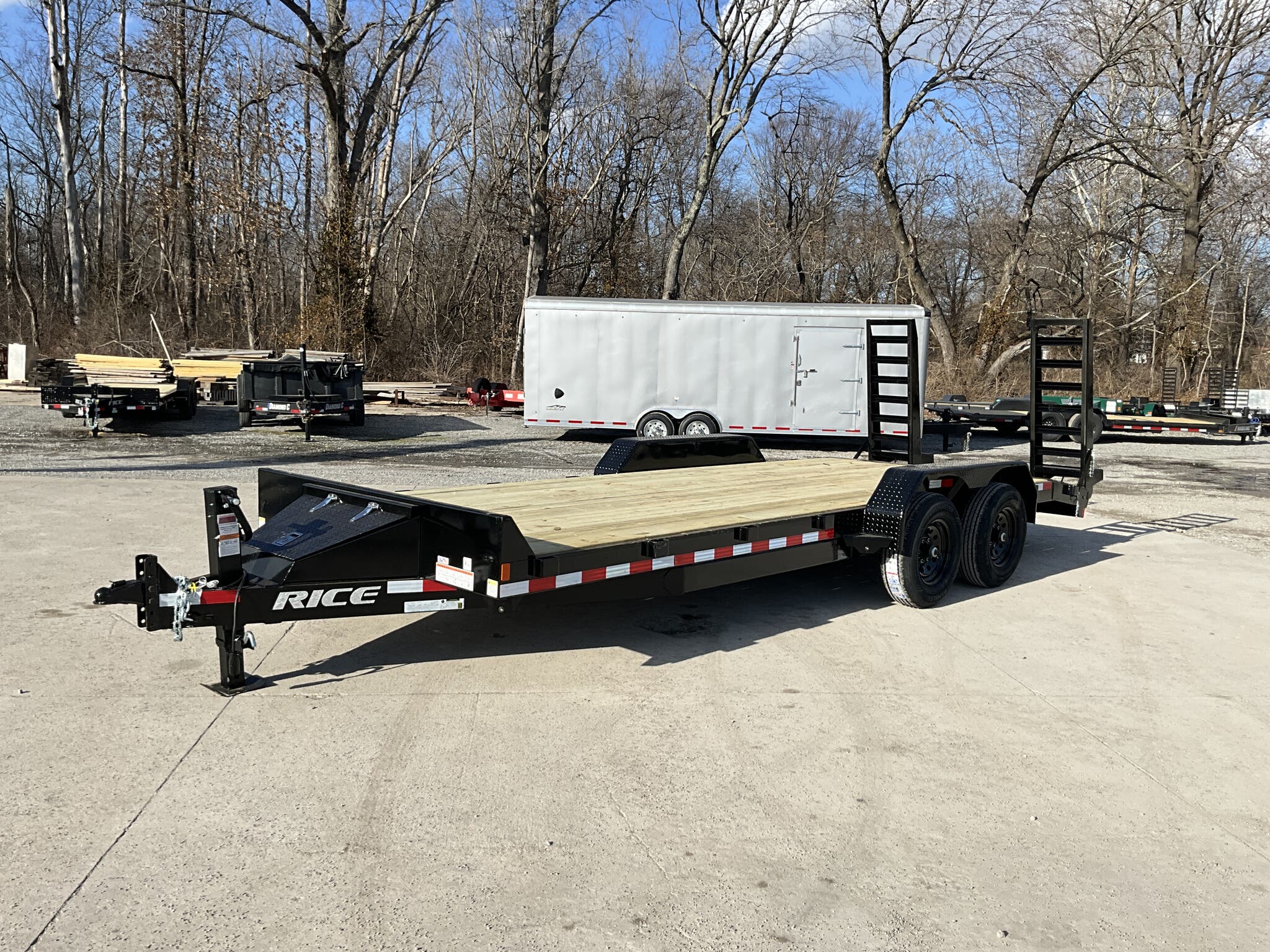 2026 RICE FMEMR8220 MAGNUM EQUIPMENT (ROBOTIC SERIES) 20' (18' Deck + 2' Dovetail) 6'10" Wide, 9,990 GVWR, Black For Sale in Illinois Feature: Magnum 9,900# robotic series equipment trailer Feature: 5' equipment style spring assist fold up ramps with kickers Feature: Stealth Magnum tool box Feature: Complete powder coat finish Specs Size: 20' long (18' flat + 2' dovetail) 6'10" wide Specs GVWR: 9,990 lb Specs Frame: 5" channel cold formed wrap tongue; 6" channel main frame Specs Crossmembers: 3" formed channel on 16" centers Specs Floor: Pressure treated 2 8 wood deck Specs Axles/Brakes: (2) 5,200 lb cambered EZ Lube axles; electric brakes Specs Tires/Wheels: ST235/75R15 8 ply radial tires on black mod wheels Specs Coupler: 2 5/16" adjustable coupler (14,000 lb rated) Specs Jack: 7,000 lb drop leg jack Specs Ramps: 5' spring assist fold up equipment ramps with kickers Specs Fenders: Hard steel fenders Specs Wiring: Fully sealed modular wiring harness Specs Lighting: All LED lighting; emergency breakaway kit Specs Finish: Steel grit blasted, degreased, phosphatized, sealed and powder coated; Black Weights & Capacities GVWR: 9,990 lb Weights & Capacities Empty Weight: 3,075 lb Weights & Capacities Payload on Axles: 9,990 3,075 = 6,915 lb Weights & Capacities Tongue Load (Bumper Pull @ 10%): 999 lb Weights & Capacities Total Payload Including Tongue: 7,914 lb Delivery from 62864 (Lower 48): Up to 100 miles $150 101 300 miles $2.00/mile 301 1200 miles $3.00/mile Over 1200 miles $4.00/mile