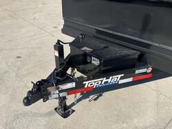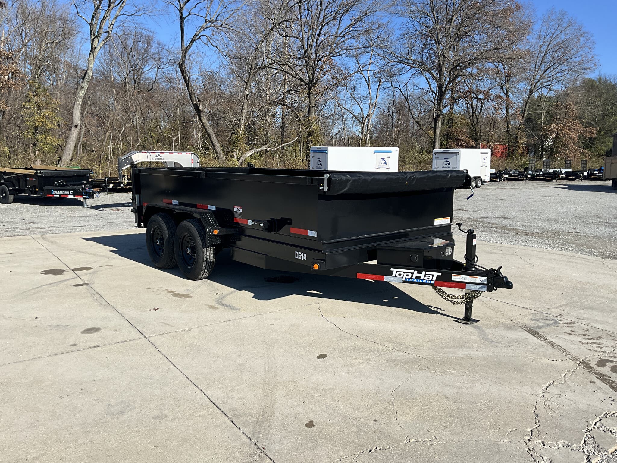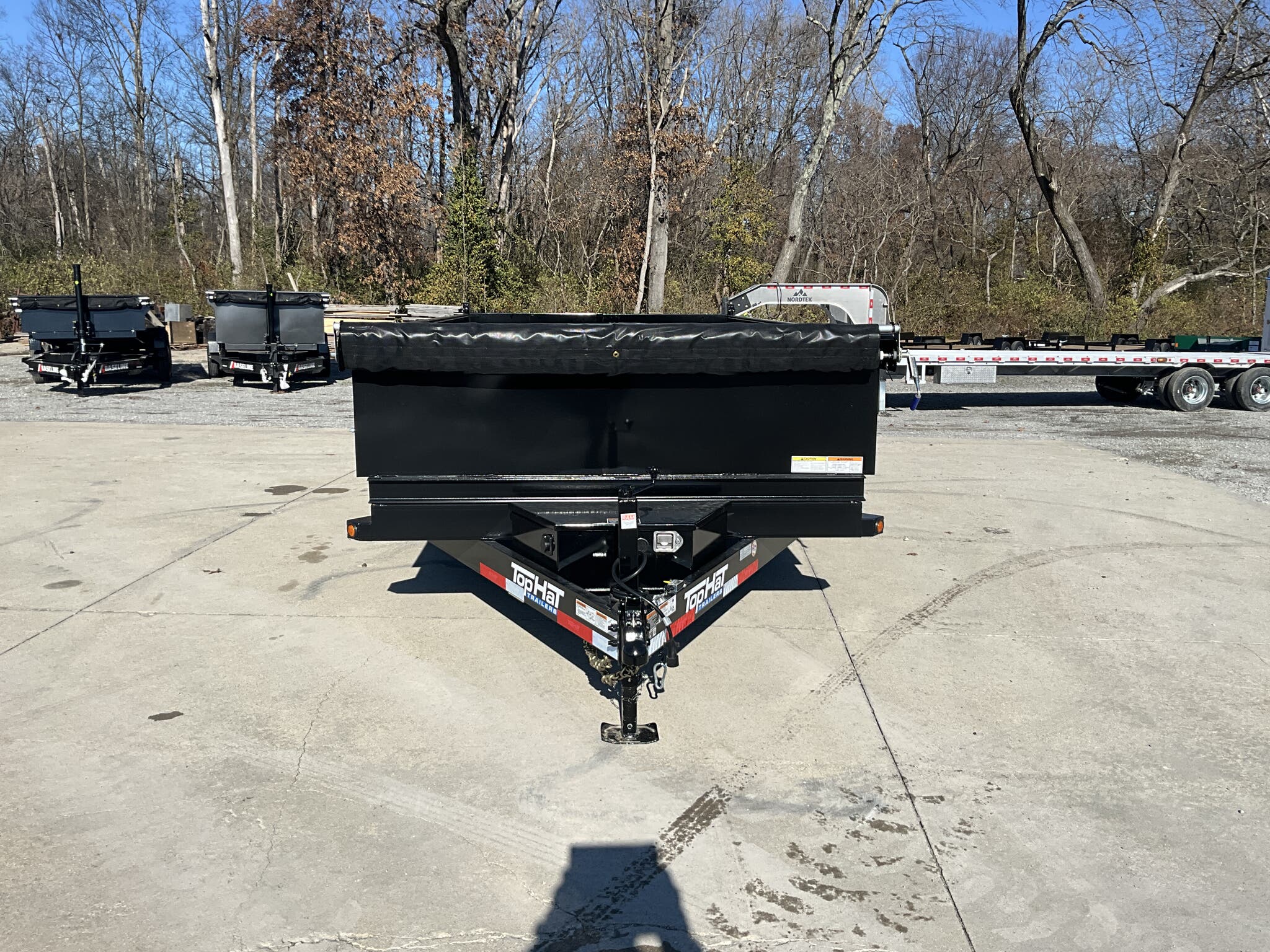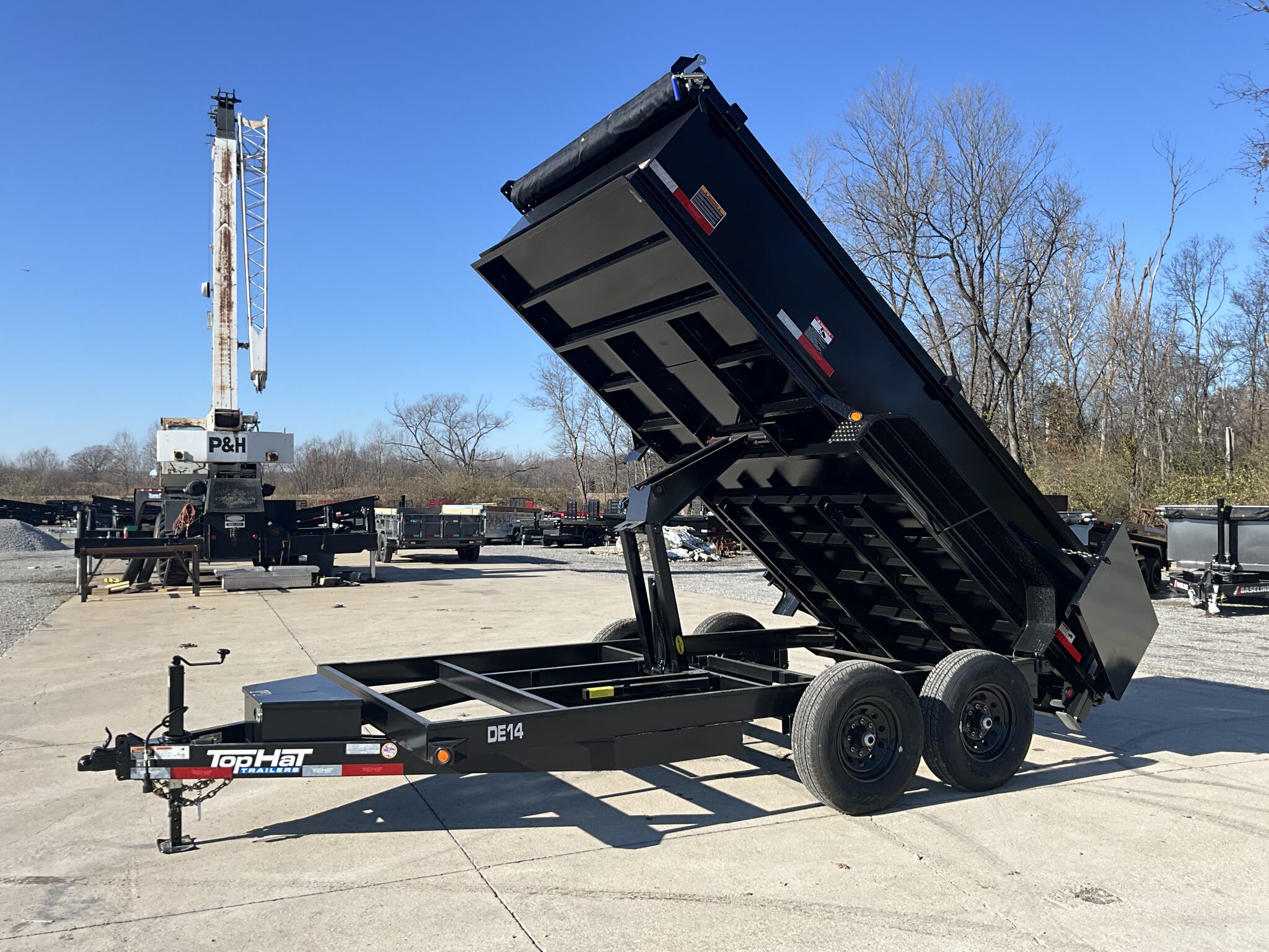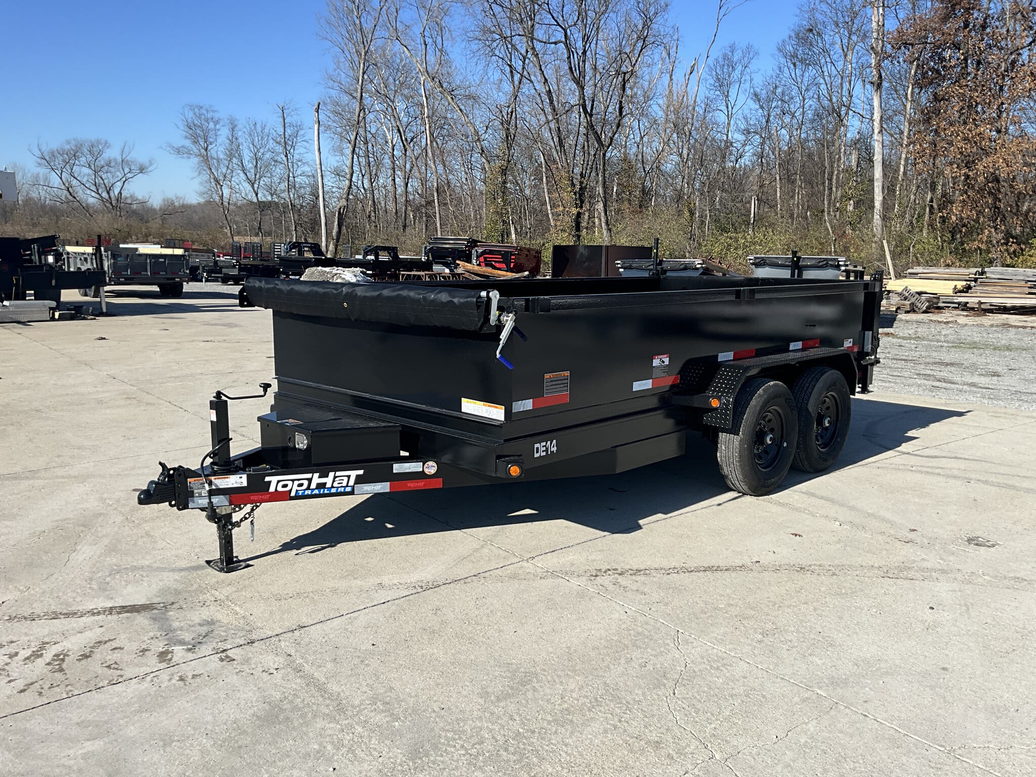 2026 TOP HAT 14' 83" DUMP TRAILER 14,000 lb Axle Capacity, 2' Sides, Scissor Hoist, 6' Slide In Ramps For Sale in Illinois Feature: 516 scissor hoist with power up / power down / gravity down pump Feature: 3 way rear gate (dual swing out & spreader function) Feature: 6' rear slide in ramps with ramp pockets Feature: Tarp kit installed Feature: Rear jack stands Specs Box Size: 14' length; 83" inside width; 24" tall sides Specs Floor: 10 ga steel floor Specs Fenders: 14 ga diamond plate fenders Specs Frame/Construction: Primed & painted underside; heavy duty dump box Specs Axles/Brakes: (2) 7,000 lb Dexter axles; electric brakes Specs Suspension: Multi leaf spring suspension Specs Coupler: 2 5/16" forged adjustable, 5 position Specs Jack: 7,000 lb drop leg jack Specs Tie Downs: (4) 5/8" D rings inside the bed Specs Electrical: Sealed wiring harness; flush mount LED lights; breakaway kit w/ charger Specs Battery/Charger: Deep cycle 12V battery w/ 110V 5 amp charger Specs Pump Box: Lockable battery & pump box Specs Tires/Wheels: ST235/80R16 radial LRE (10 ply) Specs Safety/Equipment: DOT reflective tape; safety prop; spare rack Specs Finish: Black paint Specs Warranty: 1 year Top Hat manufacturer warranty Weights & Capacities Total Axle Capacity: 14,000 lb Weights & Capacities Empty Weight: 4,205 lb Weights & Capacities Payload on Axles: 14,000 4,205 = 9,795 lb Weights & Capacities Tongue Load (10%): 1,400 lb Weights & Capacities Total Payload Including Tongue: 11,195 lb Delivery from 62864 (Lower 48): Up to 100 miles $150 101 300 miles $2.00/mile 301 1200 miles $3.00/mile Over 1200 miles $4.00/mile