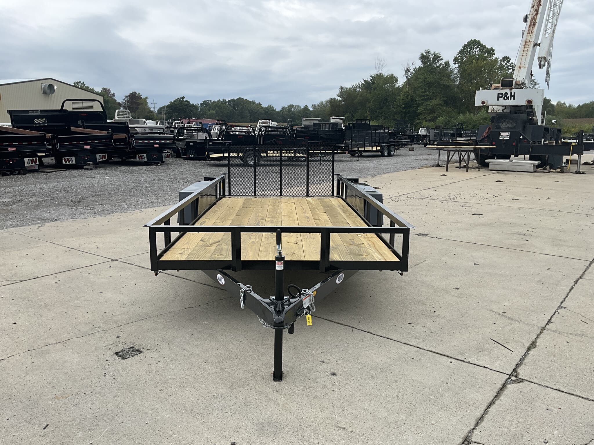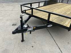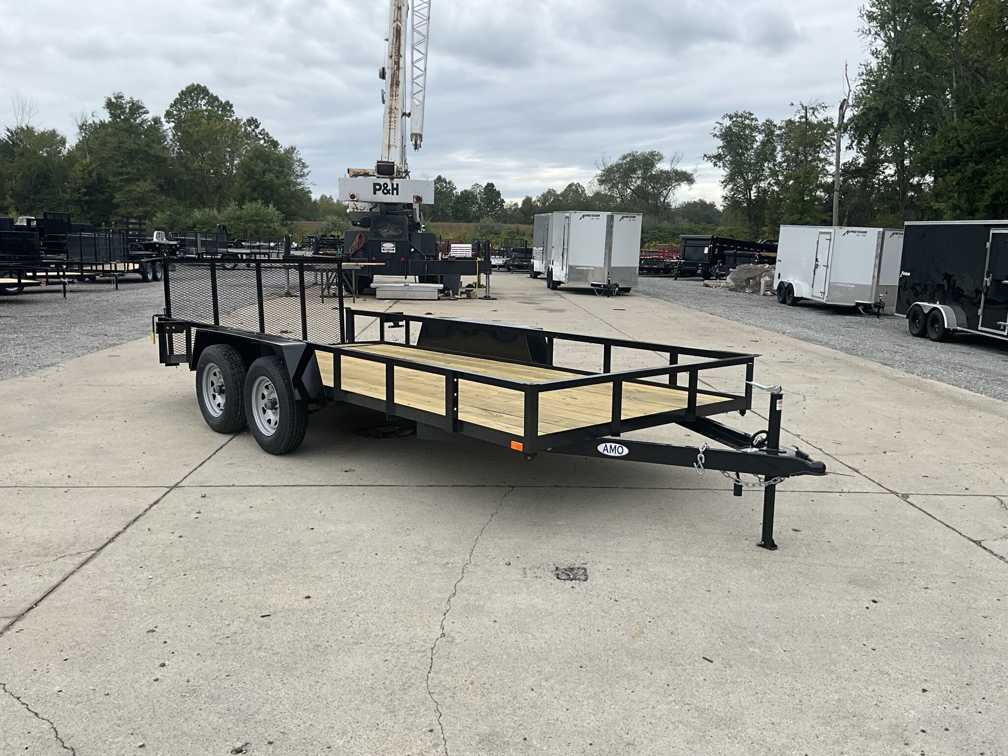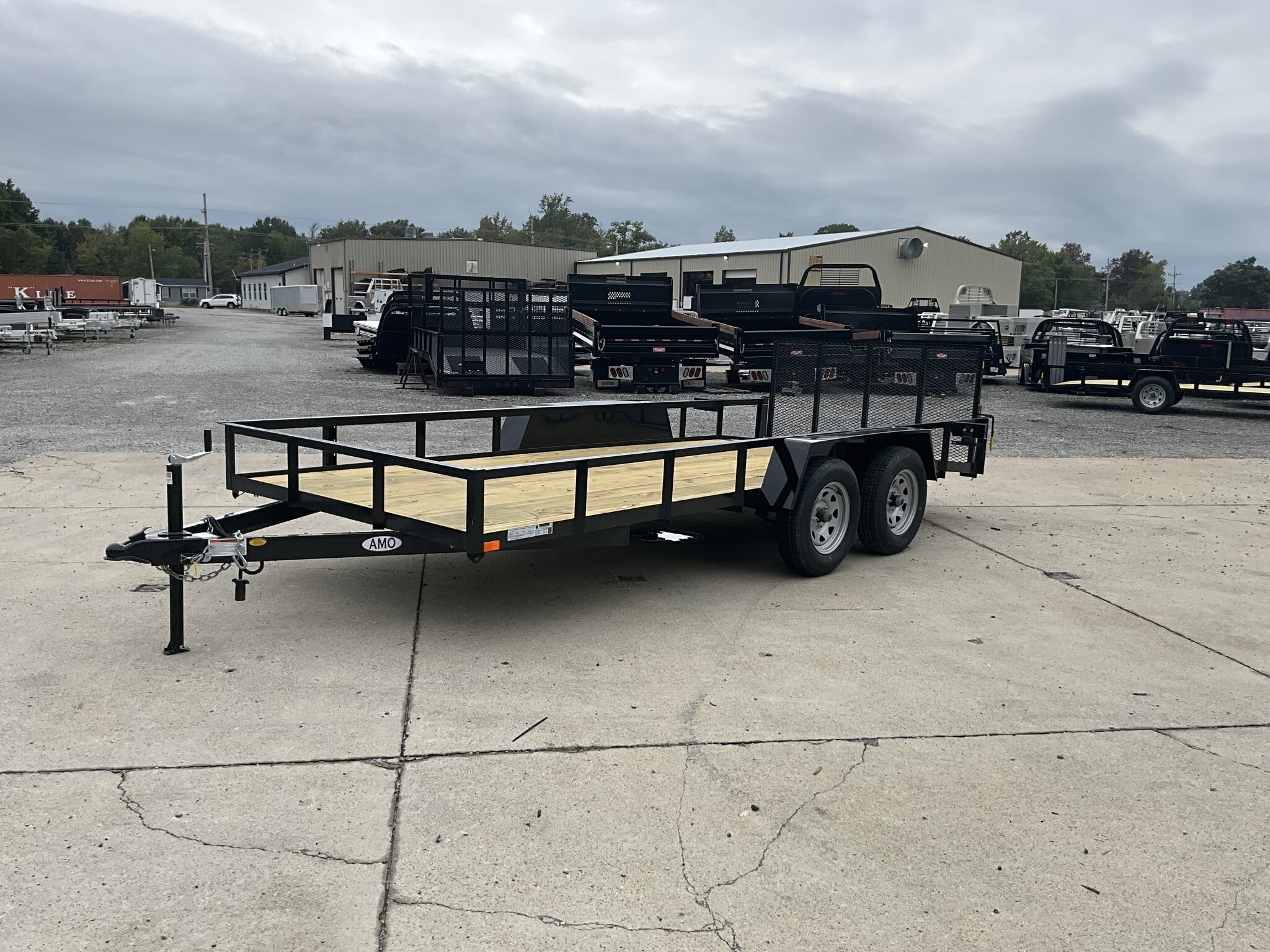 2026 AMO 16 FT X 76 IN UTILITY TRAILER, DOVETAIL AND 3 FT SPRINGLOADED FOLD IN GATE2-3.5K AXLES, ONE ELECTRIC BRAKE, BREAK-AWAY, SPRING SUSPENSION,WRAP TONGE, NEW 15" 6 PLY RADIAL TIRES, REAR 3 FT SPRINGLOADED TAIL GATE, TREATED WOOD FLOOR, 76 INCH WIDE DECK, FRONT CORNER MARKER LIGHTS, PAINTED BLACK, 2-5/16 inch COUPLER WITH A-FRAME JACK, SEVEN WAY TRAILER PLUG, TWO PART PRIMER, URETHANE PAINT, PINLESS GATE LATCH SYSTEM