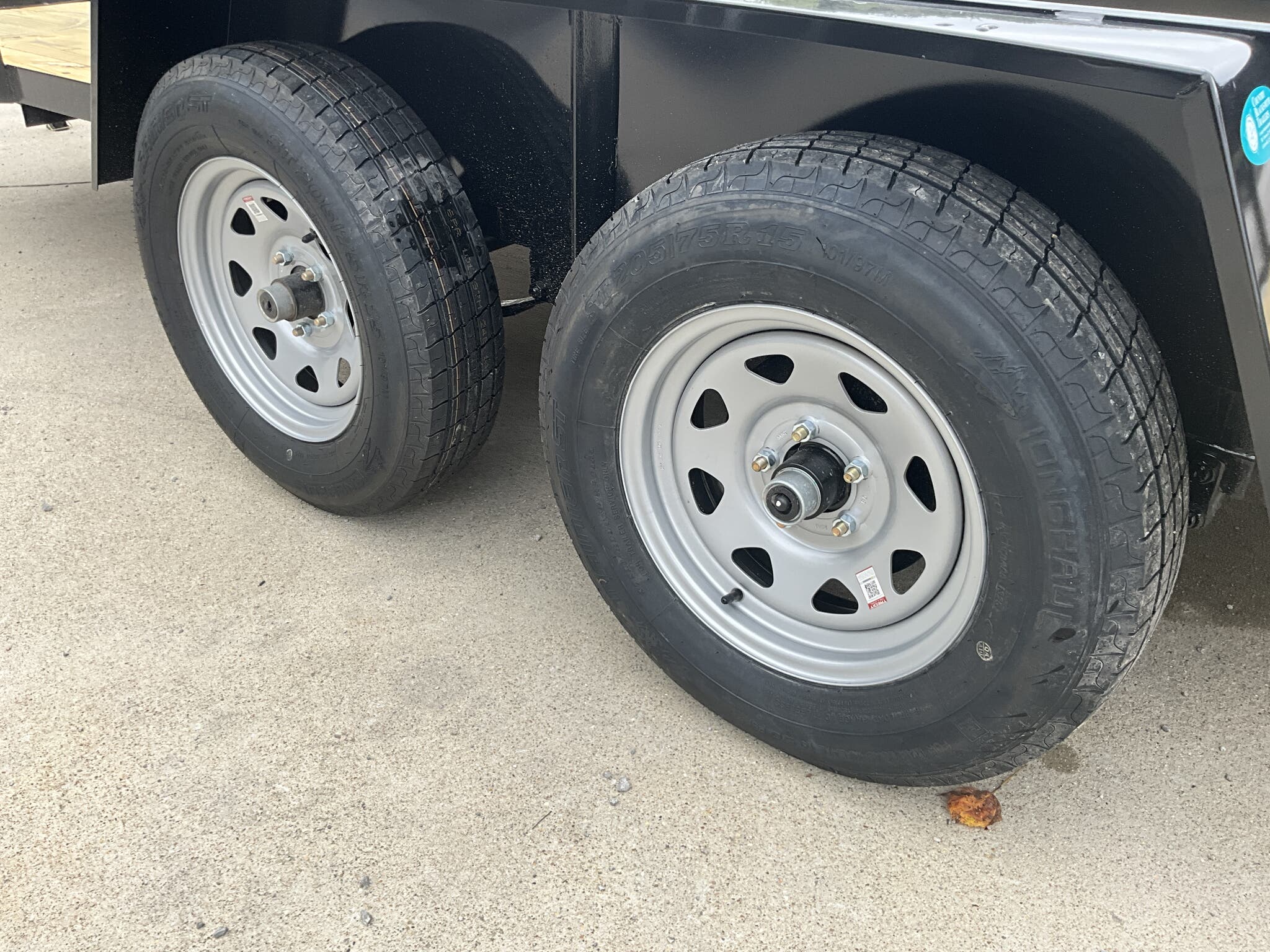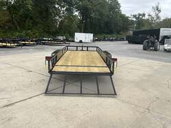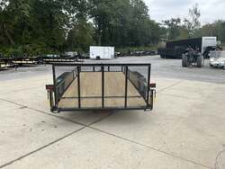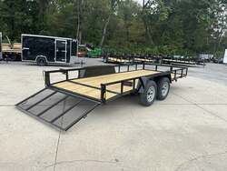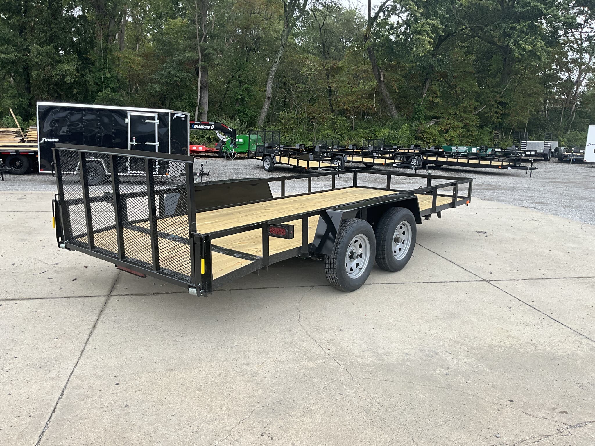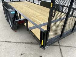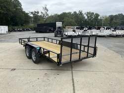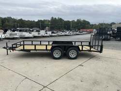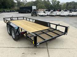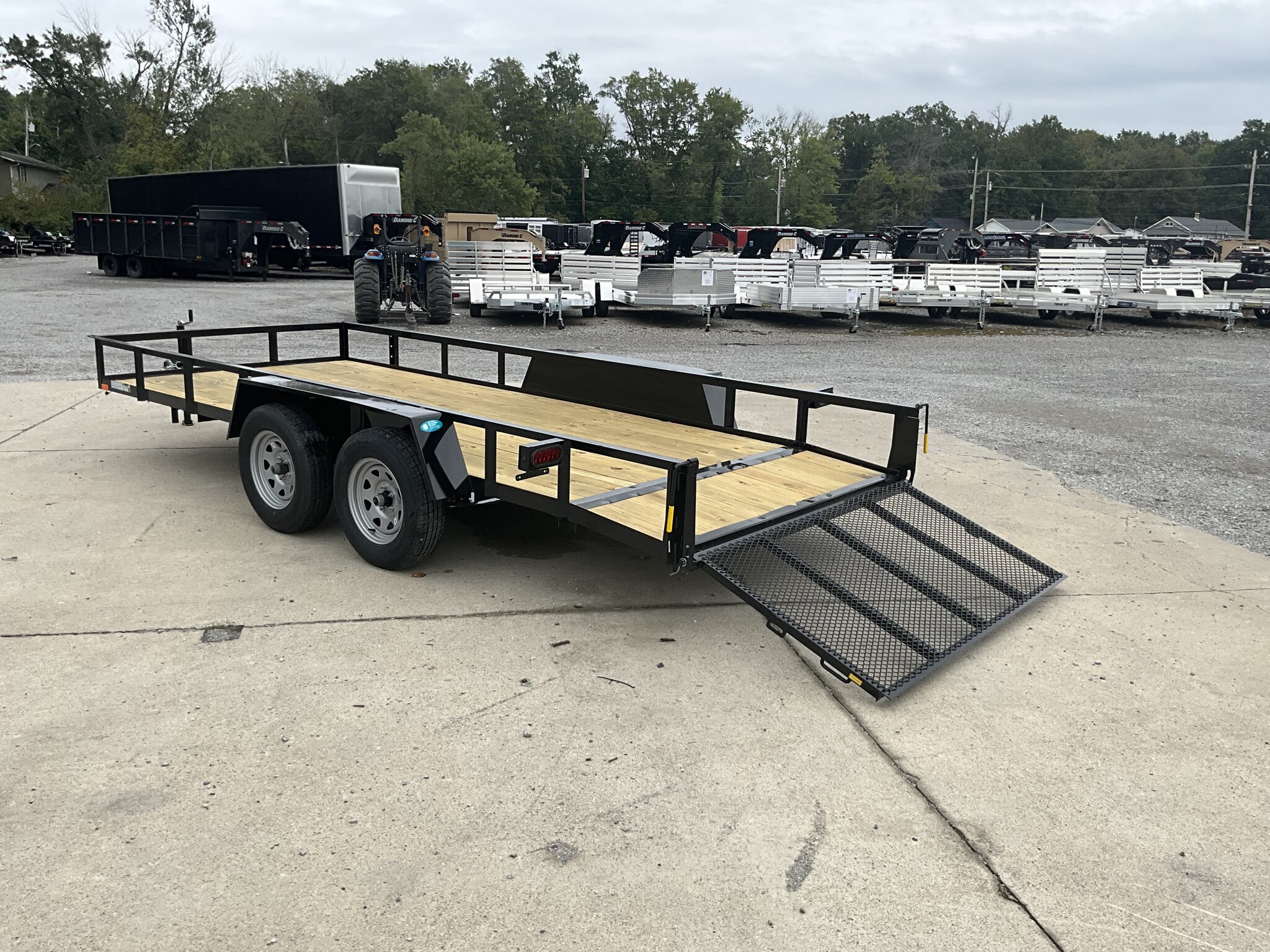 2026 AMO 16 FT X 76 IN UTILITY TRAILER, DOVETAIL AND 3 FT SPRINGLOADED FOLD IN GATE2-3.5K AXLES, ONE ELECTRIC BRAKE, BREAK-AWAY, SPRING SUSPENSION,WRAP TONGE, NEW 15" 6 PLY RADIAL TIRES, REAR 3 FT SPRINGLOADED TAIL GATE, TREATED WOOD FLOOR, 76 INCH WIDE DECK, FRONT CORNER MARKER LIGHTS, PAINTED BLACK, 2-5/16 inch COUPLER WITH A-FRAME JACK, SEVEN WAY TRAILER PLUG, TWO PART PRIMER, URETHANE PAINT, PINLESS GATE LATCH SYSTEM
