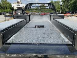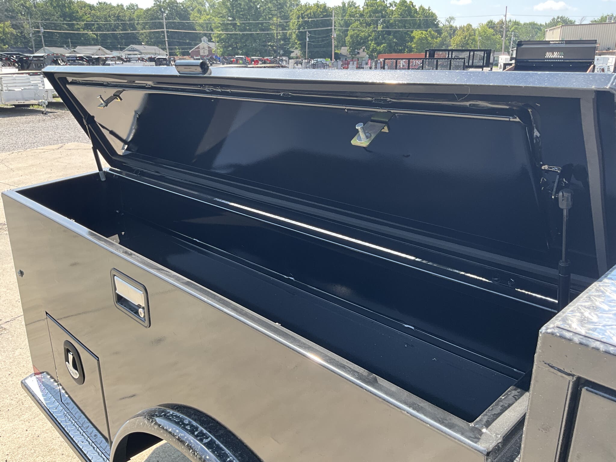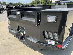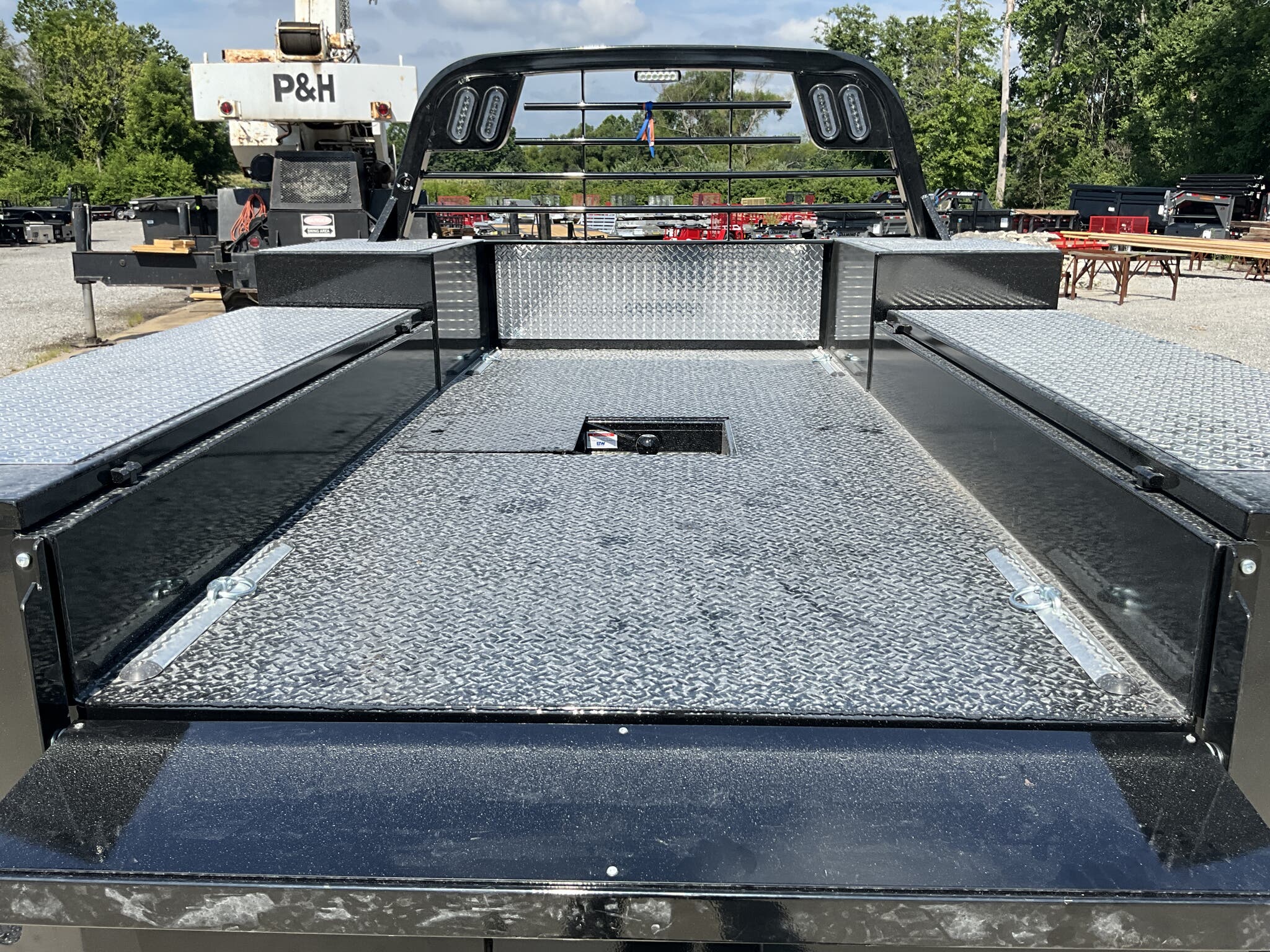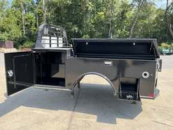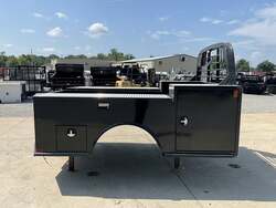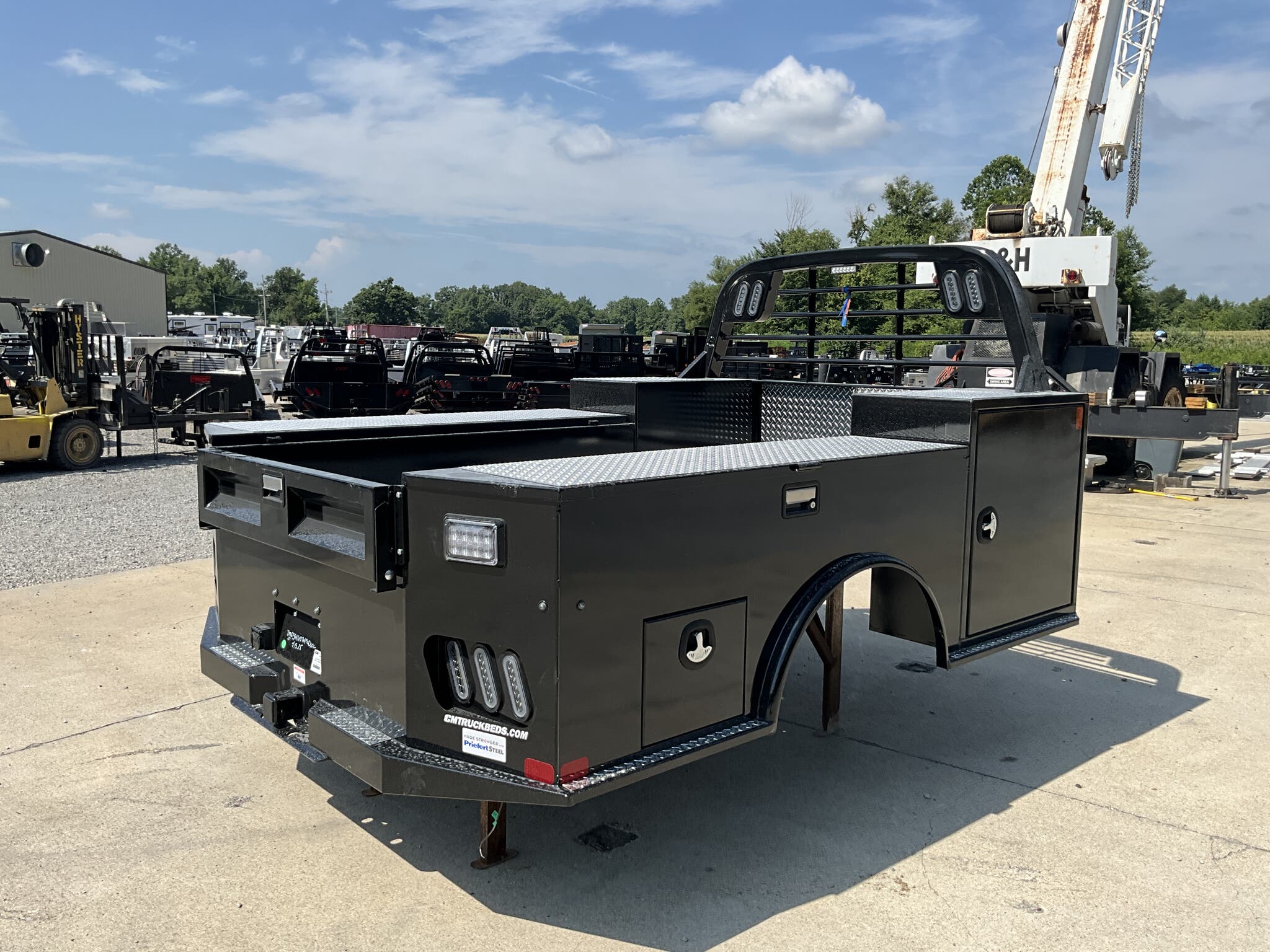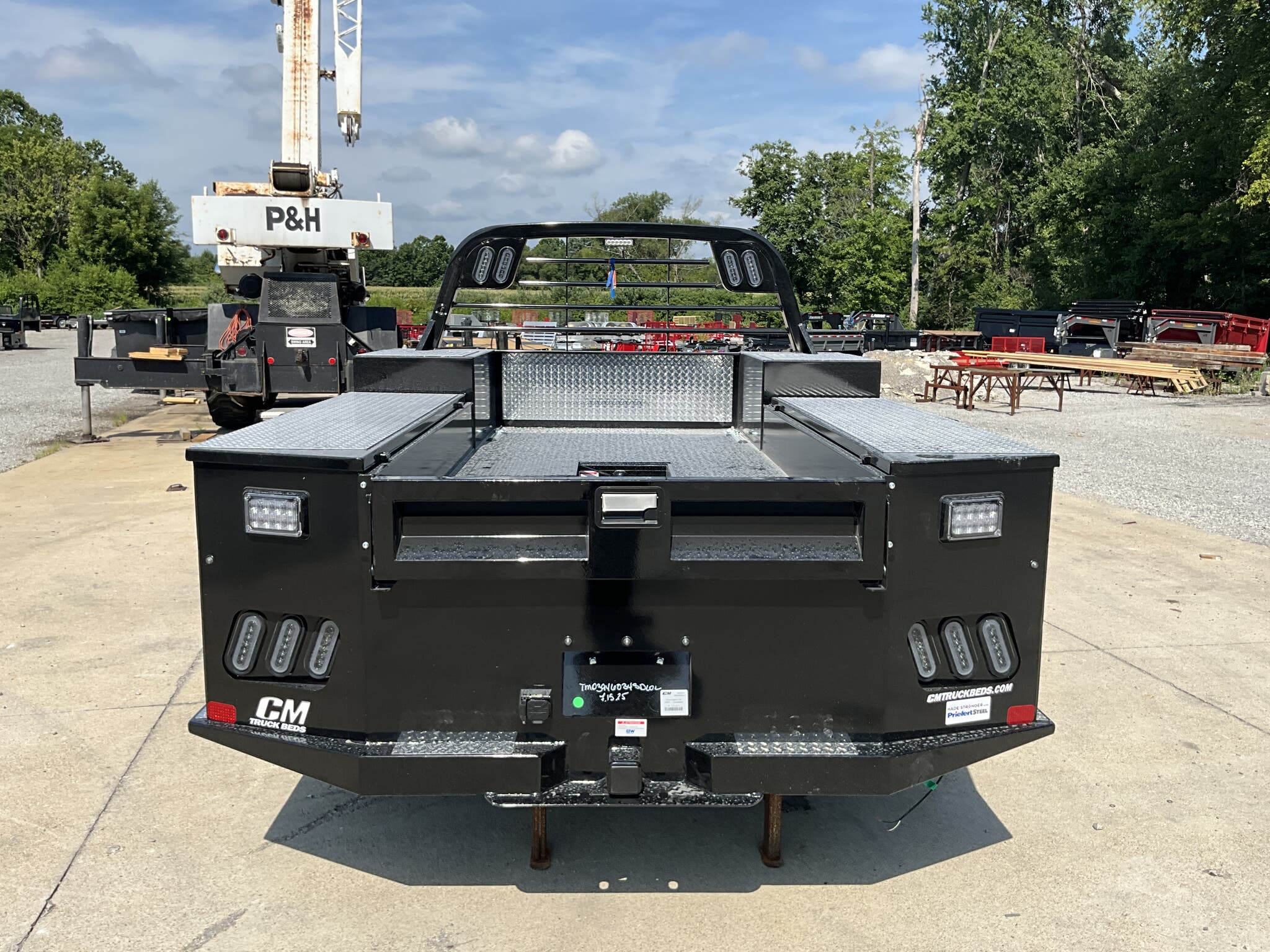 CM TM MODEL CONTRACTOR BED, 112" X 94", 60" CAB TO AXLE, FITS DUAL WHEEL CAB CHASSIS PICKUP WITH 9 FT FRAME, 34 INCH FRAME WIDTH, LED FLUSH MOUNTED TAIL, BRAKE, AND BACK UP LIGHTS, 2 REAR WORK LIGHTS, MODULAR SEALED WIRING HARNESS, 1/8 INCH STEEL TREADPLATE FLOOR, 4 SLIDING FLOOR MOUNT TIE DOWNS, TAPERED REAR CORNERS, DROP DOWN REAR TAILGATE WITH CENTER HANDLE, 18,500 LB RATED B&W BUMPER PULL HITCH, 30,000 LB RATED B&W GOOSENECK HITCH WITH 7-WAY ELECTRICAL PLUG, 2 FRONT LARGE TOOLBOXES (ONE ON EACH SIDE), 2 REAR TOOLBOXES (ONE ON EACH SIDE), ONE LONG UPPER TOOLBOX ON EACH SIDE, BLACK POWDER-COAT FINISH. Please check with us for exact fitment as makes vary slightly.