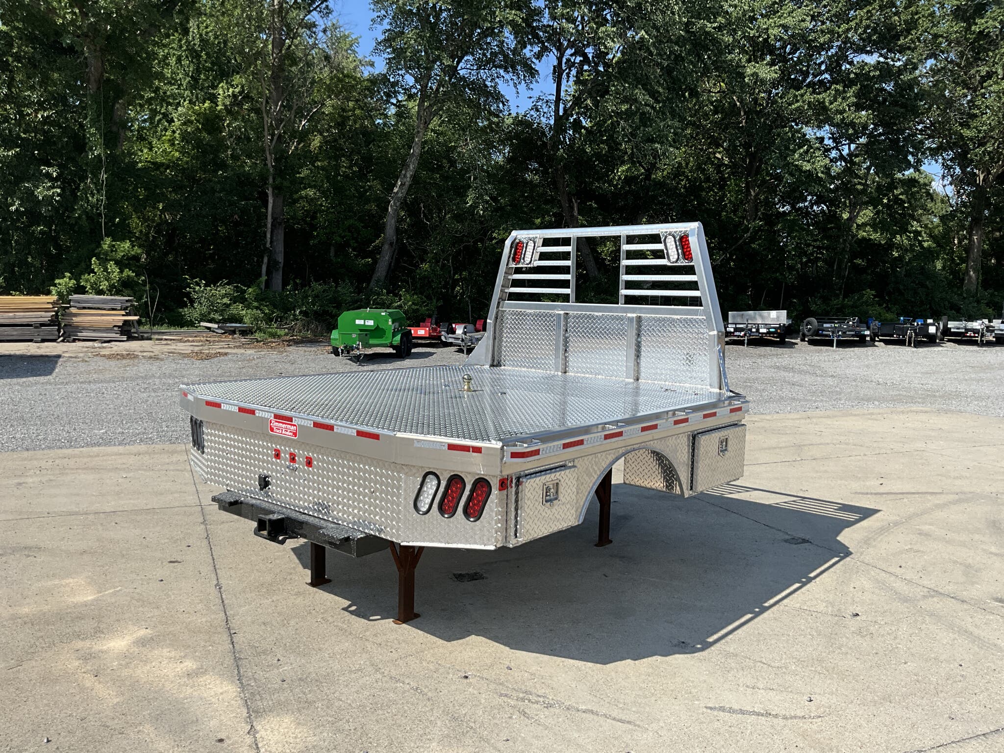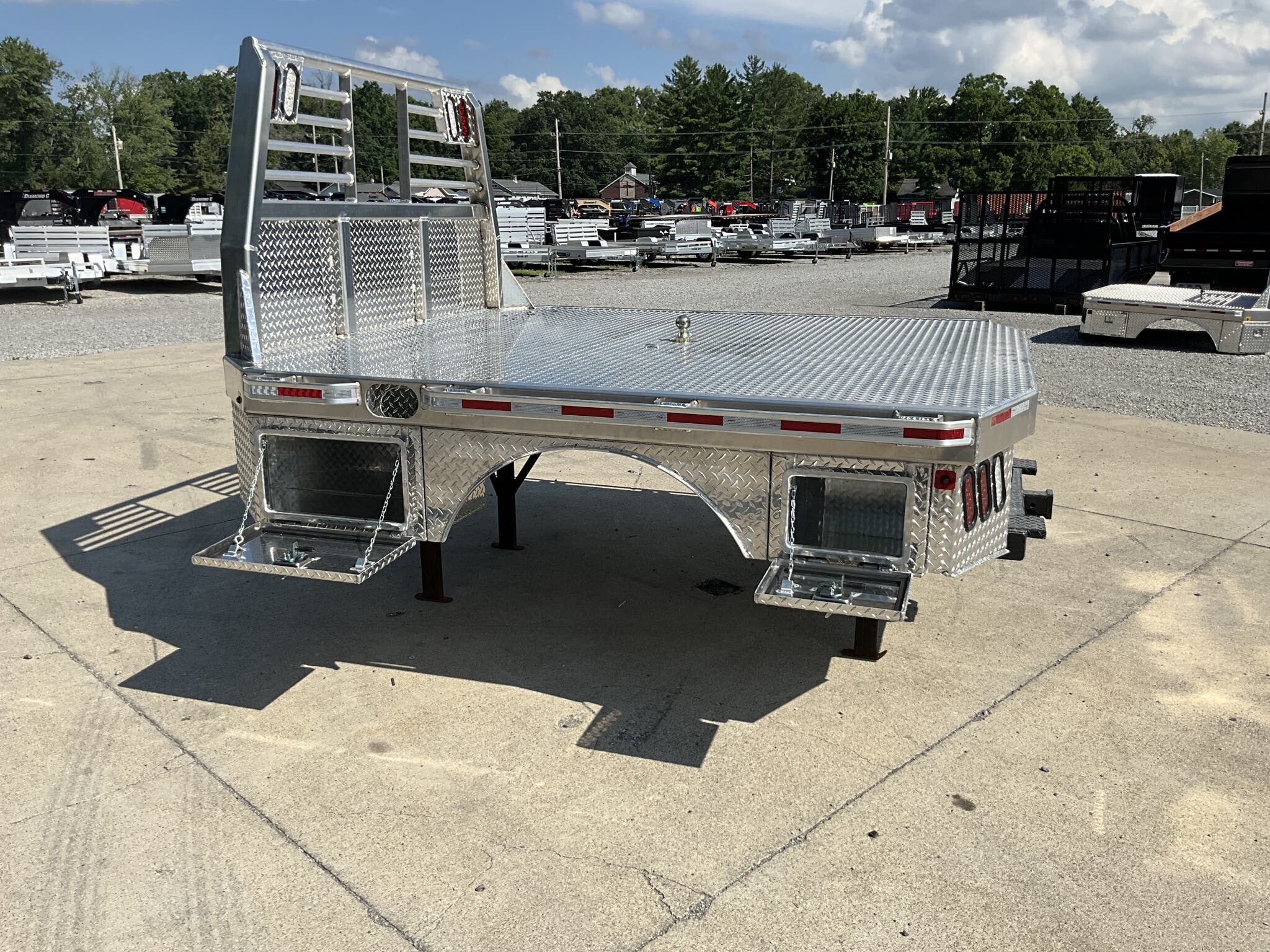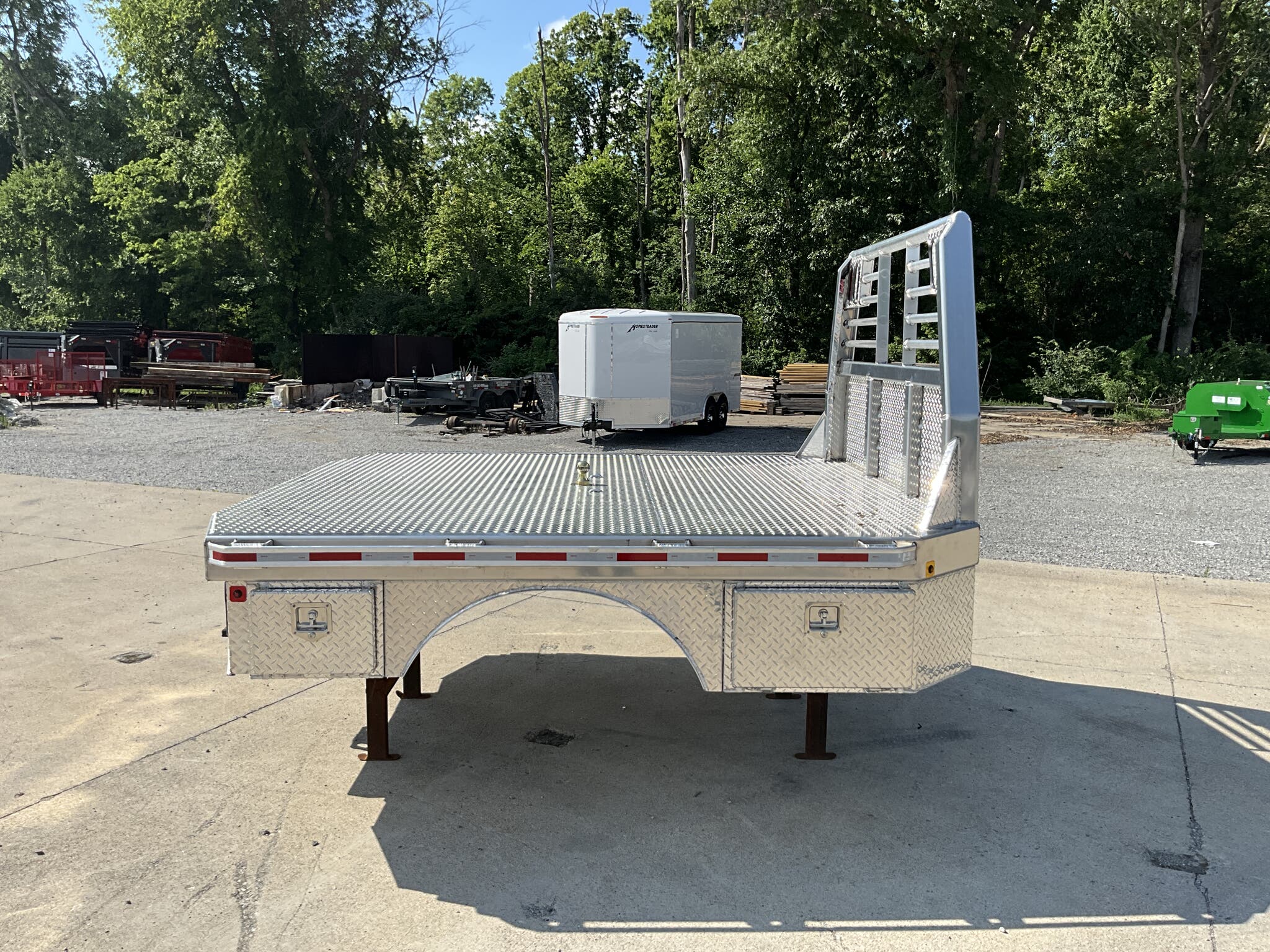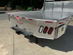 This is a very nice Zimmerman Aluminum 6000XL Flatbed with Built-in Toolboxes and Skirts. Fits a dually wheel bed take off pickup, (56-58" cab to axle truck). Size is 97" x 102" bed. This bed comes with the rear 2-1/2" receiver hitch and B&W Turnover ball gooseneck hitch. (2) 34" aluminum front toolboxes, (2) 16" rear aluminum toolboxes, 1/8" tread plate toolbox construction, aluminum skirts mounted between the toolboxes. This bed comes standard with heavy wall extruded tube frame, 3/16" aluminum tread deck plate, LED lights, heavy front headache rack, stake pockets with rub rails, toolbox mounting brackets, and mud flap mounting brackets. FITS FORD/DODGE/GMC DUAL WHEEL LONG BED TAKEOFF TRUCK