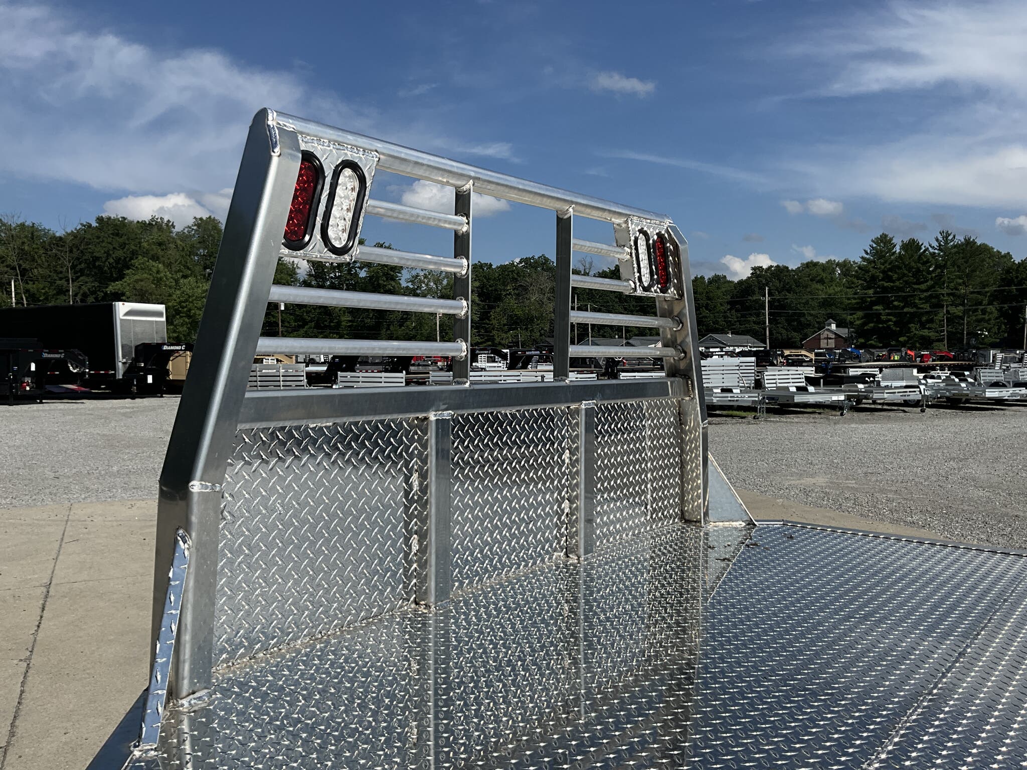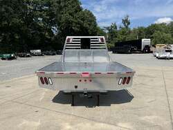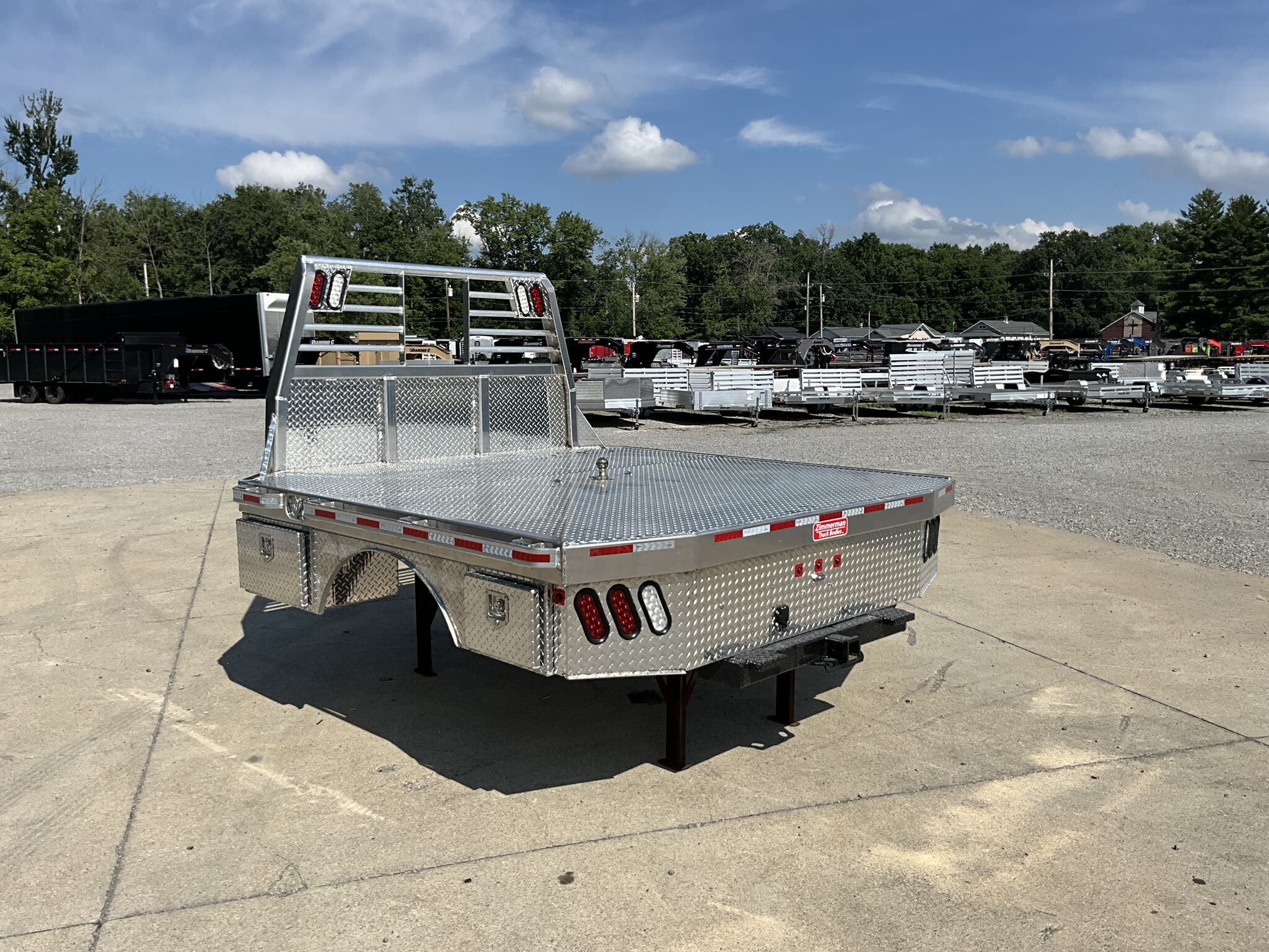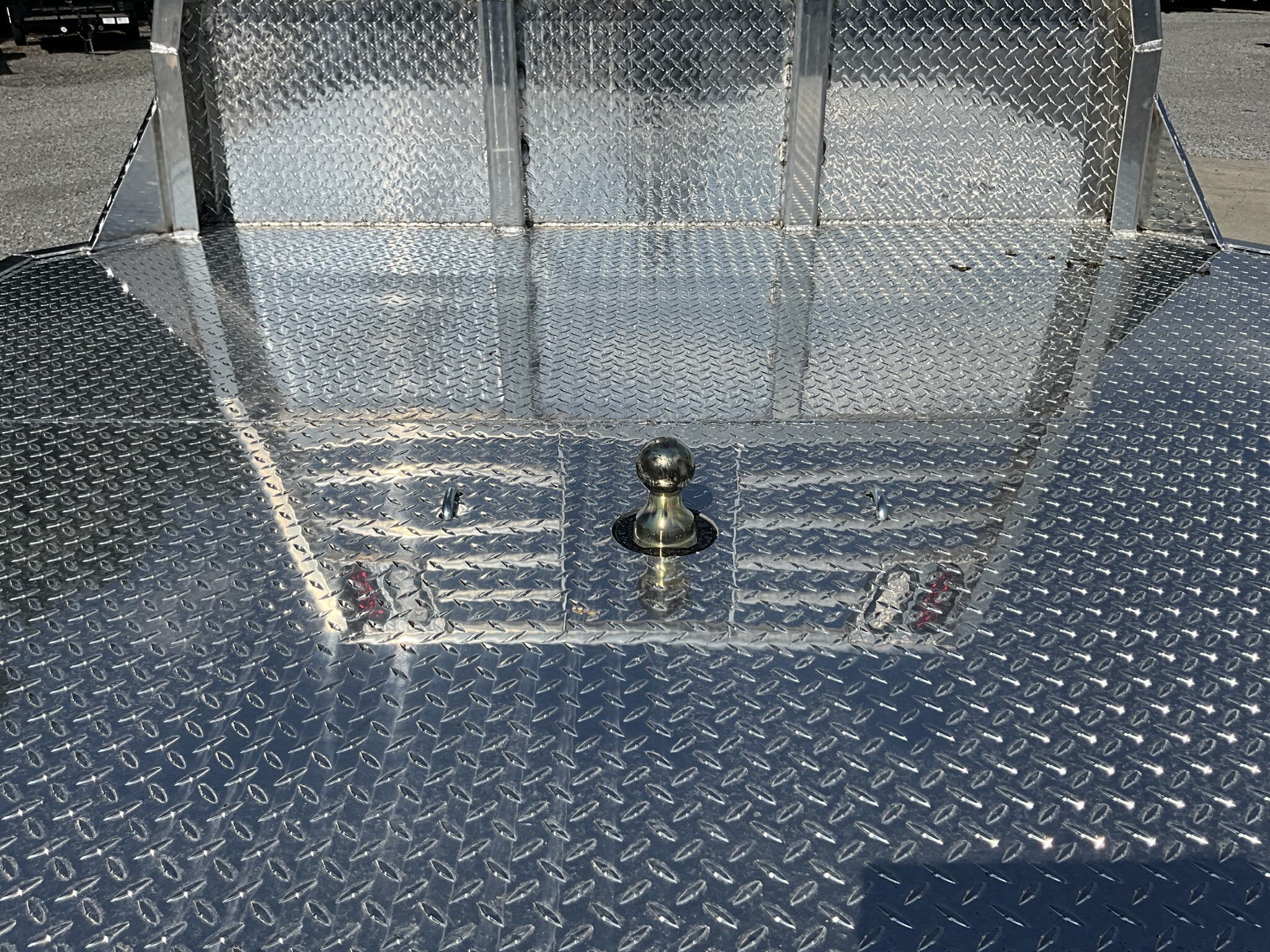 This is a very nice Zimmerman Aluminum 6000XL Flatbed with Built-in Toolboxes and Skirts. Fits a dually wheel bed take off pickup, (56-58" cab to axle truck). Size is 97" x 102" bed. This bed comes with the rear 2-1/2" receiver hitch and B&W Turnover ball gooseneck hitch. (2) 34" aluminum front toolboxes, (2) 16" rear aluminum toolboxes, 1/8" tread plate toolbox construction, aluminum skirts mounted between the toolboxes. This bed comes standard with heavy wall extruded tube frame, 3/16" aluminum tread deck plate, LED lights, heavy front headache rack, stake pockets with rub rails, toolbox mounting brackets, and mud flap mounting brackets. FITS FORD/DODGE/GMC DUAL WHEEL LONG BED TAKEOFF TRUCK