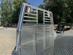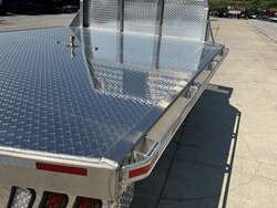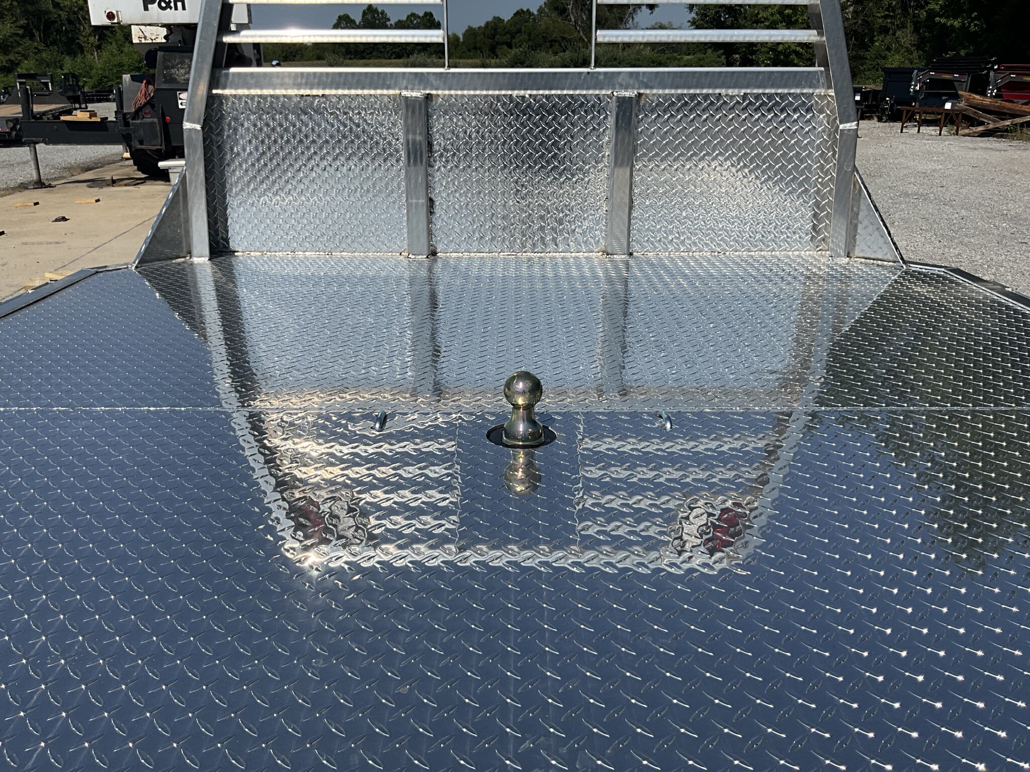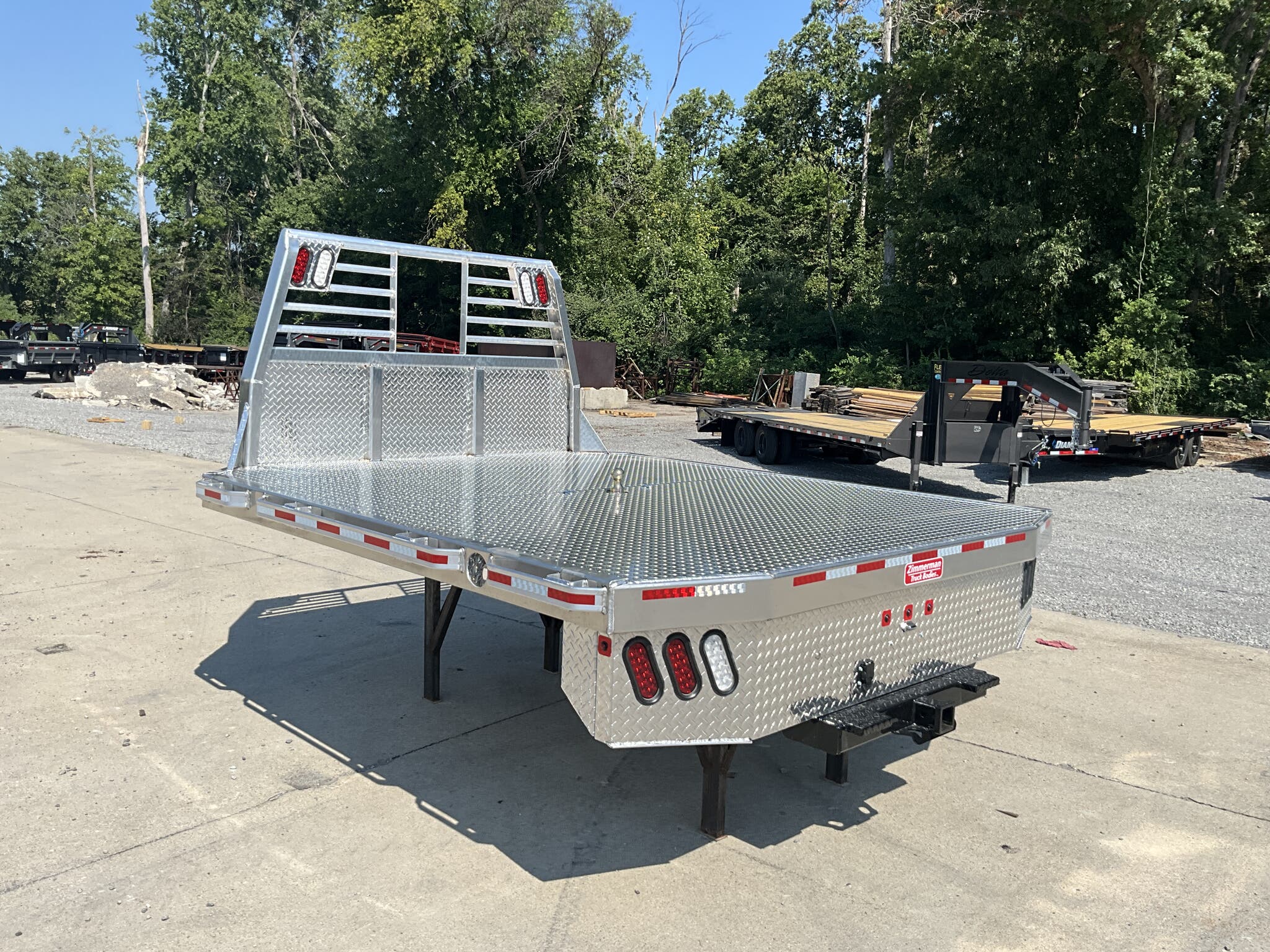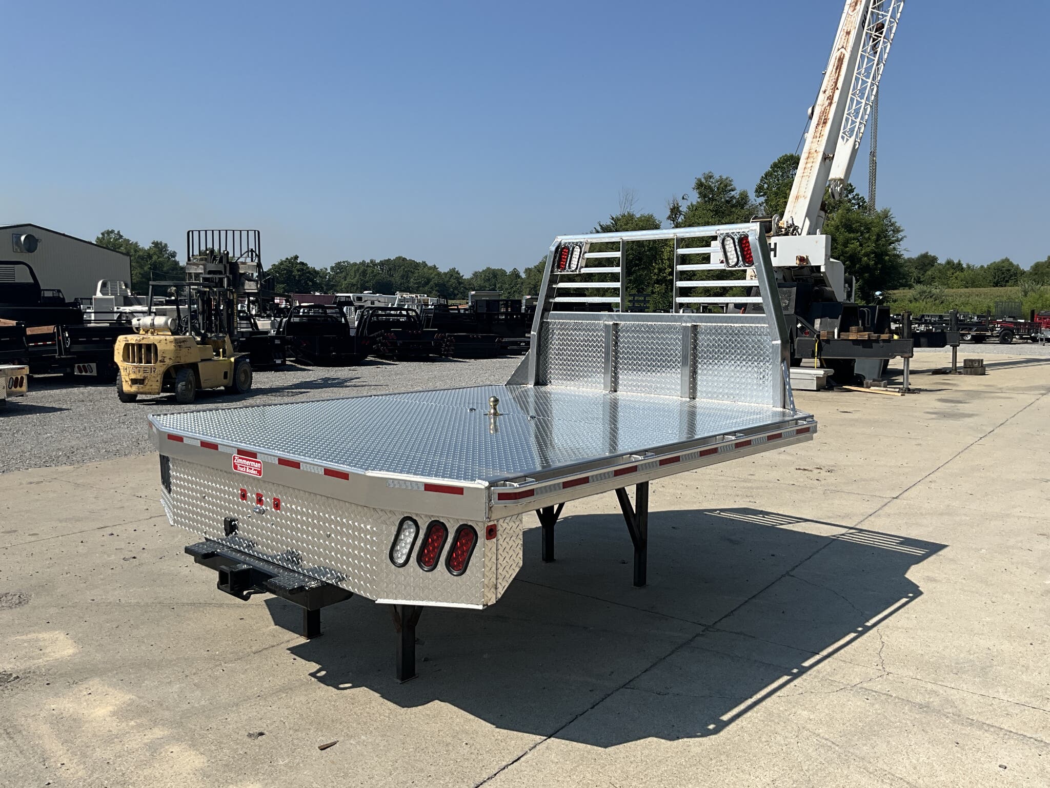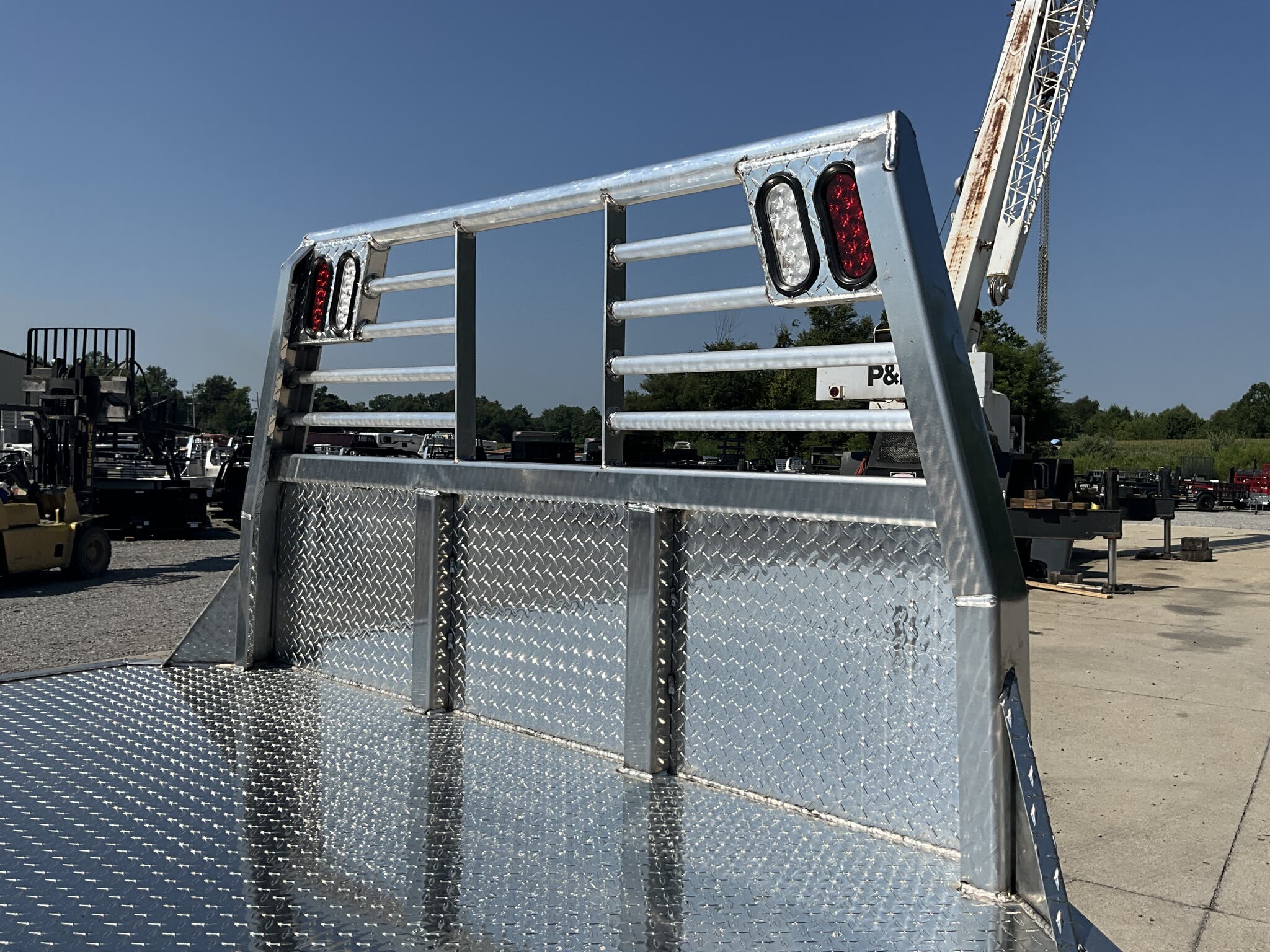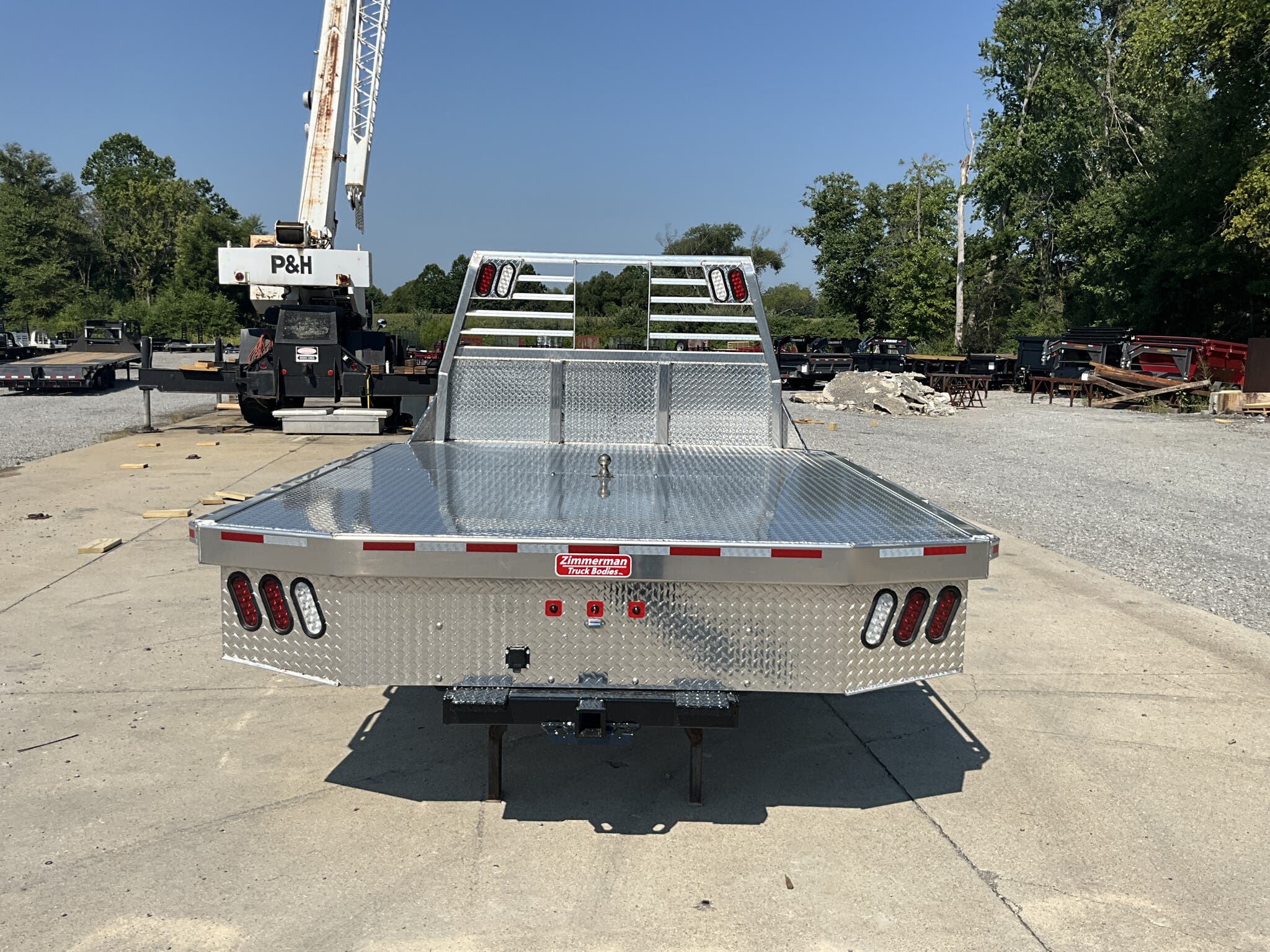 This is a very nice Zimmerman Aluminum 6000XL Flatbed for a Dual Wheel Cab and Chassis Pickup Truck, (60" Inch cab to axle truck). Size is 97 inch x 114 inch bed. This bed comes with a rear receiver hitch and a 30,000 lbs rated B&W Turnover ball gooseneck hitch. This bed comes standard with heavy wall C type aluminum channel around the perimeter, 3/16" aluminum tread deck plate, double 4" steel channel main frame, steps by the rear receiver hitch, 7-way round electric plug, LED lights, sealed wiring harness, welded headache rack, stake pockets with rub rails, toolbox mounting brackets, and mud flap mounting brackets.
